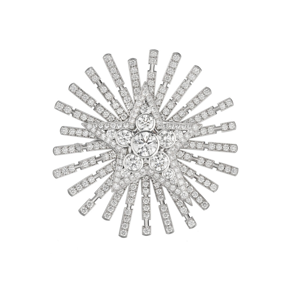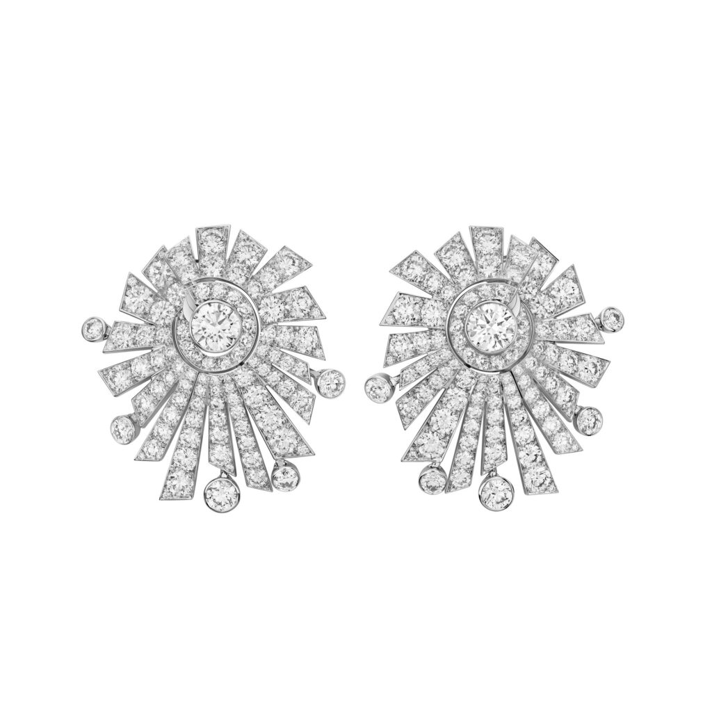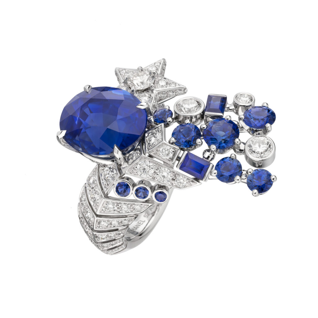 En revisitant le passé pour mieux se projeter dans le futur, le Studio de Création Joaillerie de CHANEL invente des bijoux vivants, en osmose avec le rythme aléatoire des mouvements du corps. 77 créations spectaculaires, dont 12 transformables, s’enroulent et se posent librement sur la peau en un corps à corps céleste. Des volutes étoilées s’articulent à l’envi pour une envolée unique autour du poignet. Les battements du cœur à chaque inspiration font vibrer le soleil à la naissance du cou. En les portant comme bon leur semble, les femmes décident d’une façon qui n’appartient qu’à elles de prolonger la course des comètes le long de la peau. Saphirs bleus comme la nuit, diamants jaunes comme le feu du soleil ou d’un bleu intense, opales denses comme une galaxie, rubis au rouge vital, spinelles éclatants comme l’aube, tanzanites couleur du ciel… Si la collection originelle était presque intégralement immaculée, concentré de lumière pure, 1932 fait la part belle aux pierres de couleurs.