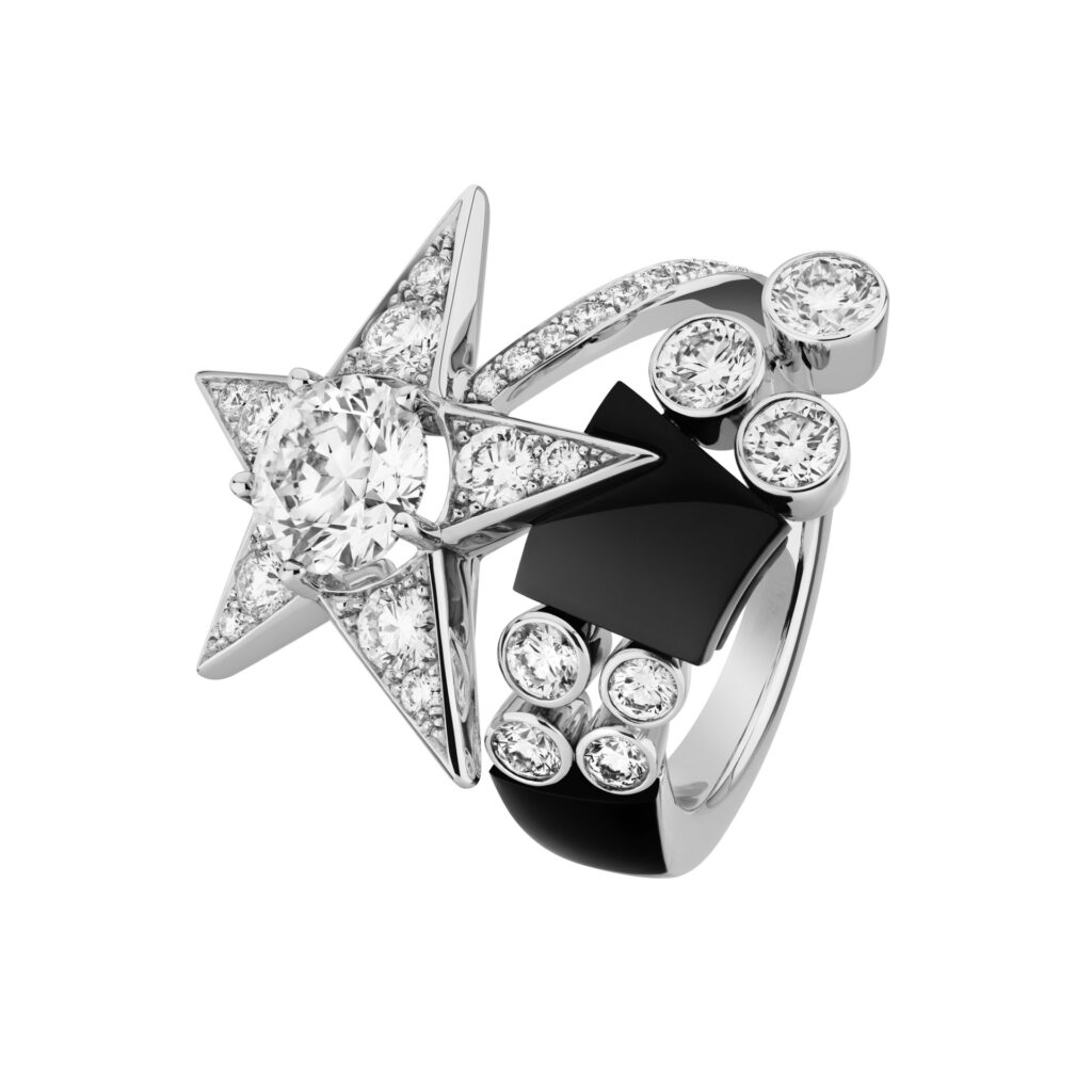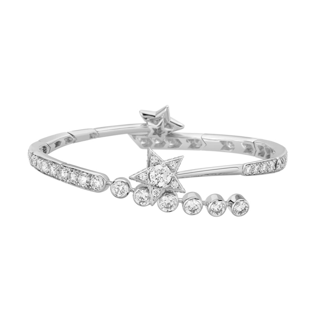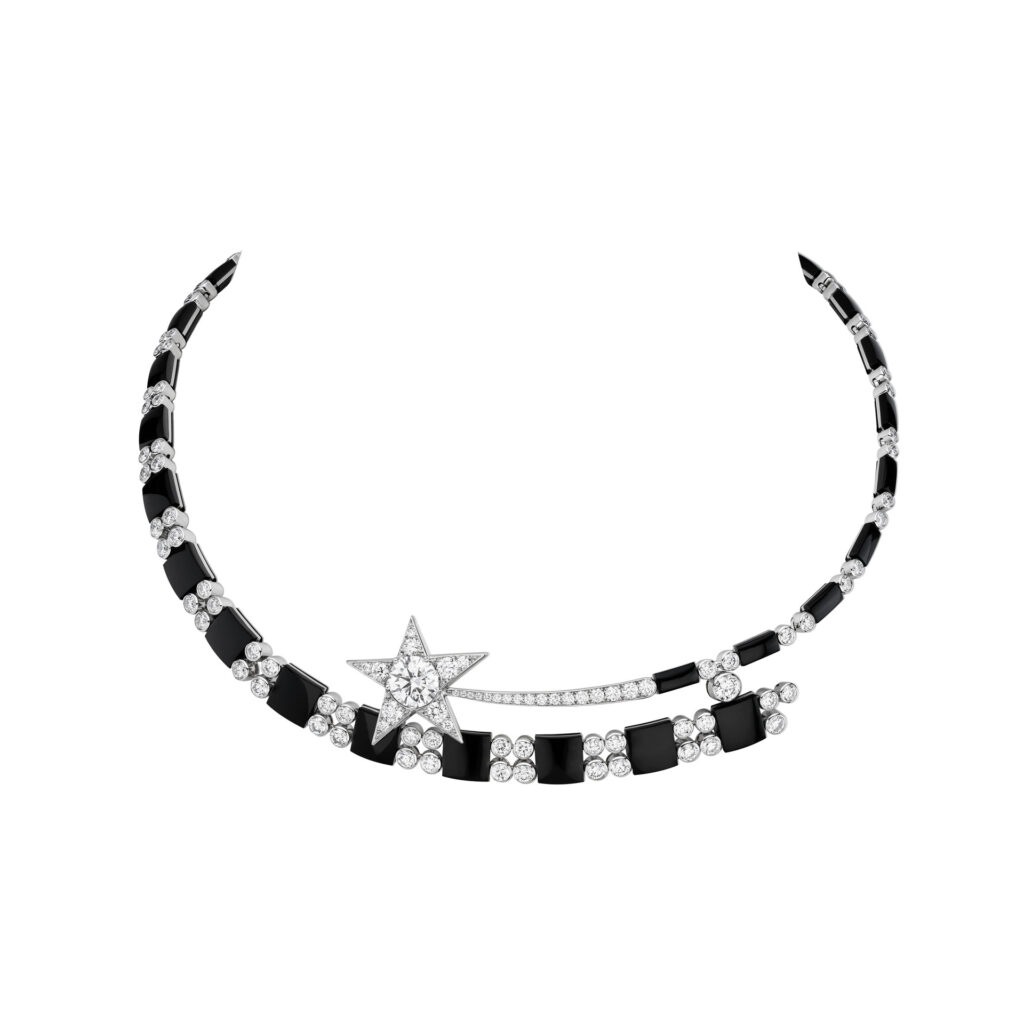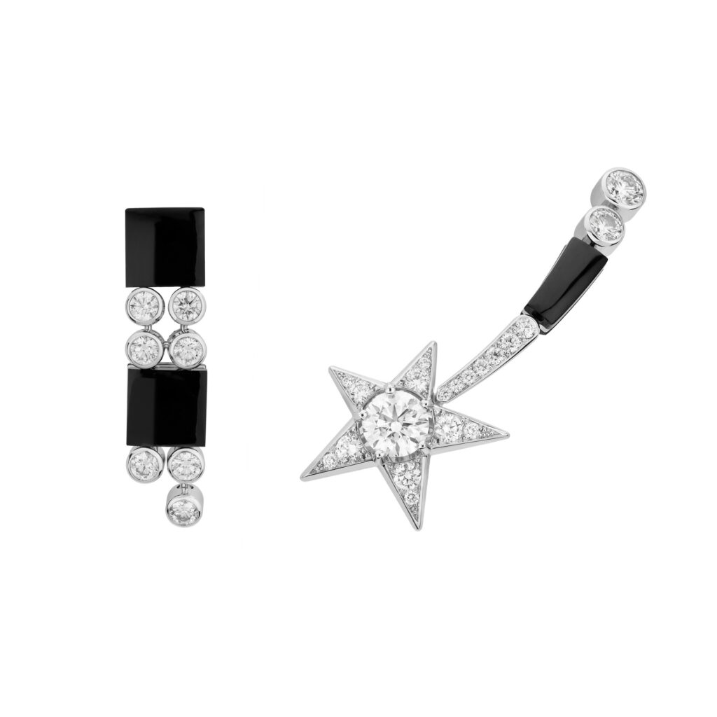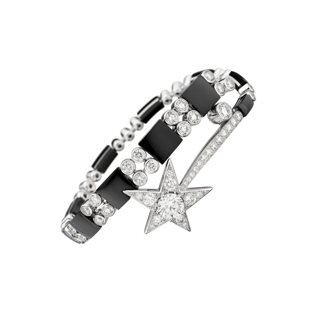 Reprenant l’épure du bracelet Harmonie de « Bijoux de Diamants », le collier, le bracelet, les boucles d’oreille et la bague « Comète Harmonie » sont des étoiles filantes, les seules en noir et blanc si chers à Mademoiselle Chanel.