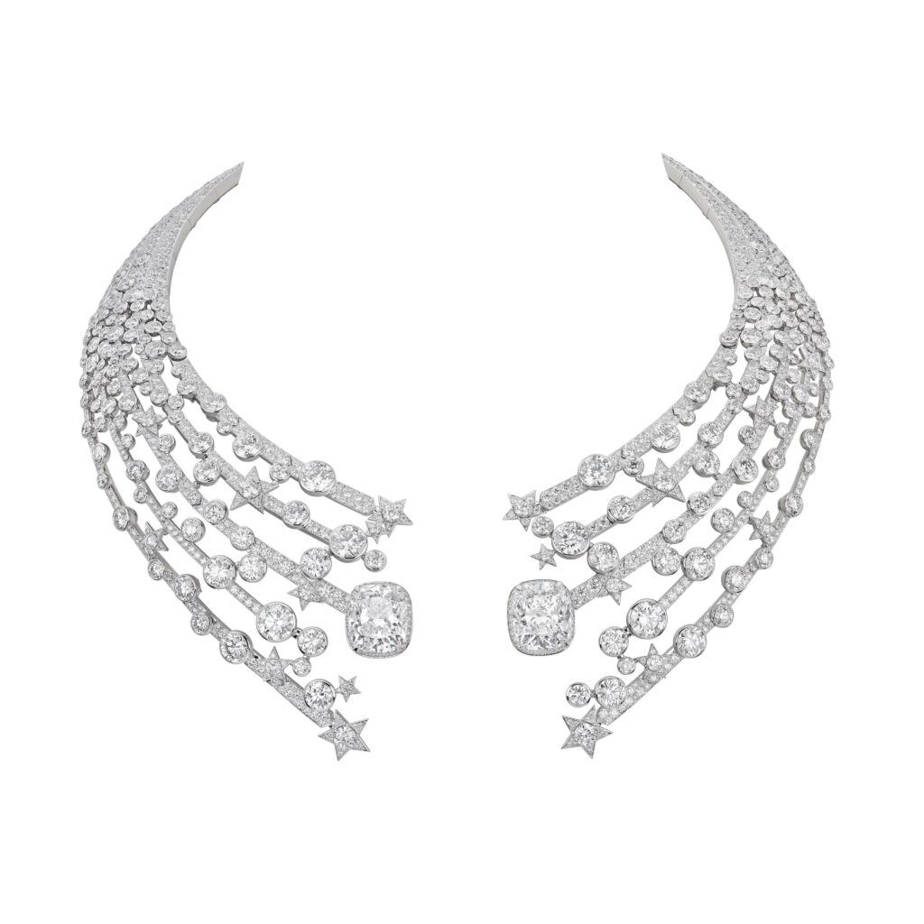 Libéré de tout fermoir, le collier « Comète Constellation » se porte ouvert, à même la peau. Ses deux diamants D FL Type Ila de 10,08 carats chacun, se détachent et se portent en bague, pour être remplacés par deux comètes.