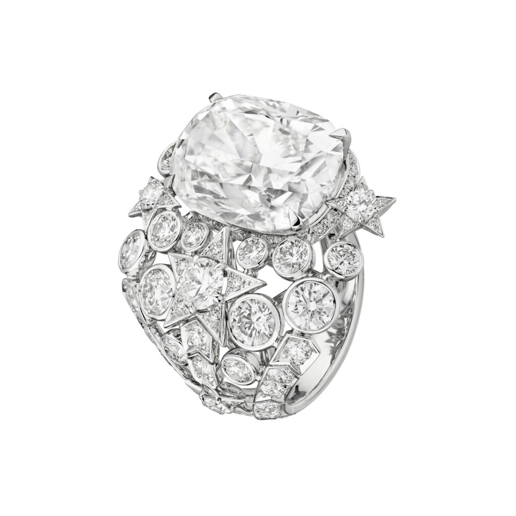 La bague « Comète Constellation » surmonte le doigt d’un exceptionnel diamant coussin D IF Type Ila de 14,52 carats.
