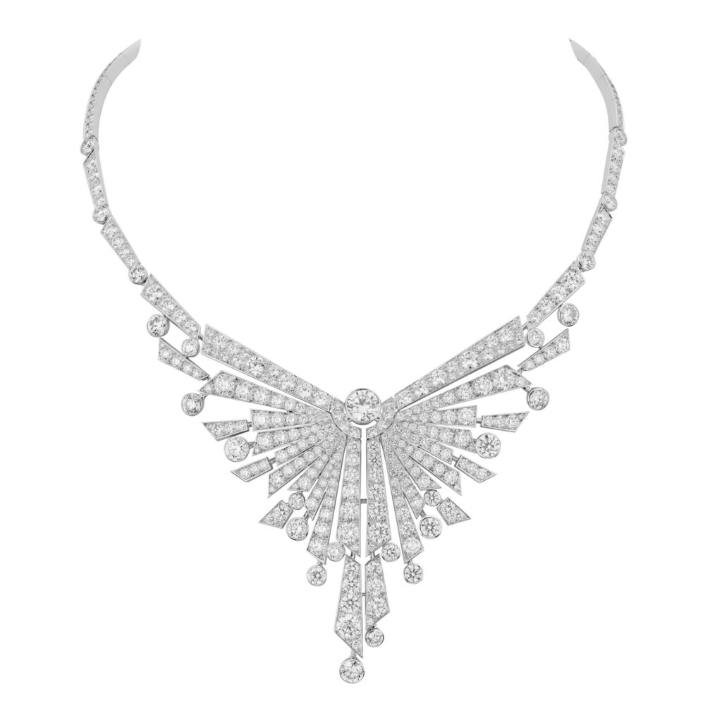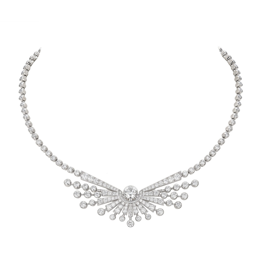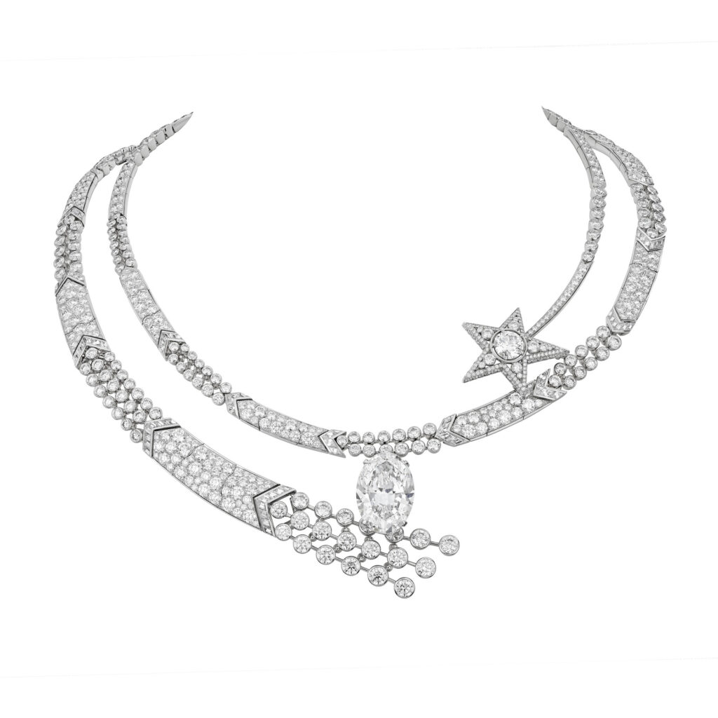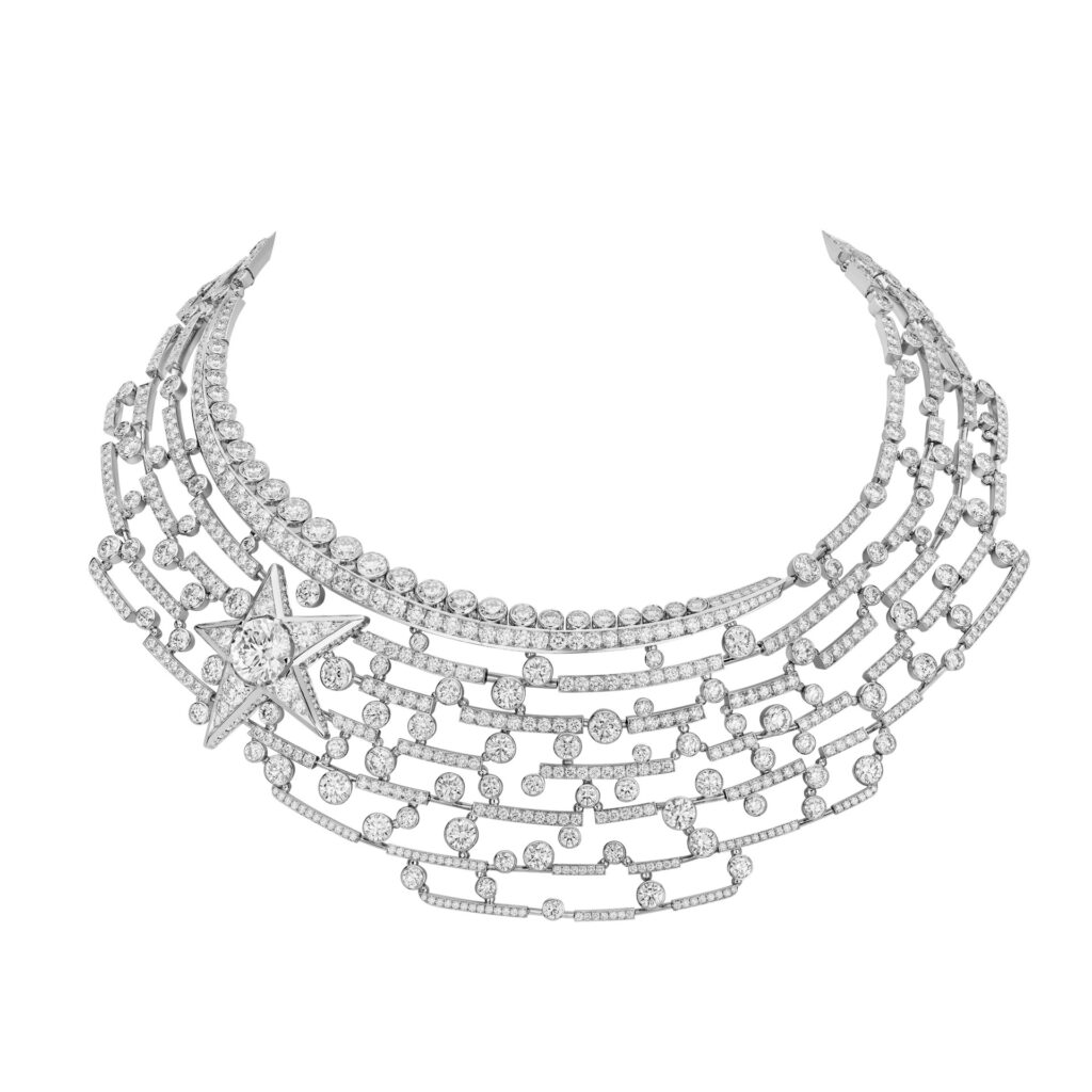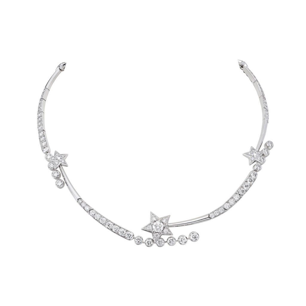 Le collier « Allure Céleste », pièce emblématique de la collection, est un voyage au cœur de la lumière, celle qui émane des astres pour les lier les uns aux autres dans l’immensité du ciel.