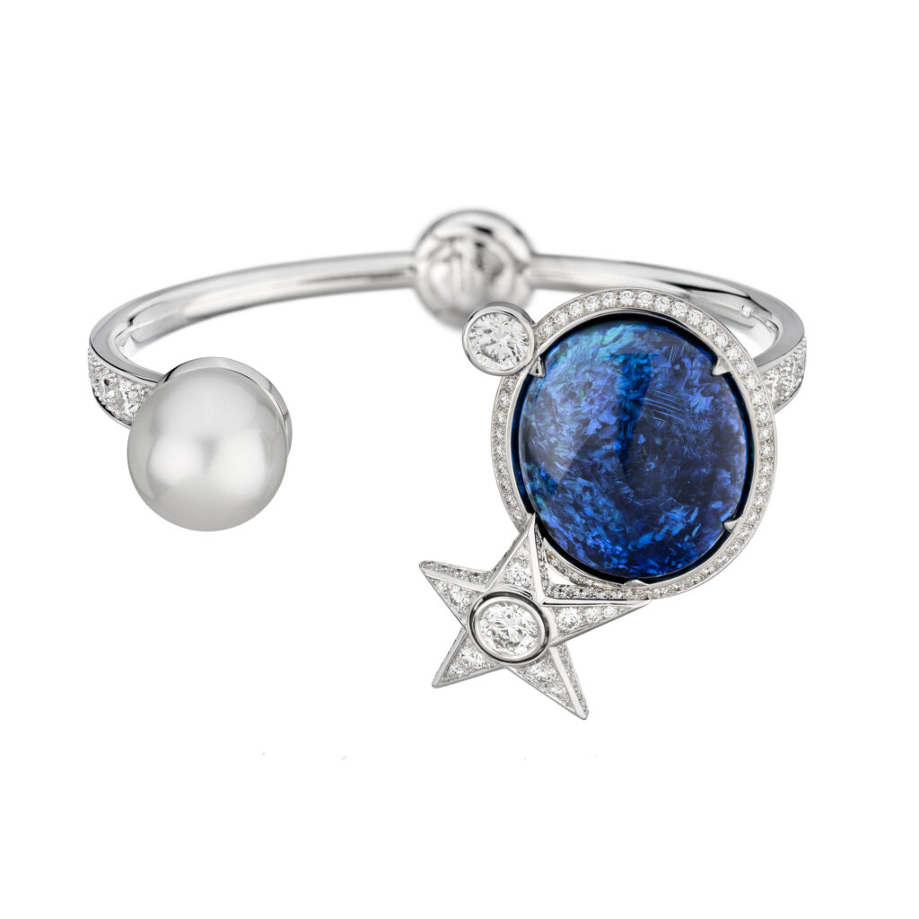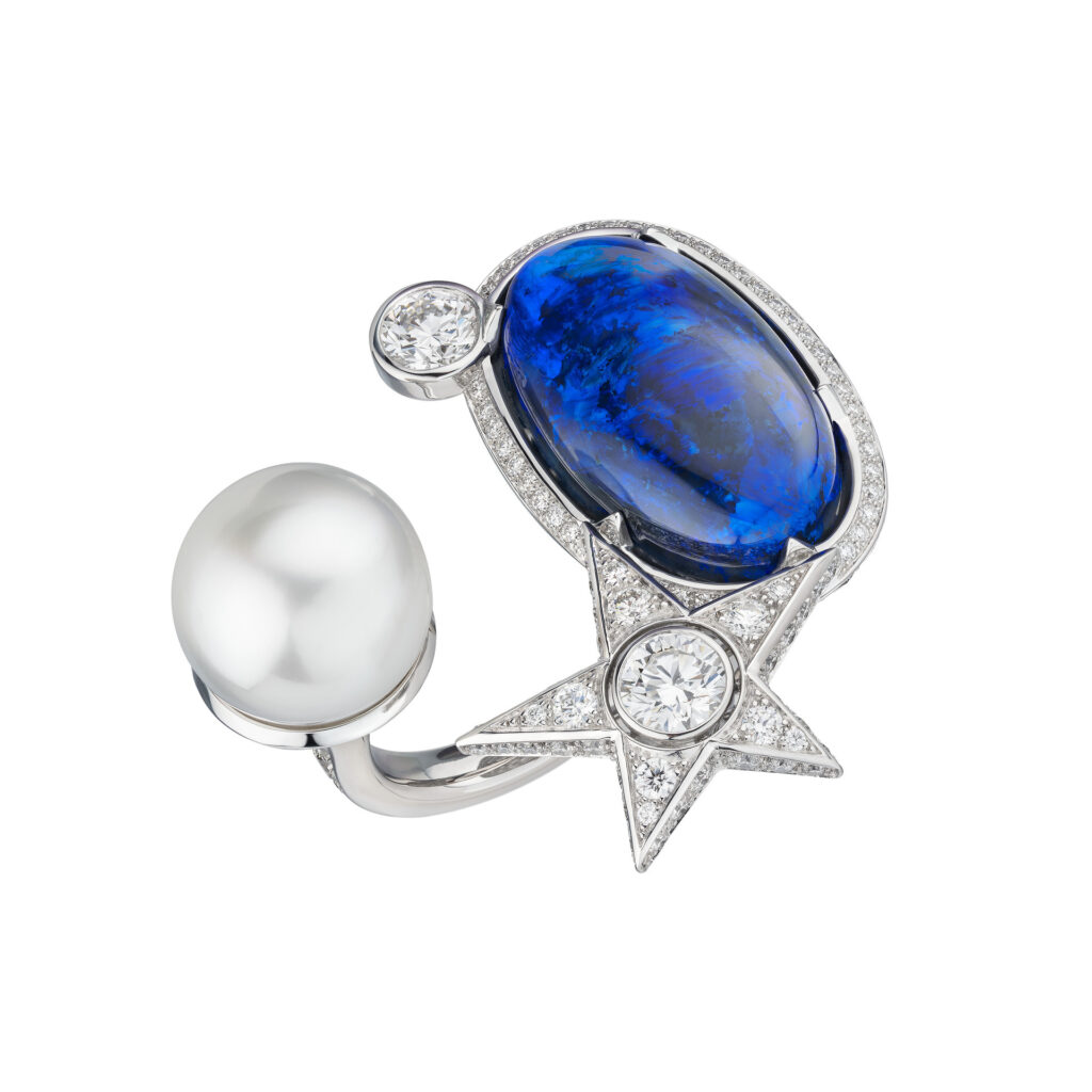 Fragments de ciel, des opales font leur incursion dans la collection avec le bracelet, la bague et la broche « Comète Opale ». Au côté des diamants ronds et des perles que Mademoiselle aimait tant, leurs feux hypnotiques plongent dans l’immensité du cosmos.