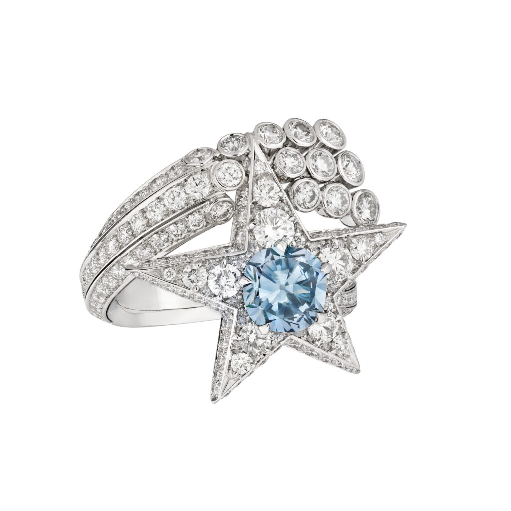 La comète de la bague est surmontée d’un diamant d’une précieuse couleur Fancy Vivid Blue de 1,60 carats à la rareté extraordinaire.