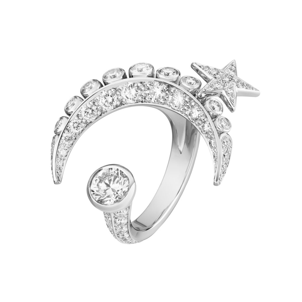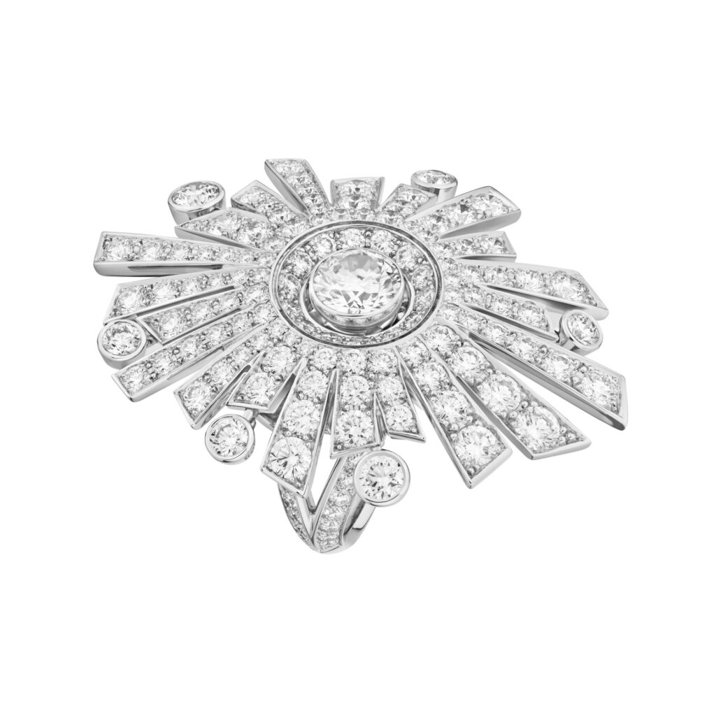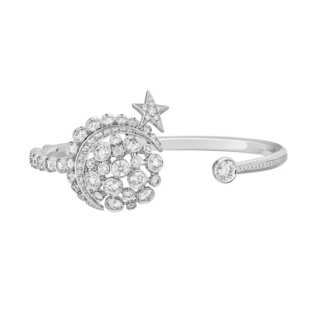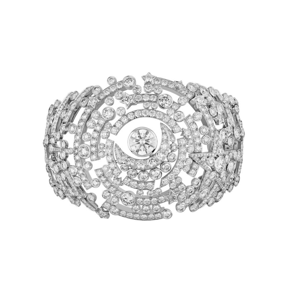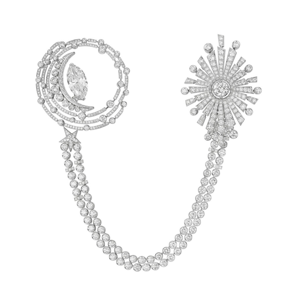 La rondeur parfaite du diamant donne aux symboles une forme d’éternité, prolongée par des rayonnements pour mieux le faire scintiller. « 1932 » dessine une nouvelle carte du ciel. Avec la comète, icône de l’imaginaire de la joaillerie CHANEL depuis la création de ce collier ouvert qui file autour du cou et s’ouvre sur le buste. Volutes circulaires et météores fusants offrent aux astres l’opportunité d’une course sans fin. Astre solitaire présent sur une unique pièce de « Bijoux de Diamants », la lune devient une icône à part entière de la collection « 1932 ». Le croissant originel monte désormais jusqu’à atteindre la plénitude, irradiant un halo éclatant. Et bien sûr, la puissance du soleil, au rayonnement net et graphique.