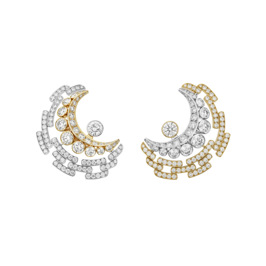 Composées d’or jaune et d’or blanc, serties de diamants ronds, la bague et les boucles d’oreilles « Lune Solaire » révèlent une nouvelle facette de l’astre, du lever au coucher.