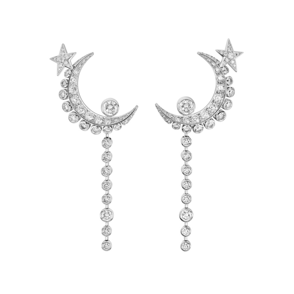 L’astre stylisé se transforme en créoles graphiques. Sur ces motifs d’oreilles sertis de diamants ronds, la lune irradie le long du cou et donne au visage une aura singulière.