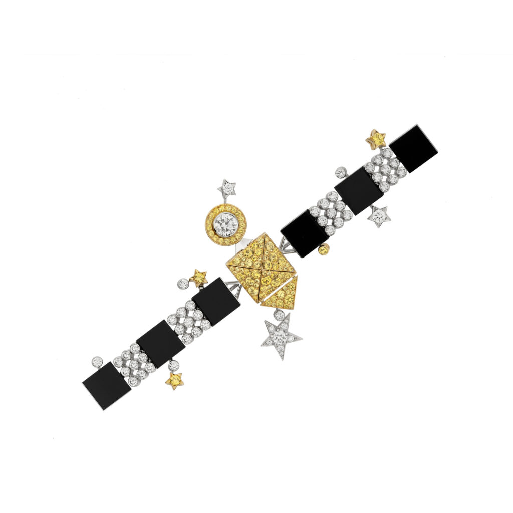 Pièces symboliques, le plastron et le bracelet « Comète Volute » affichent l’éclat de deux diamants ovales blanc et jaune chacun au poids symbolique de 19,32 carats.