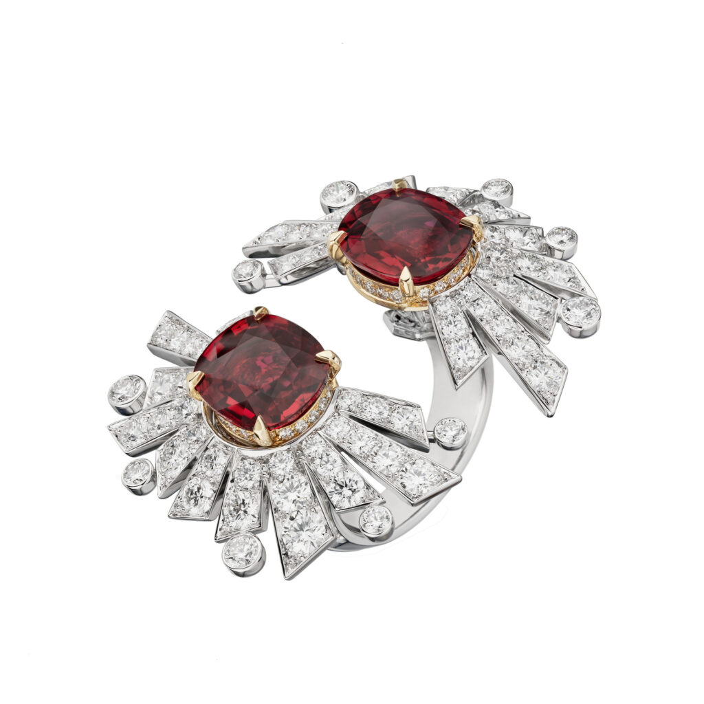 Deux rayonnements courent le long des doigts. Le premier a en sa tête un diamant poire jaune de 2,96 carats. L’autre, en or jaune, platine et diamants jaunes, est lancé par un rubis poire de 3,68 carats au rouge vif éclatant.