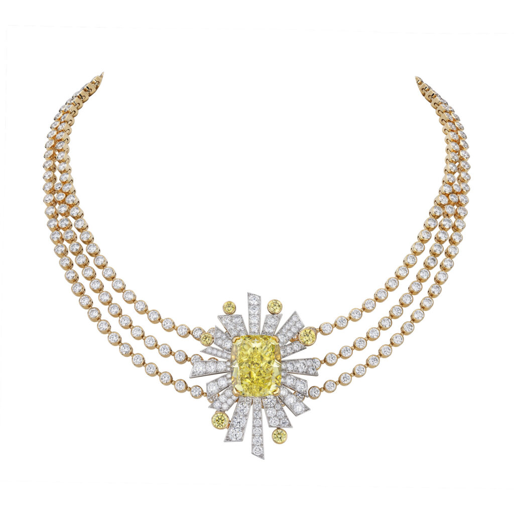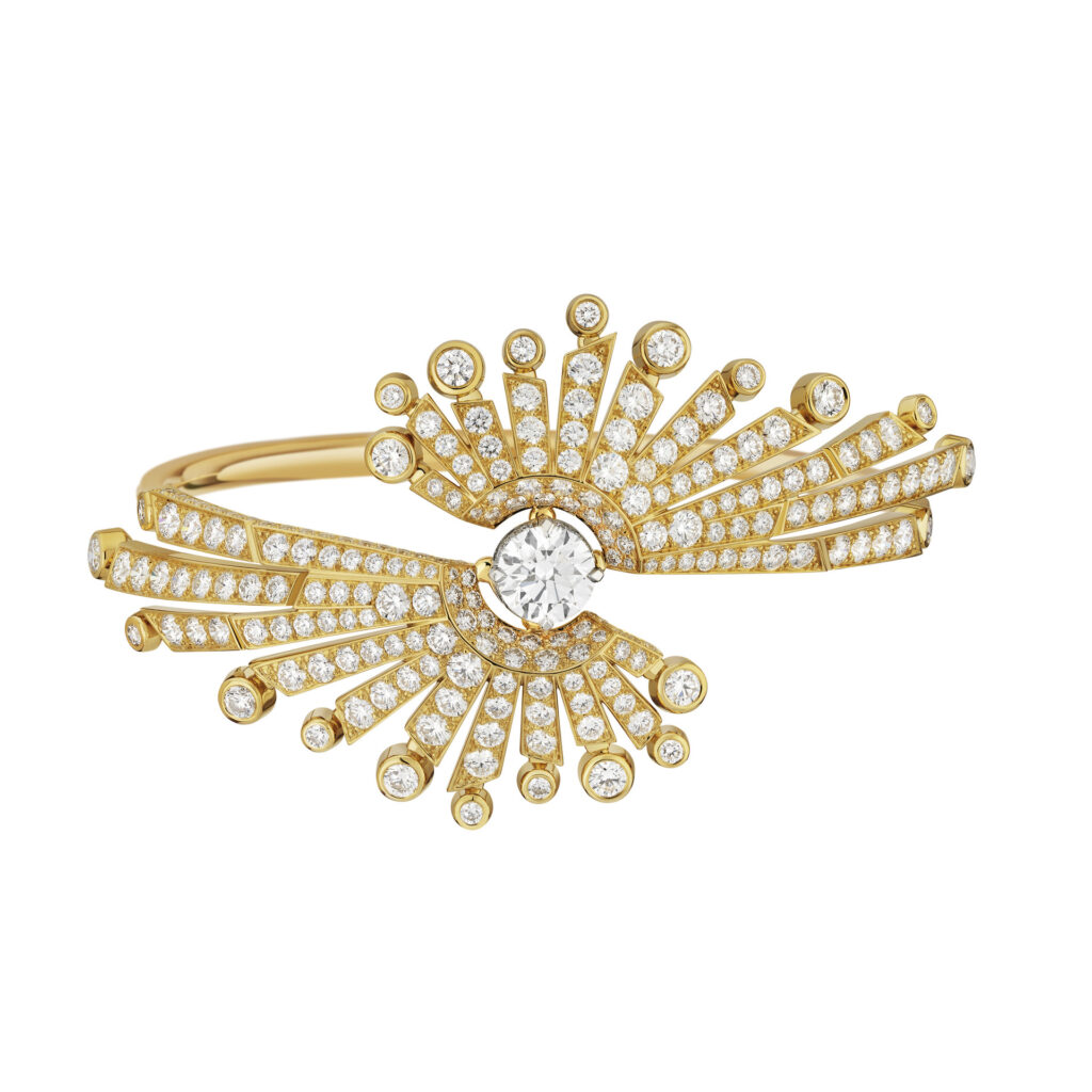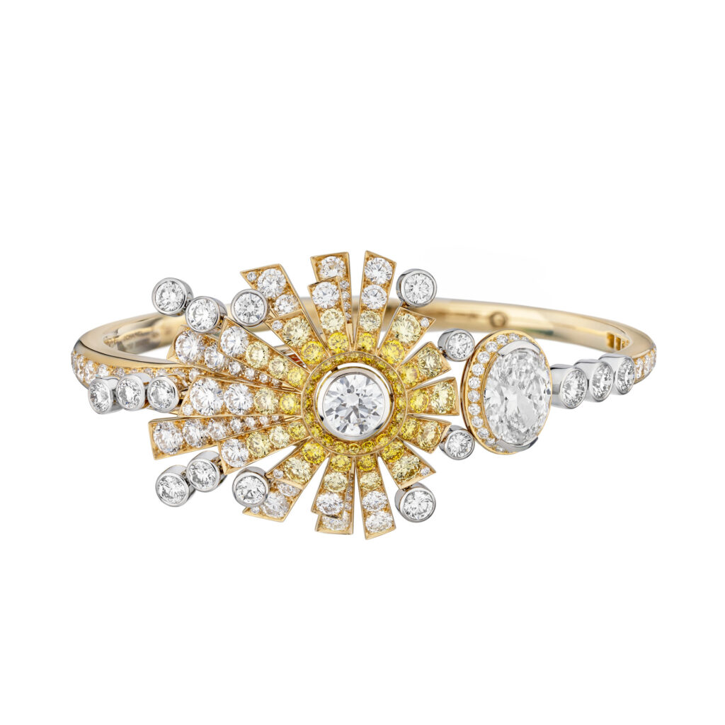 La blancheur immaculée des diamants ronds se détache sur le feu de l’or jaune. Les lignes dynamiques de la parure « Soleil Contrasté » illustrent un soleil mouvant, qui se scinde en deux pour enflammer le ras du cou, le poignet et plusieurs doigts.