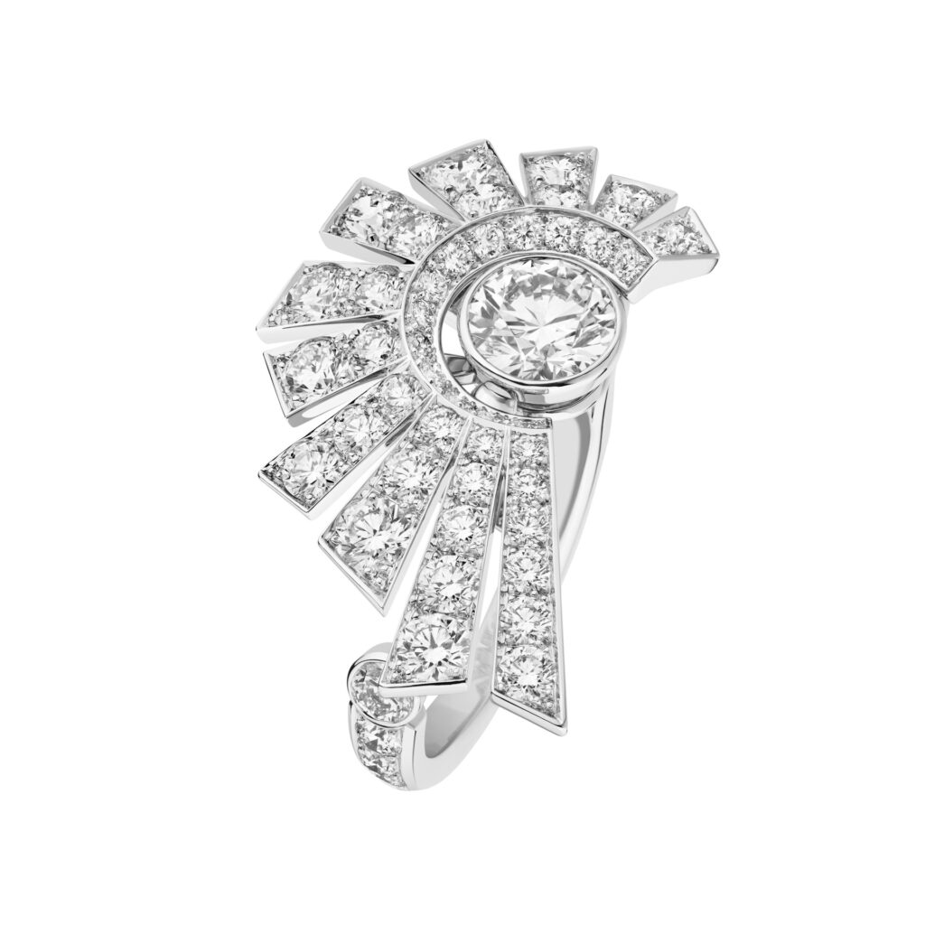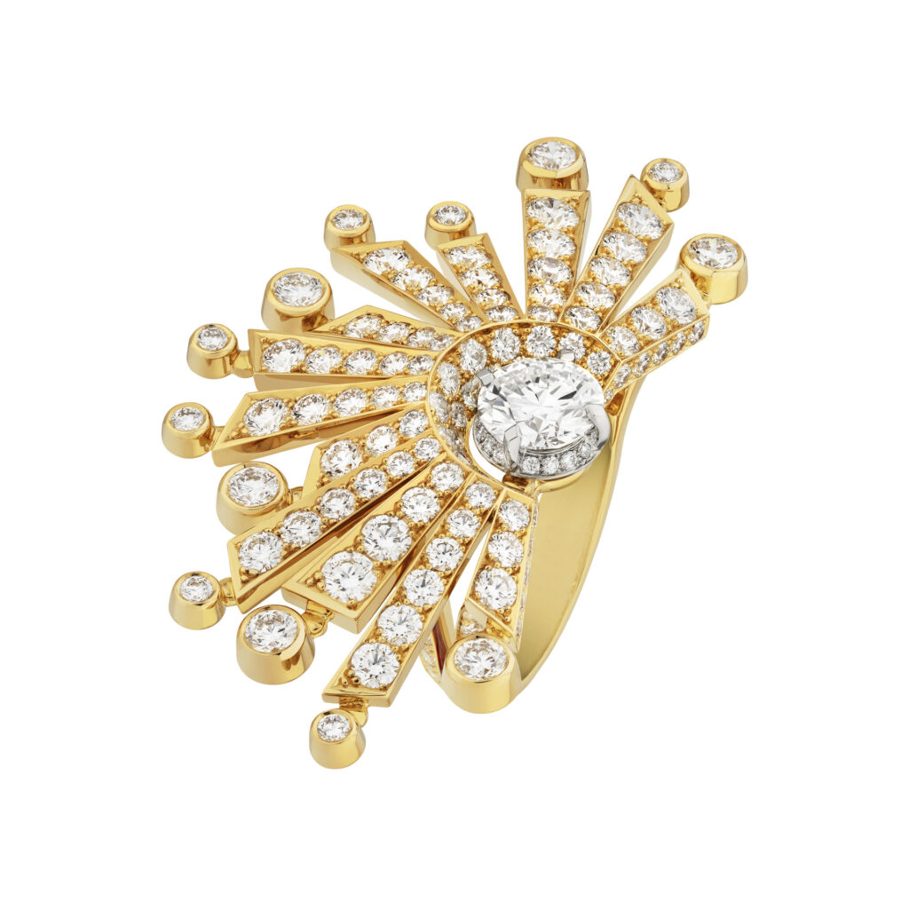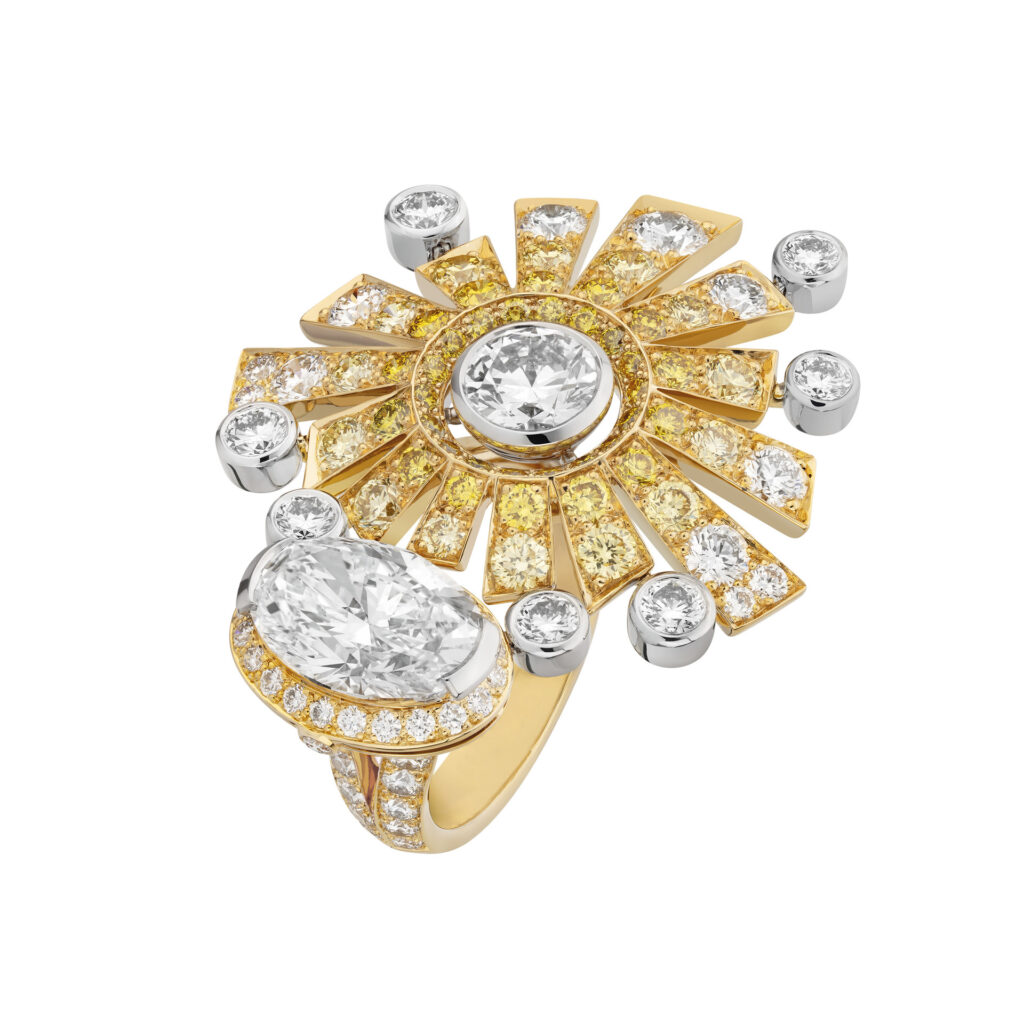 La bague « Soleil Mademoiselle » est un astre éclatant dont le rayonnement pivote à l’horizontale et à la verticale pour reproduire la course du soleil.