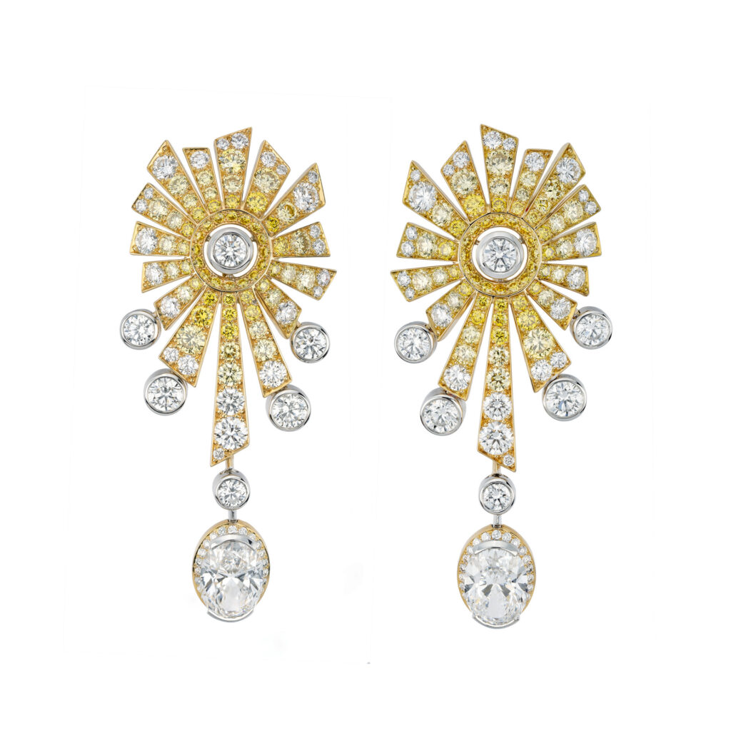Aux oreilles, deux diamants coussins jaunes sèment dans leur course une pluie de diamants blancs.