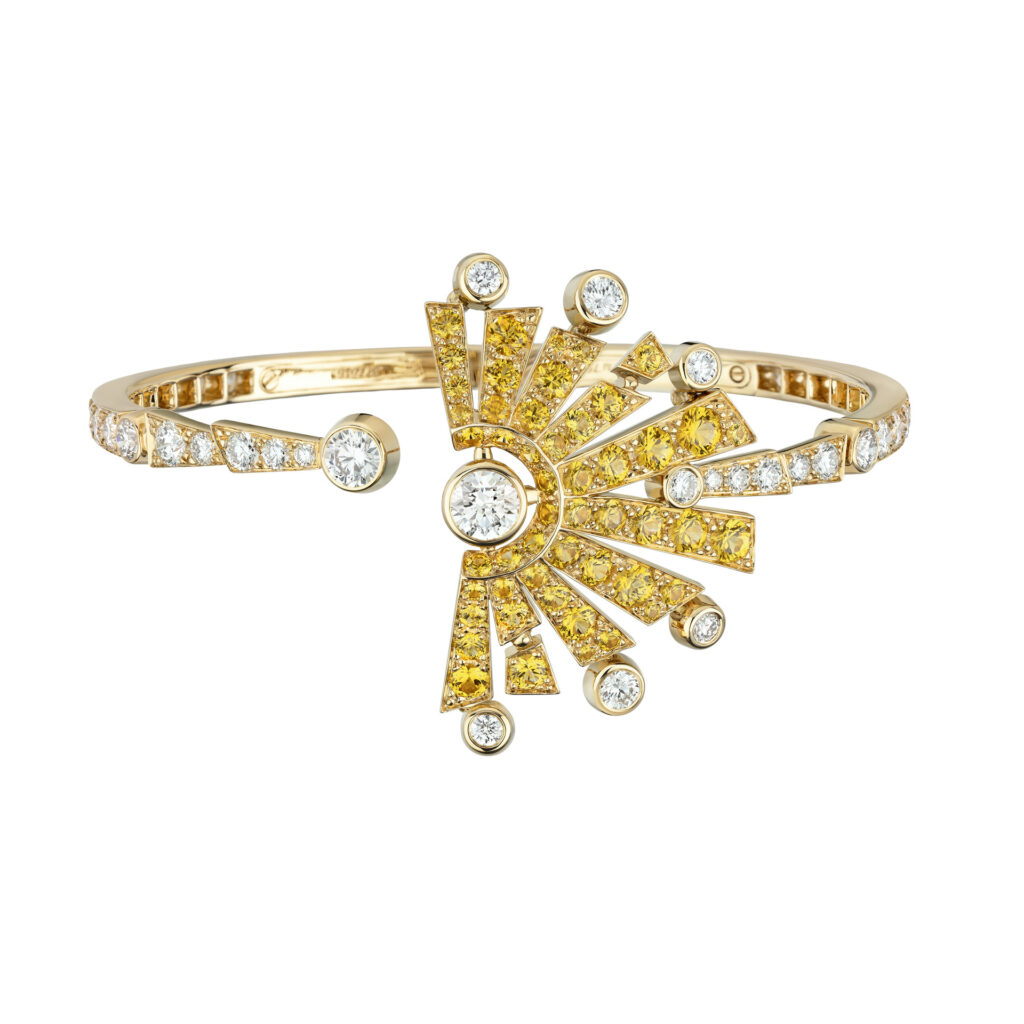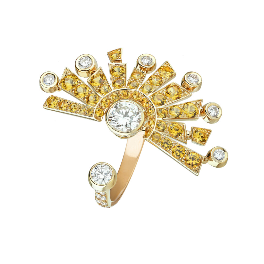 Les créations « Soleil Talisman » portent le feu de l’astre à son apogée grâce à une précieuse association de diamants et de saphirs jaunes montés sur or jaune.