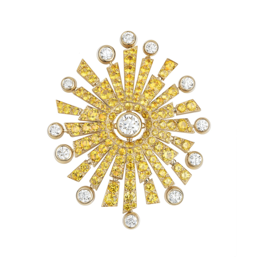 Soleil stylisé au cœur flamboyant d’un diamant rond, la broche illumine une tenue.