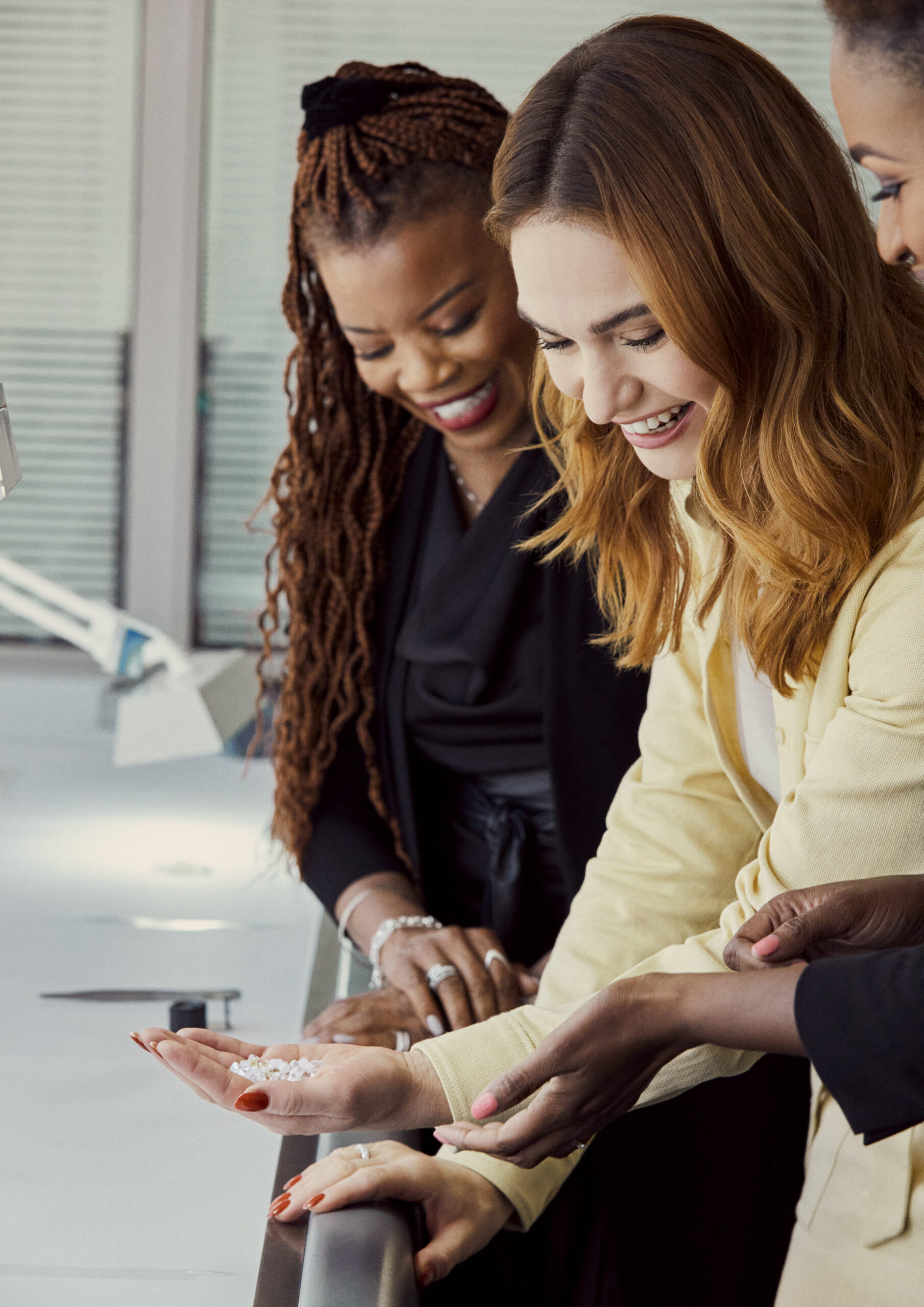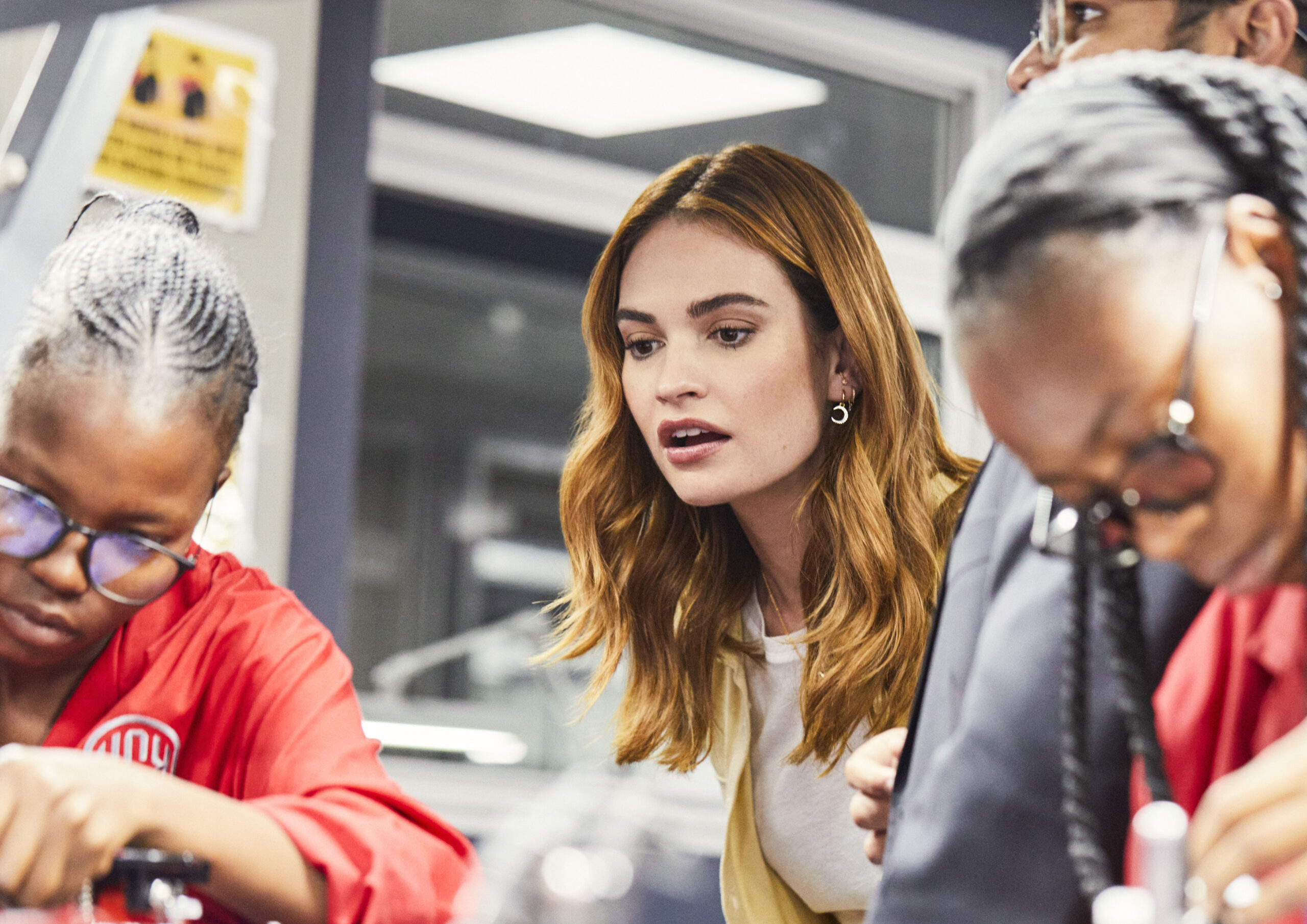 Dans la foulée, Lily James est partie à Gaborone, capitale du Botswana, pour visiter le Global Sightholder De Beers où sont organisées, 10 fois par an, des ventes de diamants bruts visibles avant achat par les clients. Dernière étape ? La visite du site de taille et de polissage KGK diamond, situé également à Gaborone. Sur place, Lily James a pu échanger avec certains de ces employés remarquables. Majoritairement botswanais, leurs moyens de subsistance viennent directement de l’industrie du diamant naturel.
