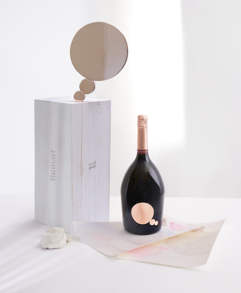 Como parte de su reinterpretación artística de la Casa Ruinart, Jeppe Hein ha transformado la caja de madera que contiene una botella Jeroboam de Ruinart Rosé en una obra de arte, explorando las diferentes dimensiones del champán. Esta caja se hace eco de la instalación sensorial del artista RIGHT HERE, RIGHT NOW.