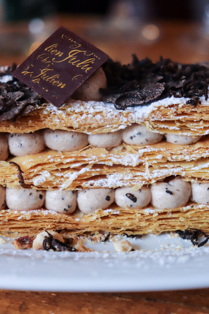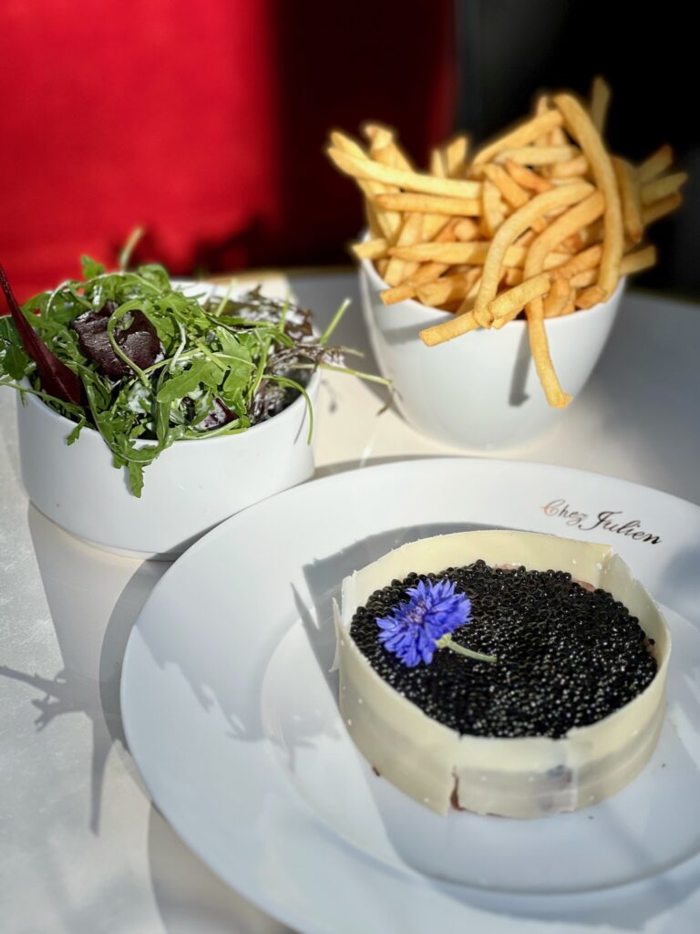 Sans oublier les incontournables comme le tartare de veau au couteau, perle de truffe, frites maison, salade mesclun, le Chateaubriand, sauce aux poivres Sarawak et Penja frites maison, Carré d’agneau, purée de pommes de terre truffée.