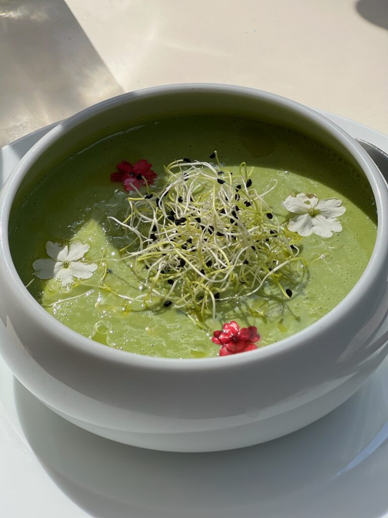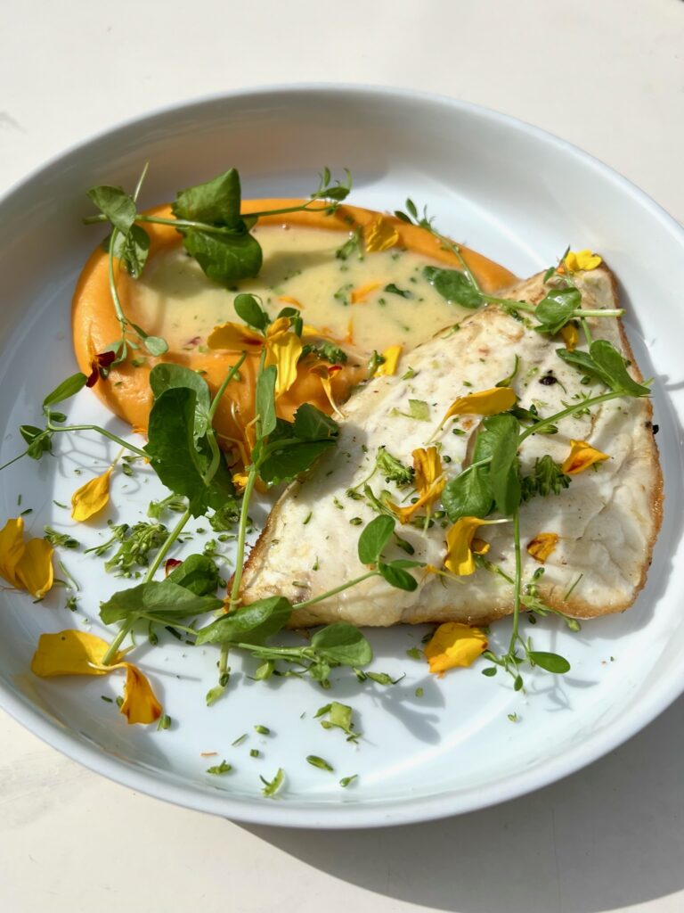 Pour commencer les hostilités, le chef propose une sélection d’entrés : le Ceviche de Bar, vinaigrette Yuzu, la fameuse Tomate « Jouno » œuf mollet bio et émulsion de burrata aux herbes fraîches, Coeur de sucrine, parmesan, grenade, Velouté de potimarron …