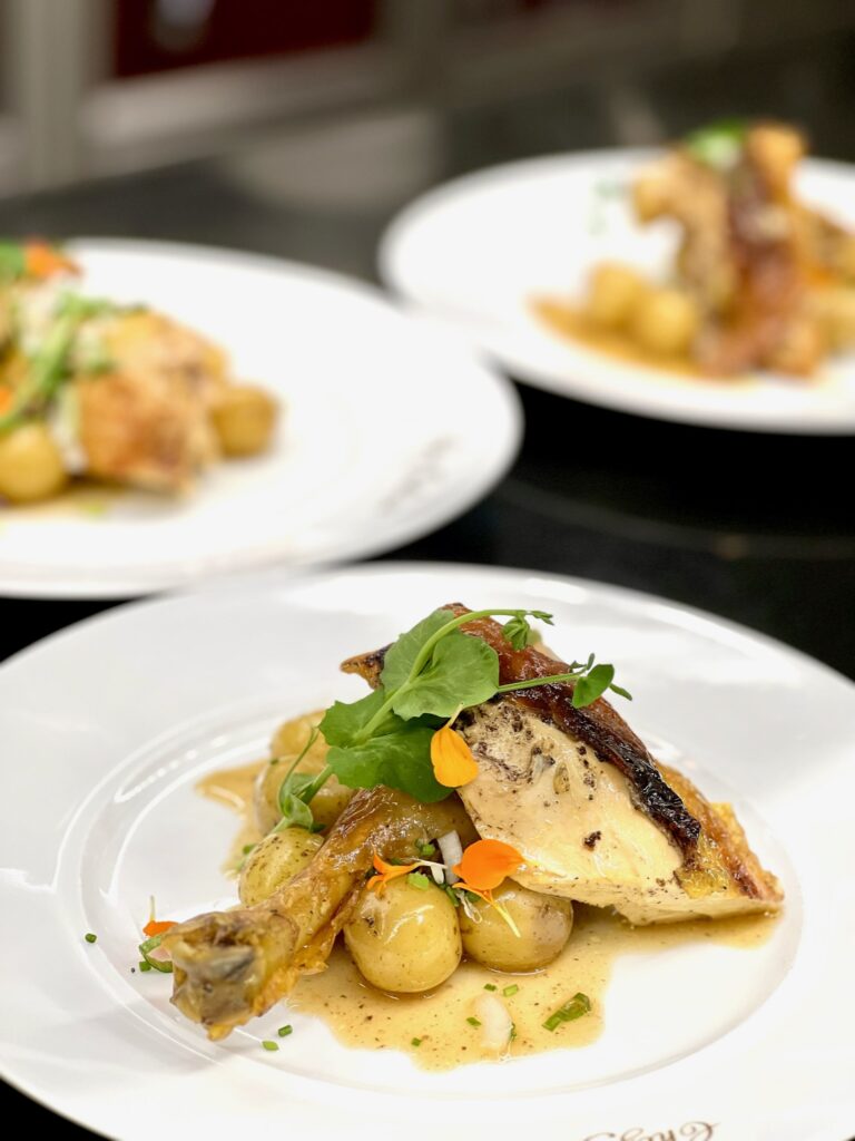 À partager, le Poulet entier fermier au beurre de truffe noire, pommes de terre mitrailles confites au jus et la Côte de Boeuf Aberdeen Angus (IGP) 1,1kg, poêlée de légumes, frites maison, sauce grand-mère et sauce poivre.