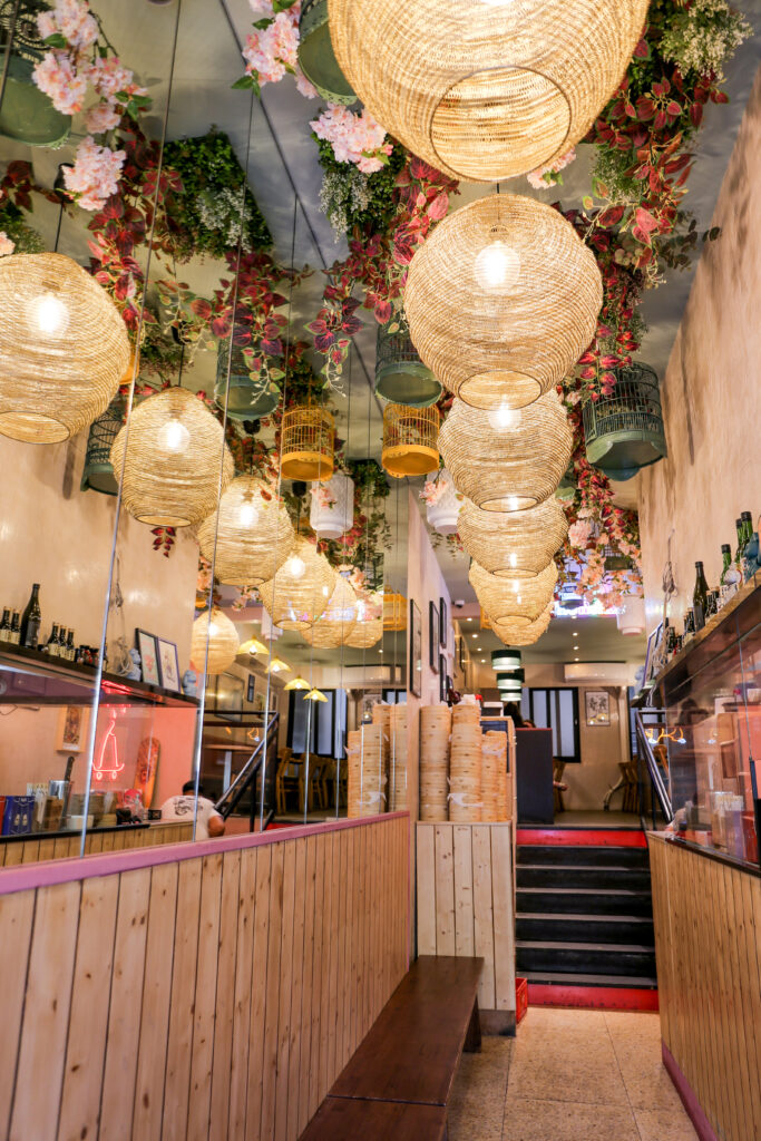 L’univers de la maison est éclectique. A l’intérieur, les aspects végétalismes, font écho à la terrasse. Pour la décoration, un savant mélange d’Asie et de pop culture, baigné dans un style industriel : bibliothèque à manga au-dessus du bar, extincteurs personnalisés et néons, les références sont nombreuses pour des yeux aussi comblés que les estomacs. A l’étage, un ring et une salle d’inspiration basket, destinés à l’accueil des groupes finissent le tour du propriétaire