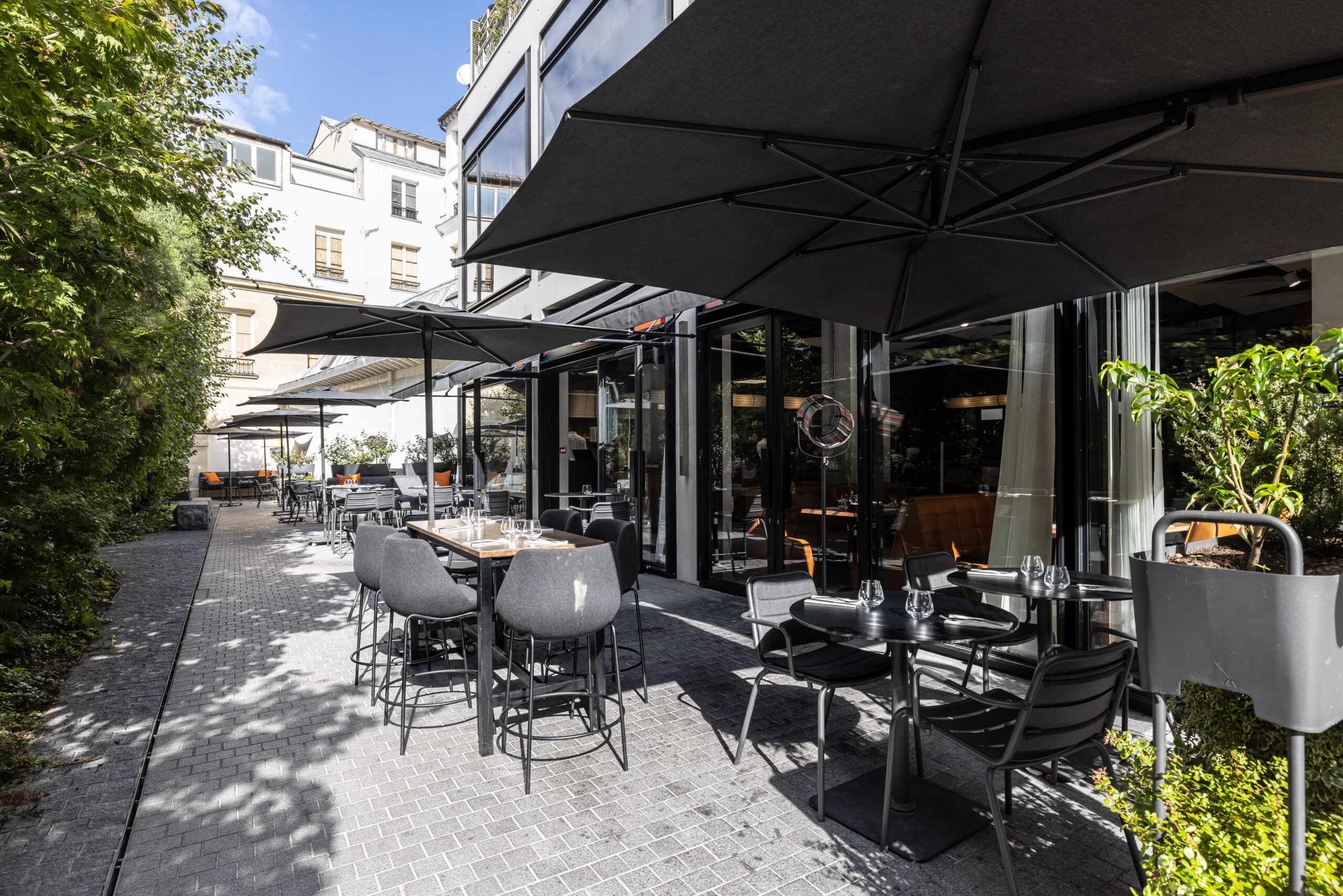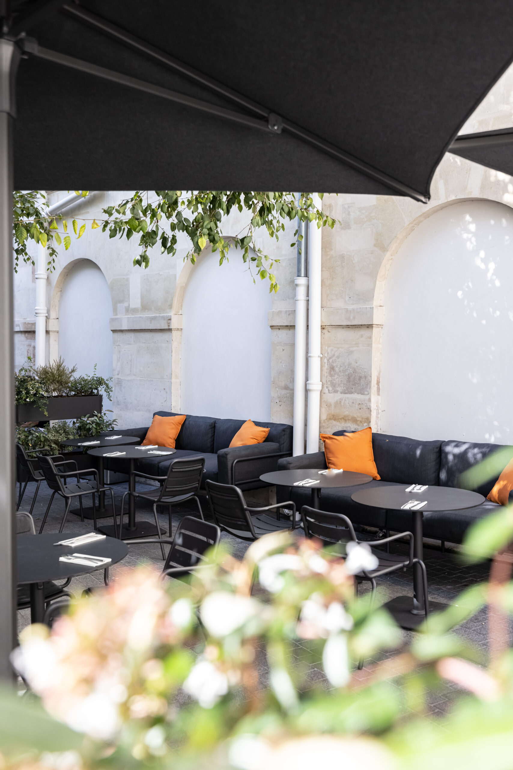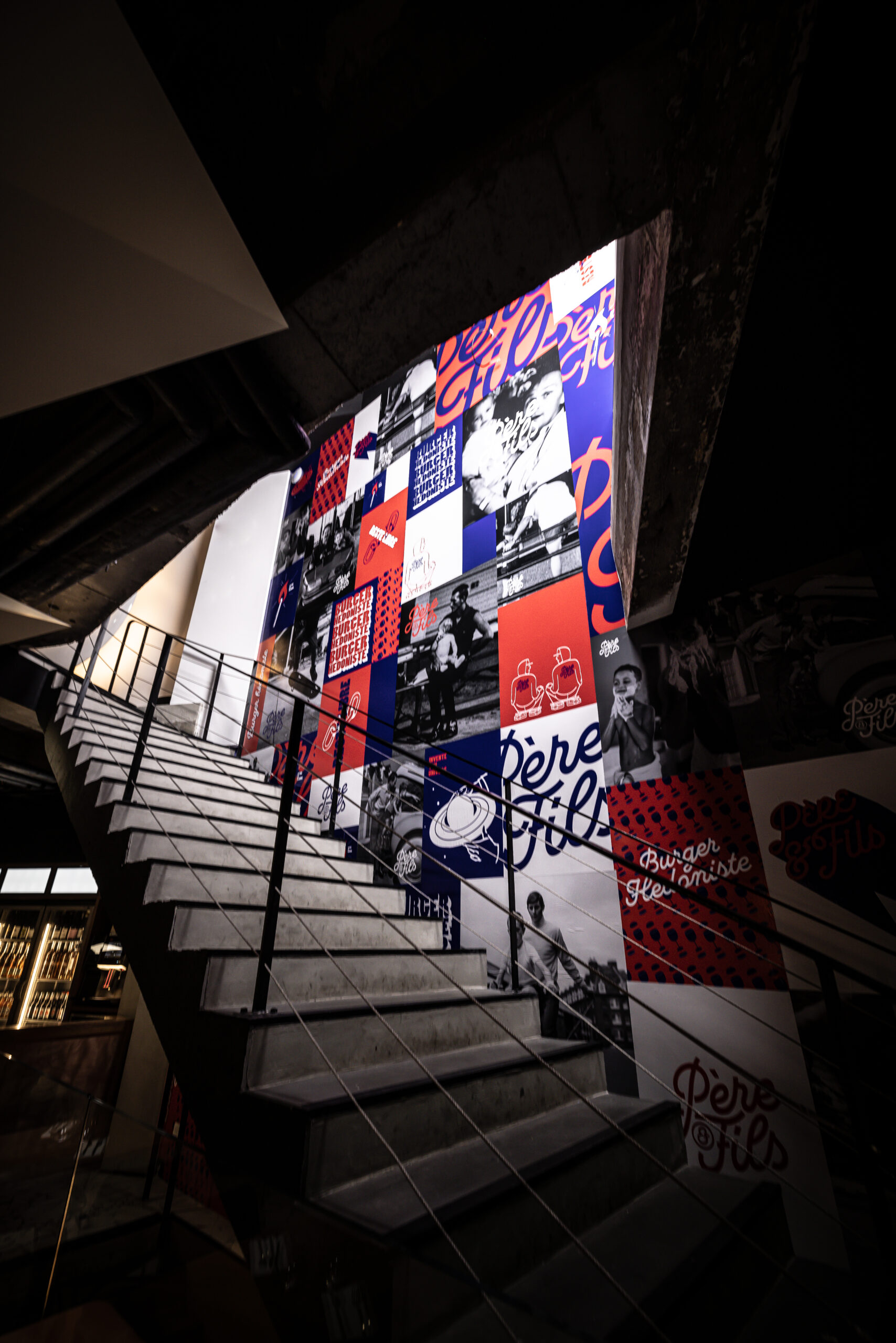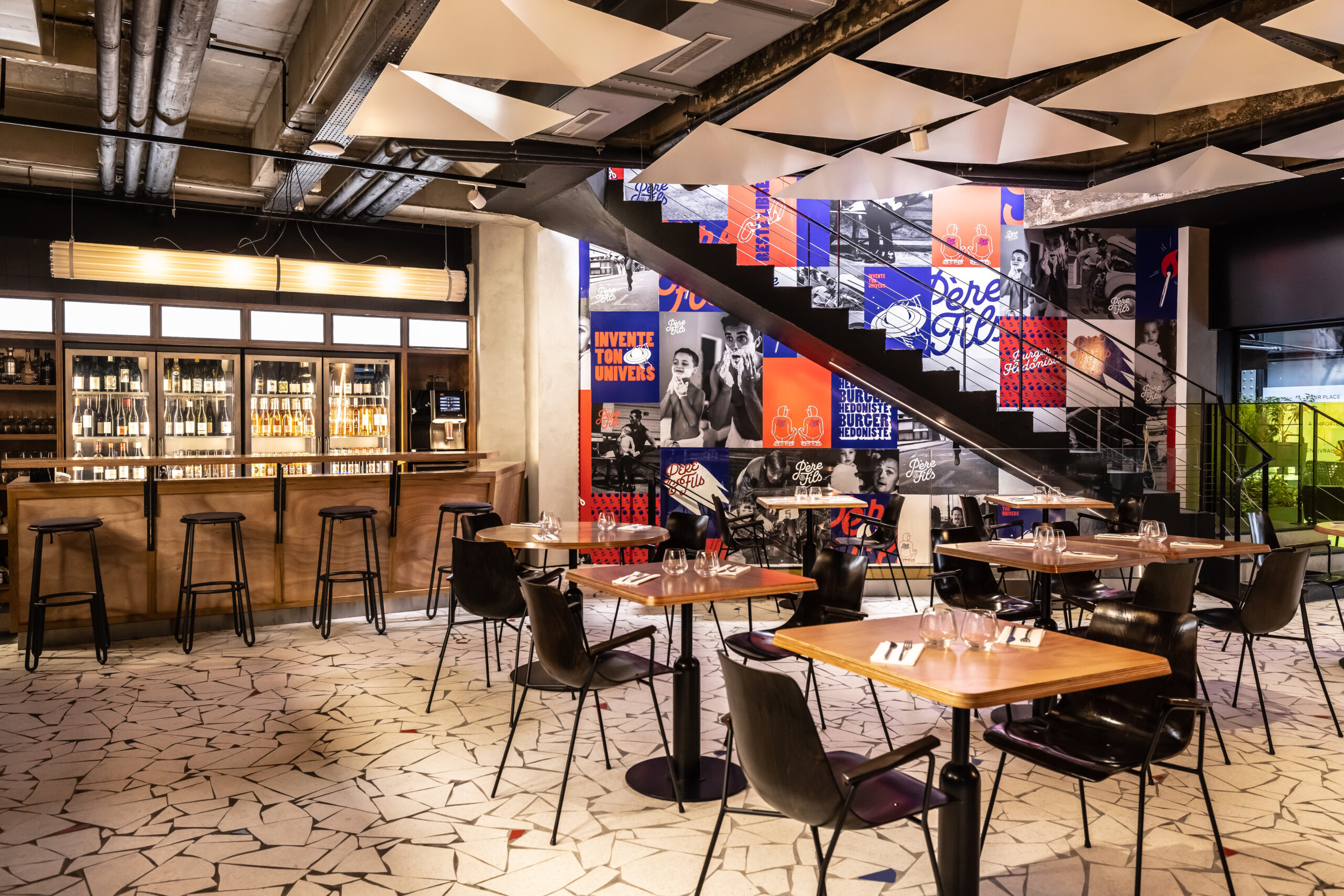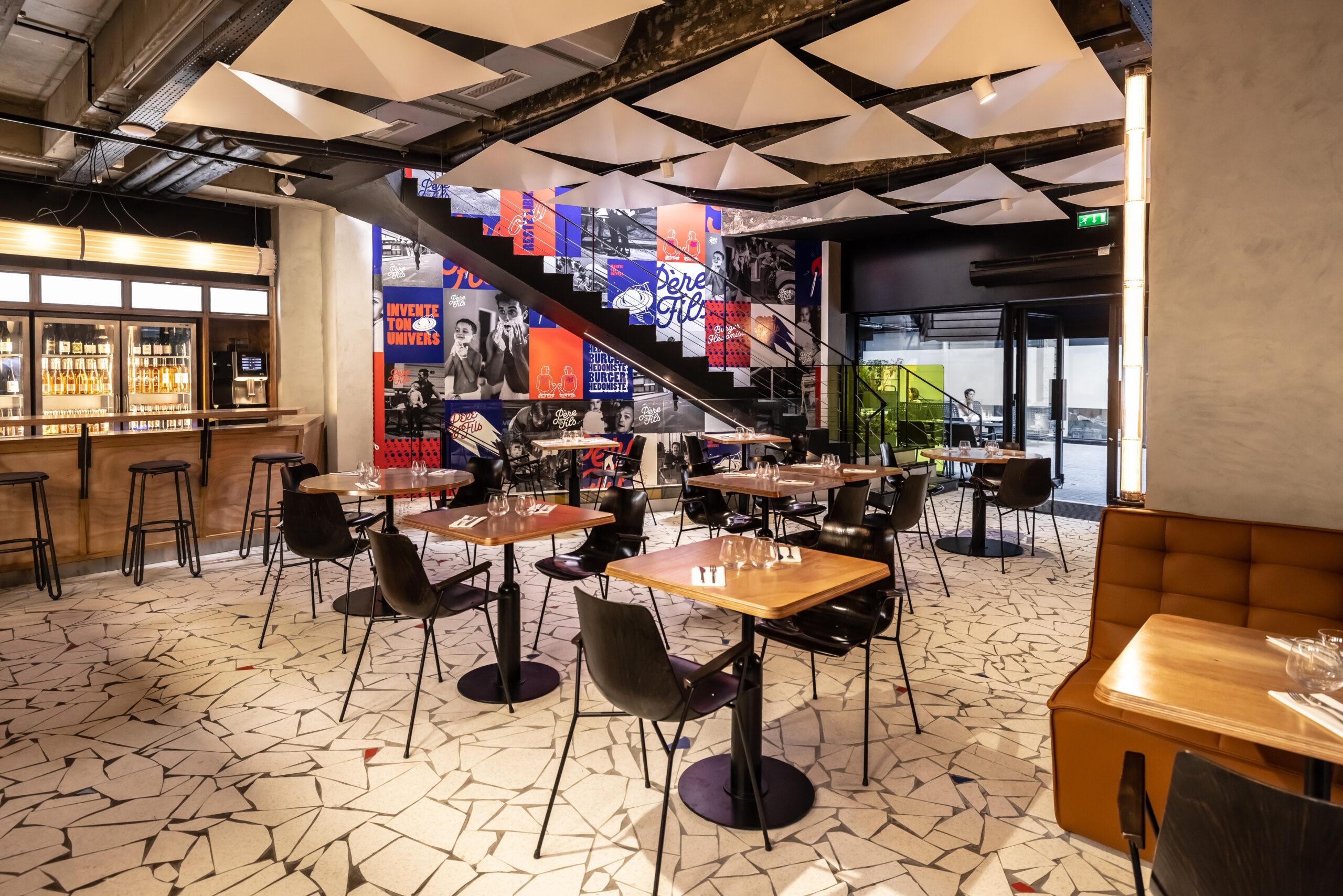 Au rez-de-chaussée, de larges banquettes invitent au partage et à la convivialité dans un esprit très contemporain. Un large pan de mur de l’escalier s’habille d’illustrations façon street- art avec une thématique commune, la transmission entre père et fils et l’envol du fils vers la liberté de créer son propre univers. A l’étage, l’espace a été pensé comme un loft modulable pouvant être privatisé pour divers événements. Les matières nobles et simples s’associent pour créer une ambiance chaleureuse et accueillante.