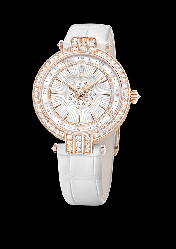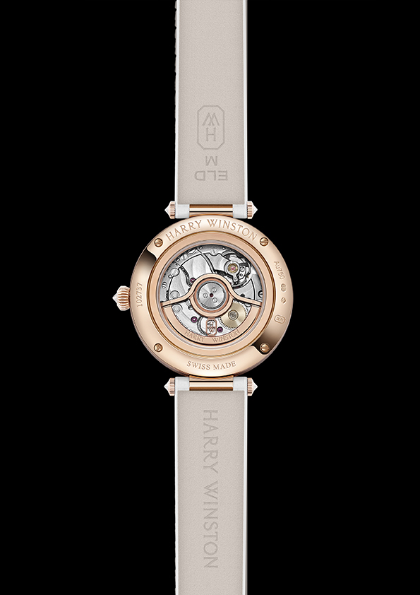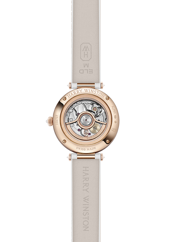 L’attention particulière portée aux détails qui caractérise toutes les créations Harry Winston est visible sur le mouvement automatique haut de gamme de fabrication suisse. L’incorporation d’un ressort plat en silicone résistant aux champs magnétiques, à la corrosion et aux chocs garantit des années de fonctionnement optimal tandis que le fond en glace saphir permet d’admirer le rotor squeletté en or rose 22 carats ainsi que les finitions du mouvement.