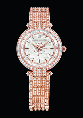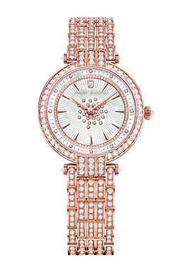 La collection Premier fut la première collection horlogère lancée par la Maison Harry Winston en 1989 et son nom fait également référence à la toute première entreprise de M. Winston, la Premier Diamond Company. Une collection qui transpose le glamour et la tridimensionnalité des créations joaillières Harry Winston dans le domaine de l’horlogerie, c’est également elle qui regroupe les designs les plus créatifs et les séries Métiers d’Art. Immédiatement reconnaissables à leurs arches serties de diamants – faisant écho aux trois arches surplombant l’entrée de l’emblématique Salon Harry Winston situé sur la cinquième Avenue de New York – les boîtes des modèles Premier Automatic 31mm resplendissent sous le feu de 63 diamants taille brillant. Avec un profil ultrafin de seulement 8,4 mm, la boîte de 31 mm de diamètre est disponible en or blanc ou rose 18 carats.