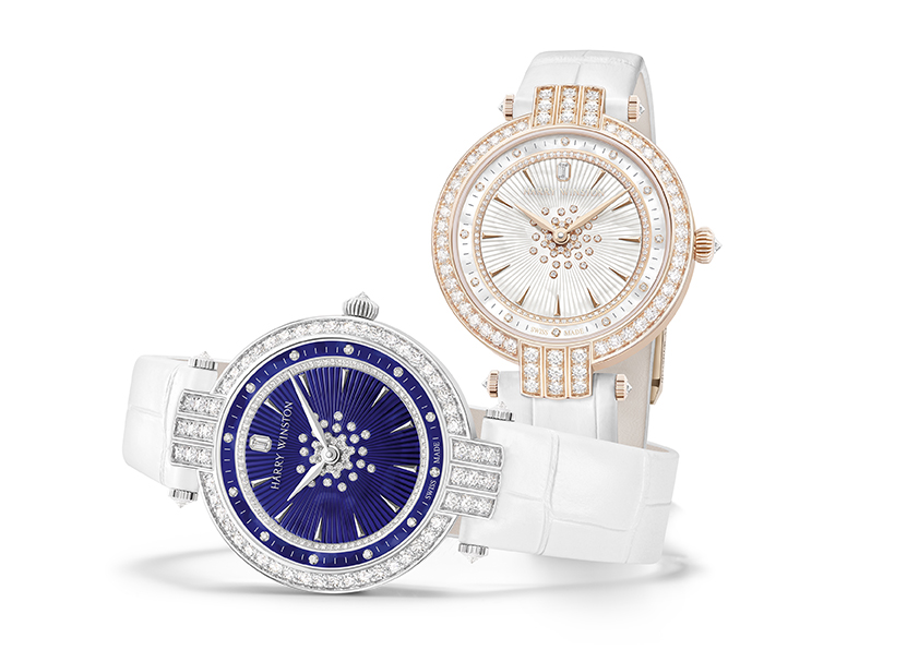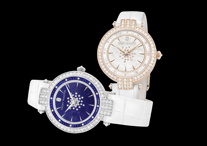 Honorant l’héritage du « Roi des Diamants », les cadrans sont ornés de 126 diamants taille brillant. Douze repères horaires en diamant sont sertis sur le tour d’heure périphérique, créant un second halo de diamants pour encadrer la section gravée. Un ravissant saupoudrage de diamants sertis neige au centre du cadran brise la géométrie stricte de la gravure et ajoute une note ludique à la composition. Enfin, la taille de pierre préférée de M. Winston est représentée à midi avec un flamboyant diamant taille émeraude.