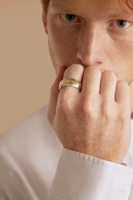 Pour les hommes, la Maison présente SATURN, POOL et NEON, 3 anneaux au style moderne en or rouge, gris et jaune. L’intérieur de l’anneau est gravé de la signature de la marque et de son icône, la libellule.
