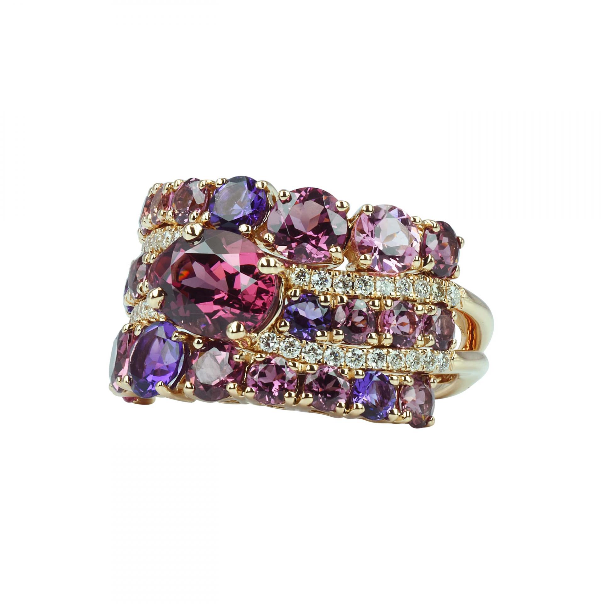 Réparties sur trois rangs, subtilement soulignés par des rubans de diamants, les gemmes de couleur sont juxtaposées les unes aux autres sur un fil d’or, dans un sertissage délicat. Minutieusement taillées et polies pour scintiller de mille feux, elles composent un pavage ondulant par leur calibre différent tout en mettant en majesté une belle pierre de centre. Traduisant un savoir-faire traditionnel de la joaillerie française, l’ensemble d’un beau volume se singularise par son raffinement esthétique.