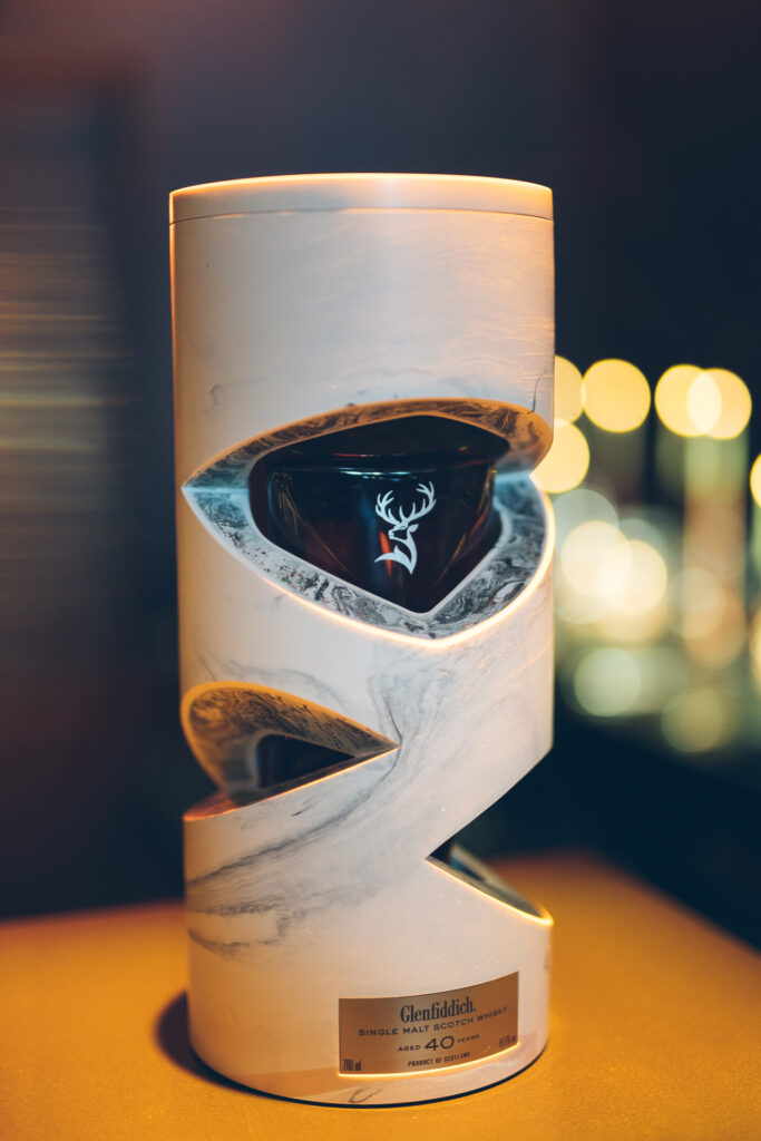 Prenant la forme d’une métamorphose géologique, le coffret du whisky 40 ans est élaboré en jesmonite, en écho au bouchon du flacon. La nature singulière de ce matériau signifie que chaque boîte est unique et ne peut pas être reproduite. À travers l’exposition des différentes couches, il symbolise le concept du temps accumulé, référence aux différents assemblages à travers les années. Ses touches de vert font écho à la première bouteille Glenfiddich, le 12 ans, tandis que ses reflets cuivrés rappellent les alambics signatures de la maison. Dans un premier temps, seulement 1 600 bouteilles de whisky 40 ans Glenfiddich seront disponibles à travers le monde.