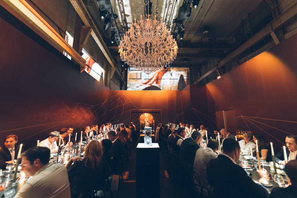 Cette suspension du temps est traduite dans l’esthétique du coffret : son design évoque l’image de rubans en mouvement, figés dans le temps pour laisser apparaître la bouteille qu’ils enserrent. Ses lignes dynamiques et sa structure complexe créent une illusion de bouteille suspendue, flottant dans les airs, hors du temps.