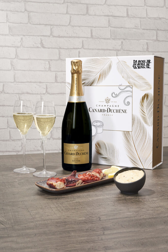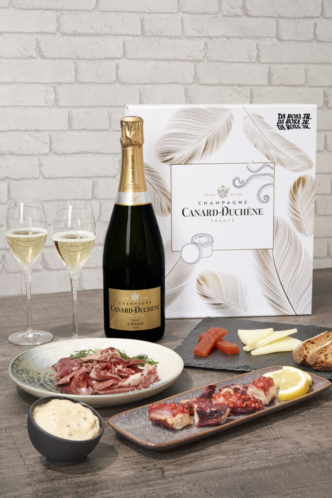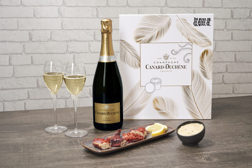 En-cas festif typique de l’extrême nord-ouest de l’Espagne où on l’appelle aussi o pulpo a feiria, on le sert parfumé d’épices douces, coupé en petites rondelles sur des planches en bois. Ici, il est cuit sous vide à basse température, afin de lui garder une texture parfaite. Les notes zestées d’orange sanguine et de fruits exotiques et les arômes légèrement épicés de la Cuvée Léonie réveillent et révèlent le plaisir tentaculaire de ce tapas de la mer.