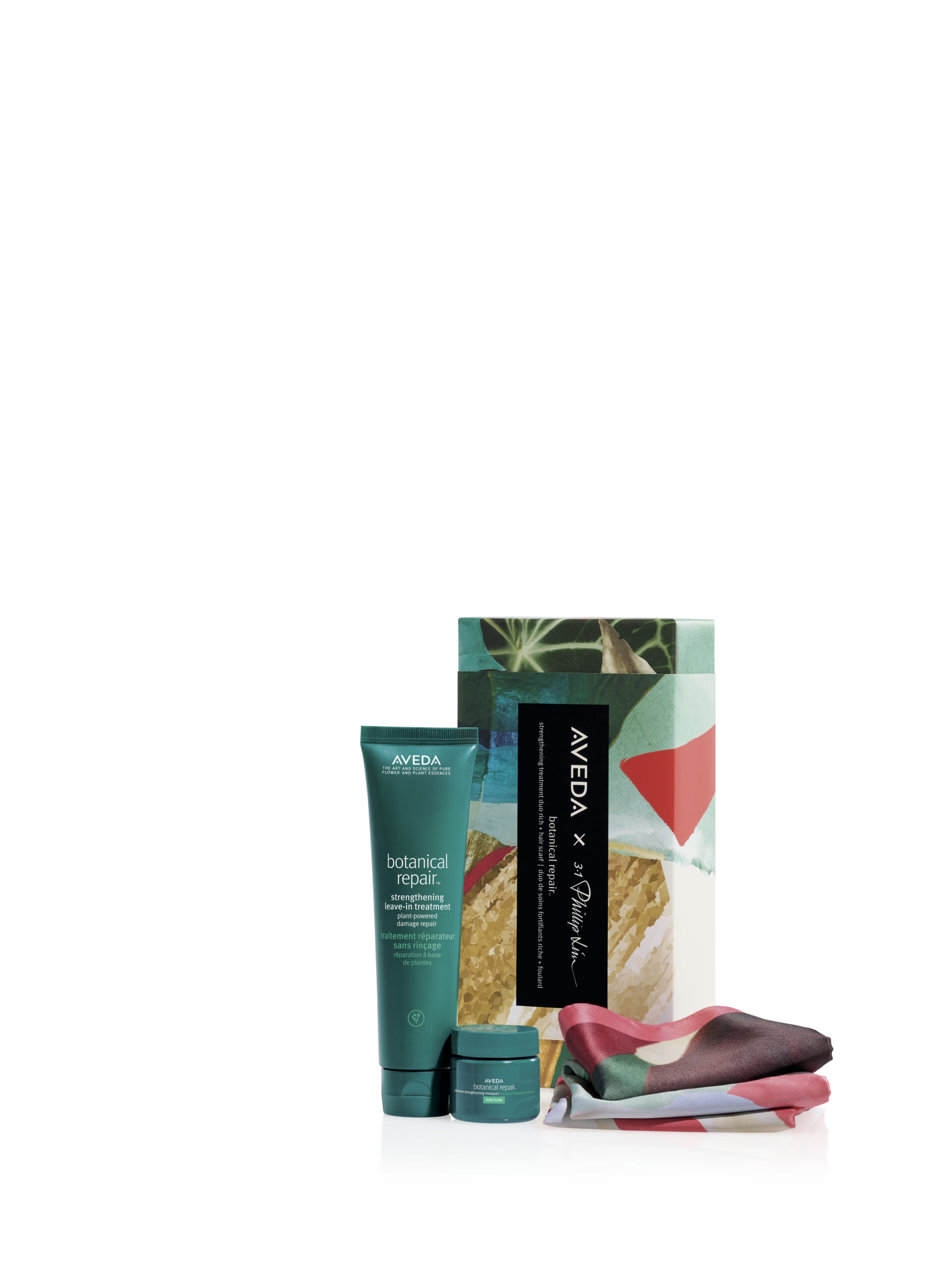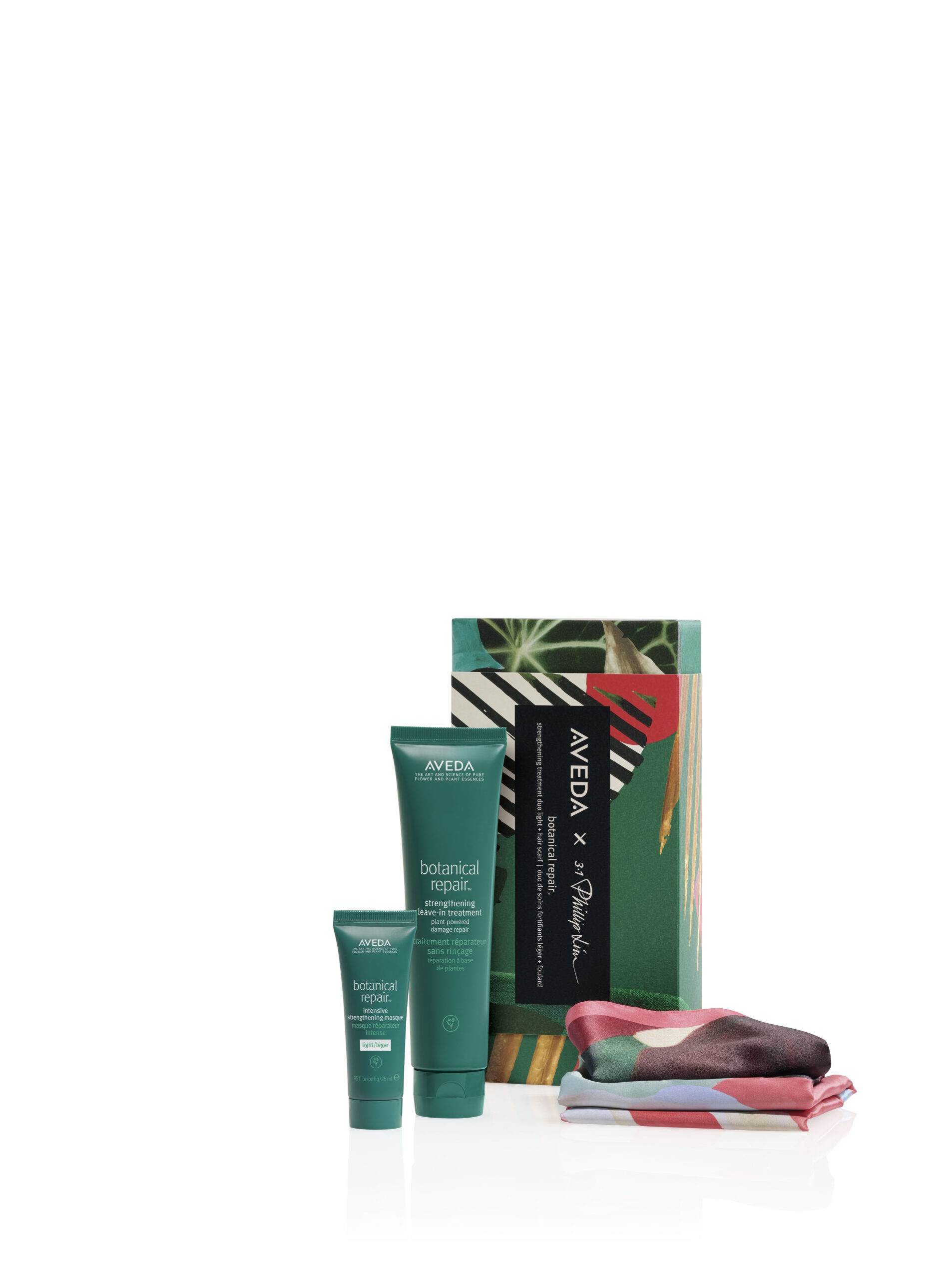 Coffret composé d’un traitement réparateur sans rinçage (100ml), D’un masque réparateur intense léger (25ml) Botanical RepairTM Et d’un foulard pour cheveux désigné par Philip Lim.