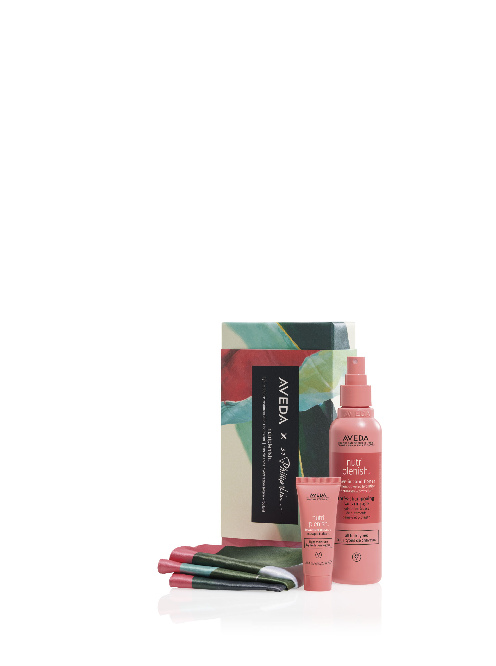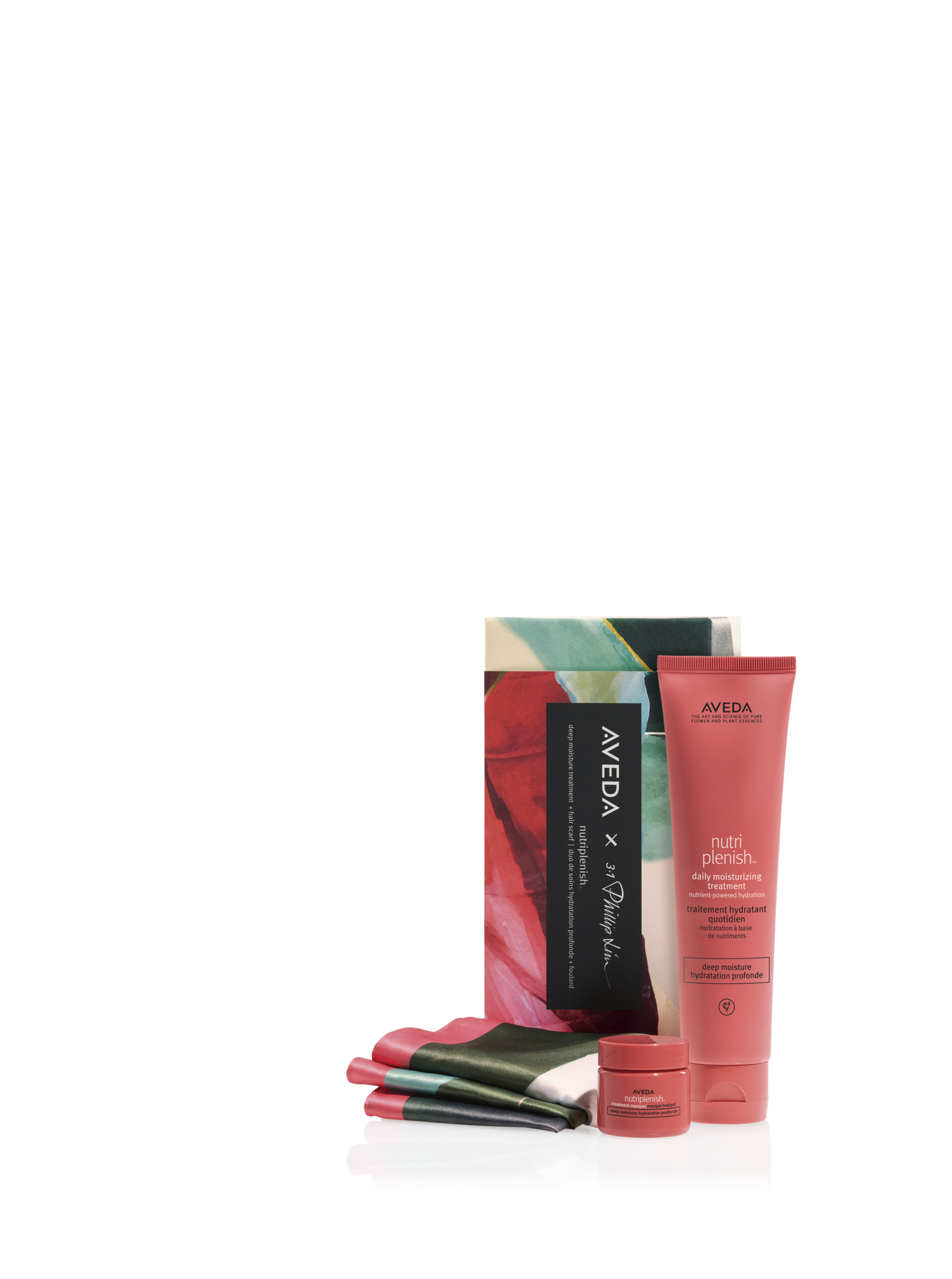 Coffret composé d’un traitement hydratant quotidien (150ml), D’un masque hydratation profonde (25ml) NutriplenishTM et d’un foulard pour cheveux désigné par Philip Lim.