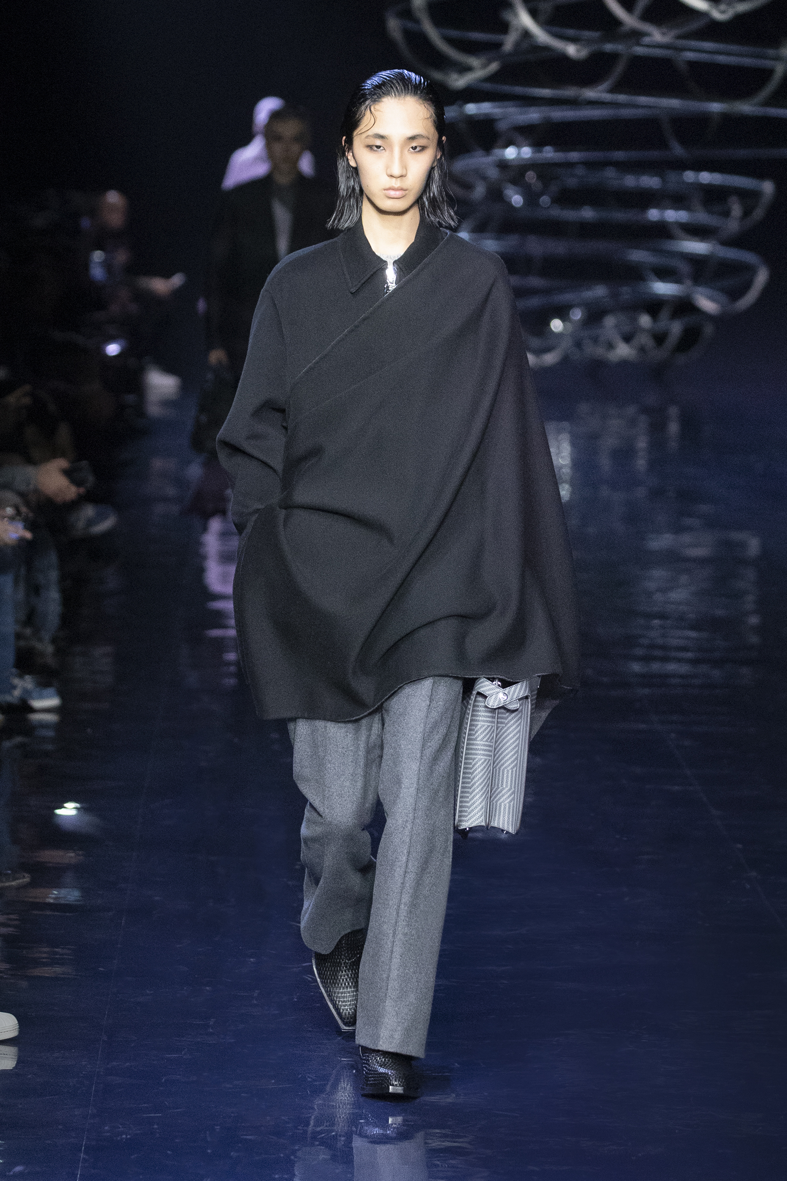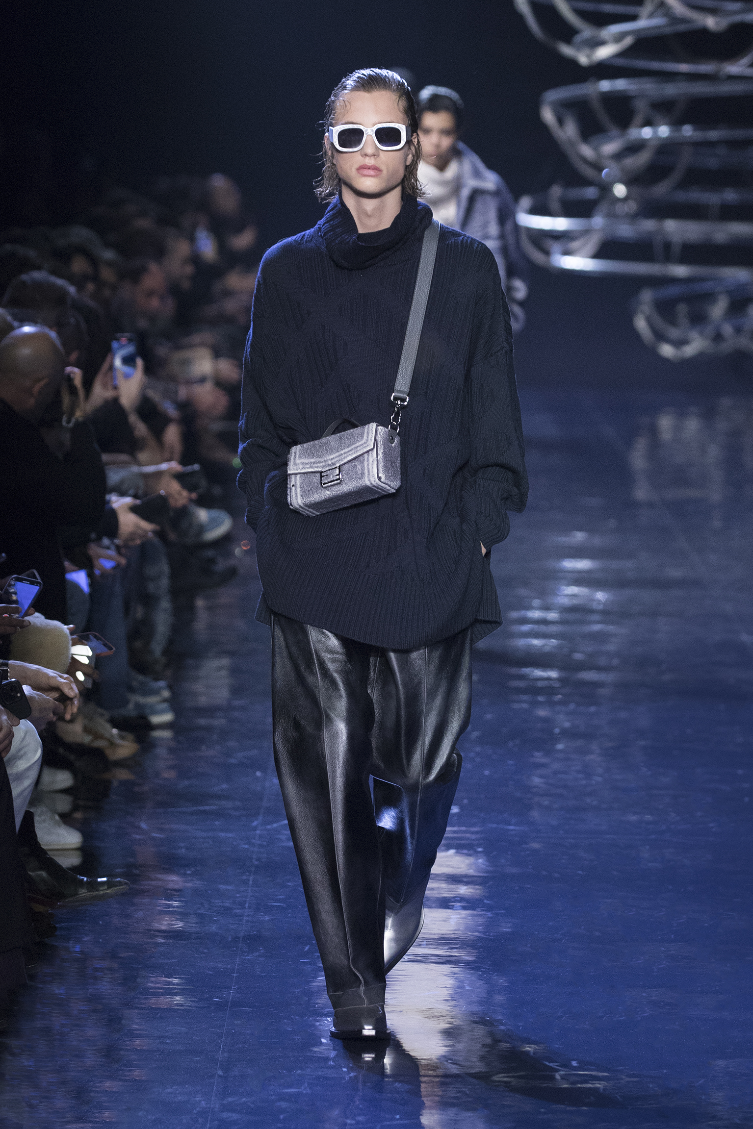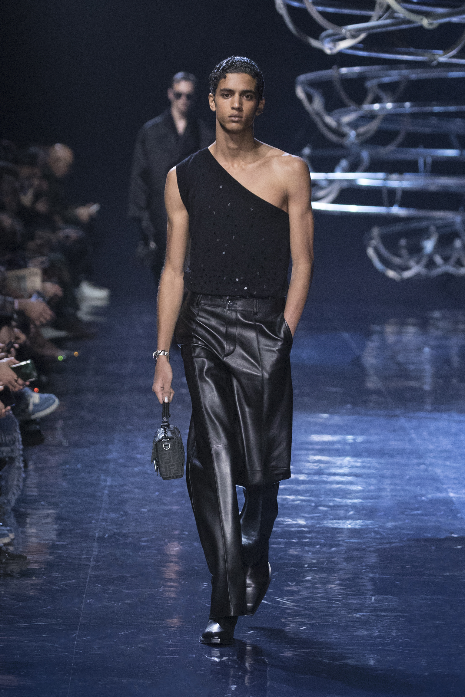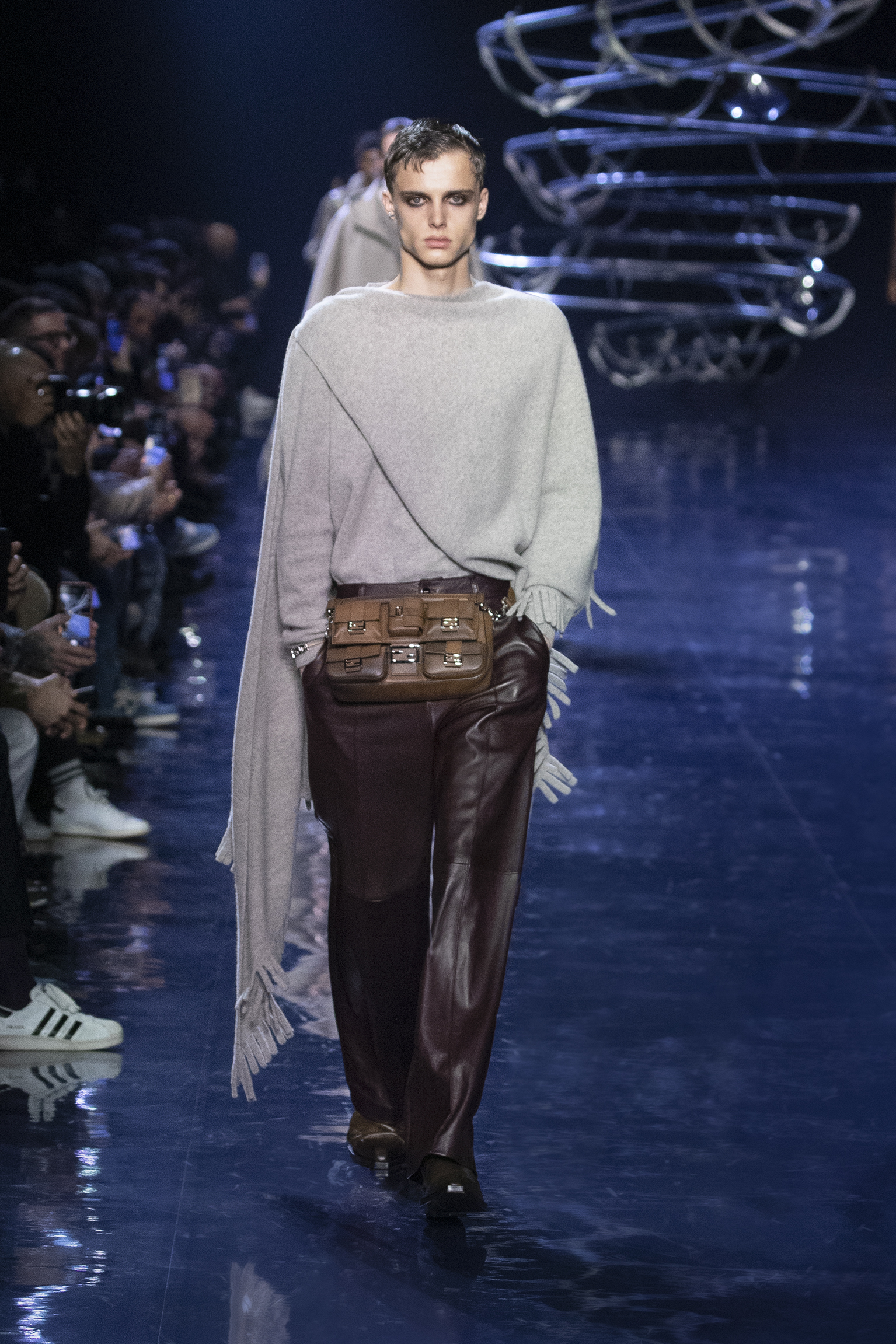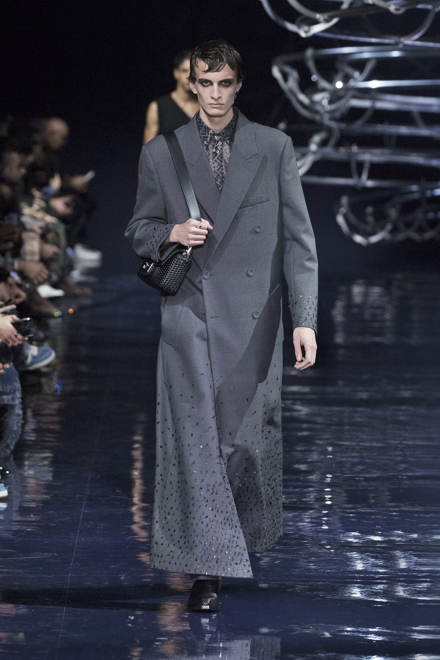 Se déployant en gestes parallèles tout au long de la collection, les vêtements d’extérieur cocooning jouent contre la sensualité des tricots langoureux et des chemises déconstruites pour questionner les limites de l’utilité et de l’artifice. Fermés par des fermetures à glissière O’Lock, les manteaux et les ponchos emmaillotent des survêtements en cachemire côtelé ; les gilets en pull tombent sur l’épaule ; les pantalons fluides sont coupés avec une jupe drapée. Des pardessus à double boutonnage avec des revers en satin, des ourlets frangés ou un éparpillement d’appliqués métalliques en tremblant offrent pureté et rigueur au milieu de silhouettes superposées. silhouettes superposées. Les textures mélangées abondent, du jersey de poil de chameau à la flanelle de laine Shetland, au shearling pulvérisé et à la polaire FF. et la laine polaire FF, tandis que les effets d’ombre créent des finitions antiques dans le cuir ciré et bruni ou le denim surteint. Disparaissant dans une abstraction géométrique, le motif FENDI astuccio est réimaginé en FENDI Shadow, un logo plus grand que nature tissé dans du mohair. plus grand que nature, tissé dans des écharpes en mohair, des couvertures, des doublures à franges et des vêtements à rayures. L’effet est d’une une extravagance subtile : l’homme FENDI dans son élément dans la rue, à la maison ou sur le dancefloor.