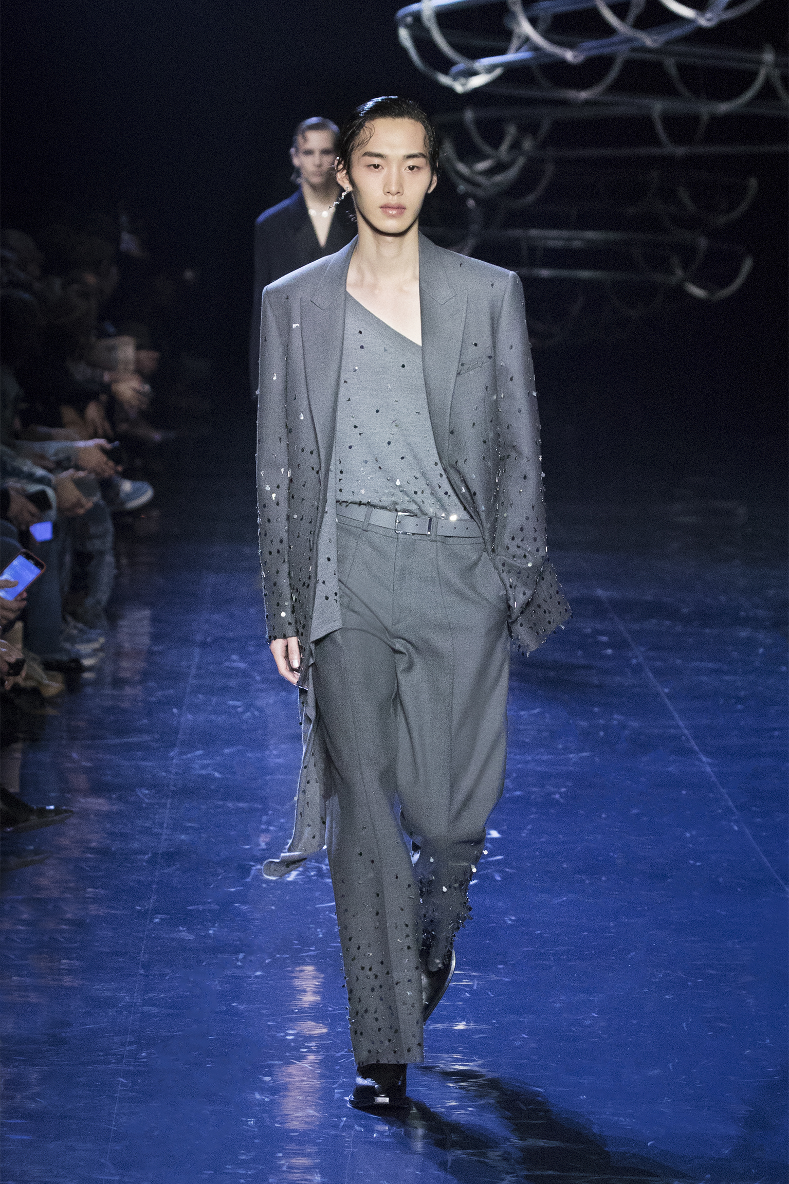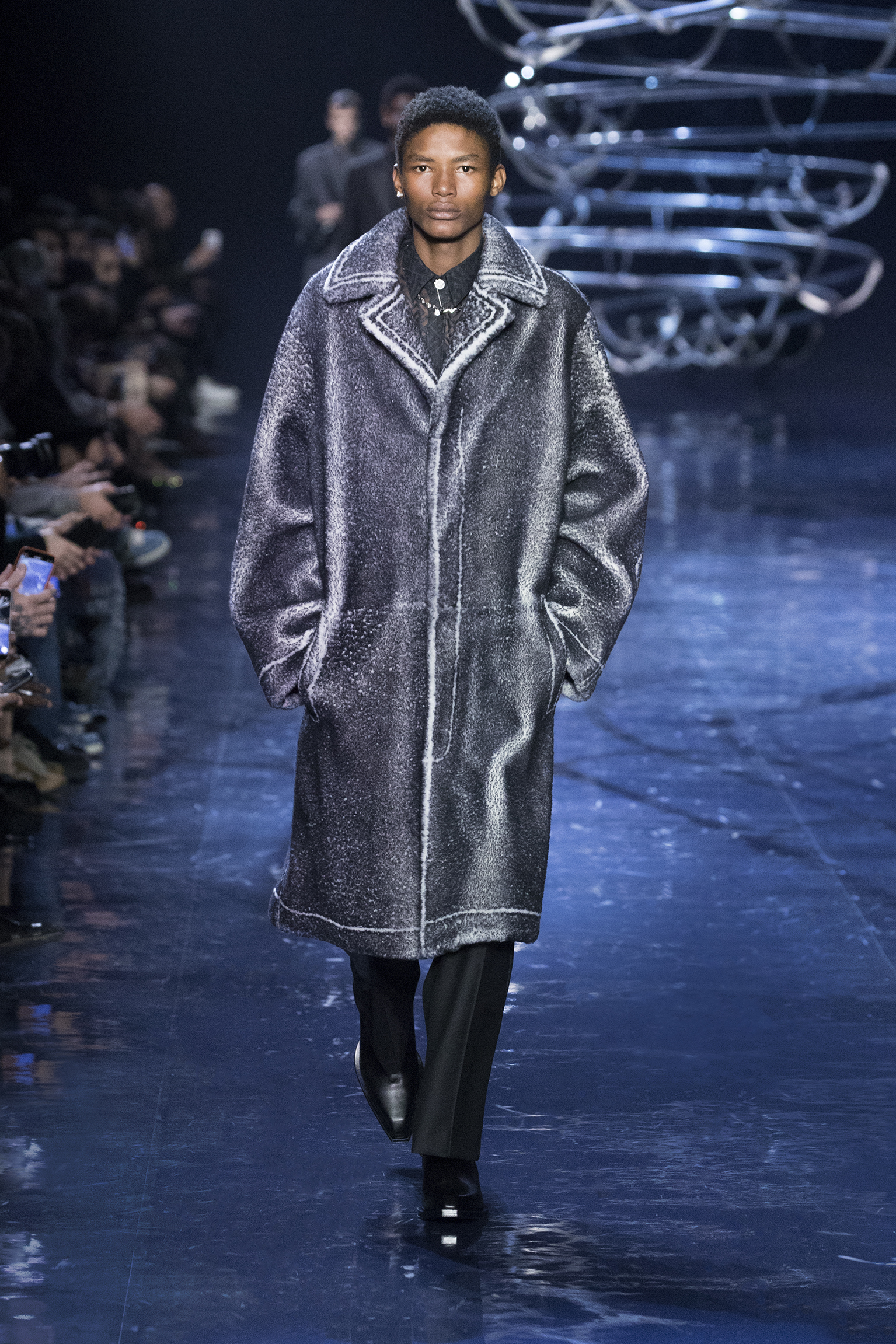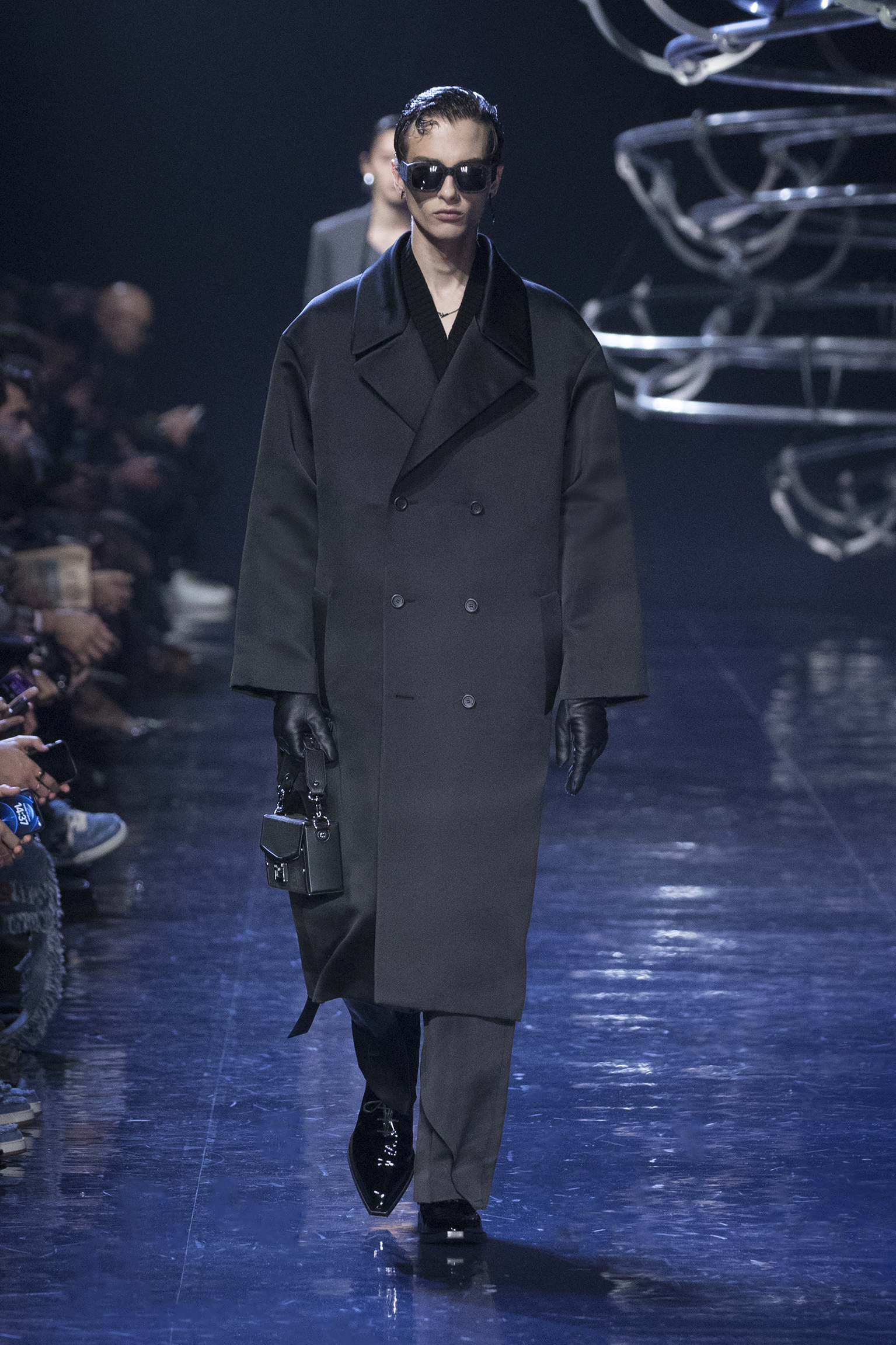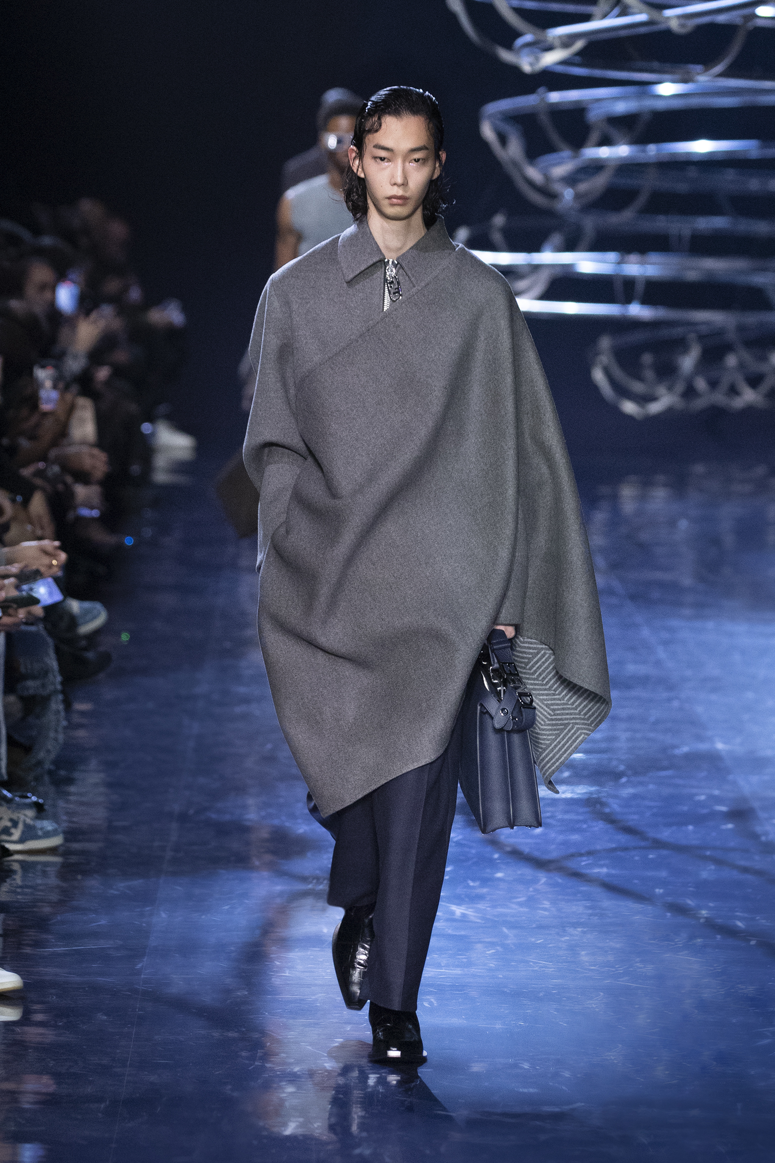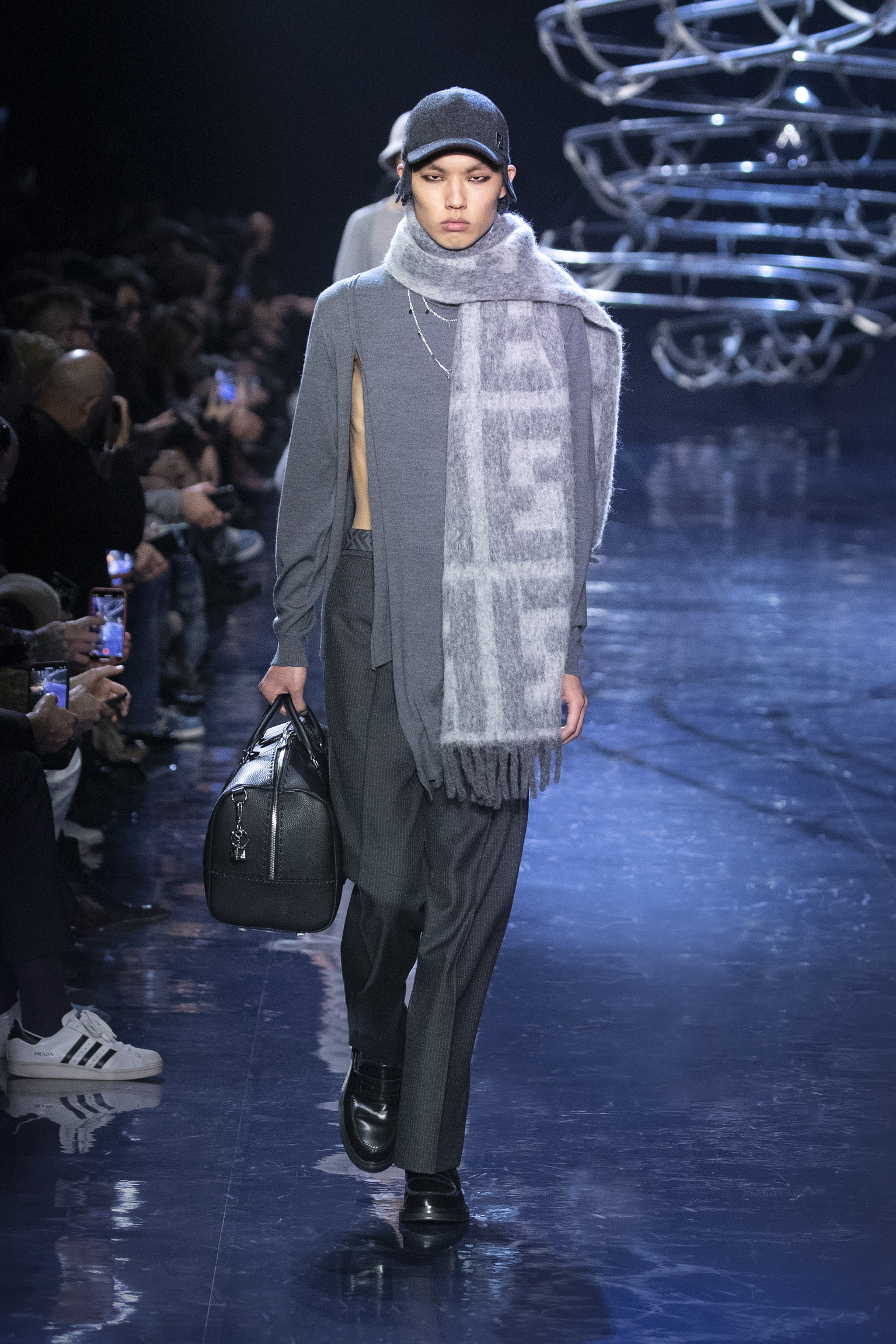 Se déployant en gestes parallèles tout au long de la collection, les vêtements d’extérieur cocooning jouent contre la sensualité des tricots langoureux et des chemises déconstruites pour questionner les limites de l’utilité et de l’artifice. Fermés par des fermetures à glissière O’Lock, les manteaux et les ponchos emmaillotent des survêtements en cachemire côtelé ; les gilets en pull tombent sur l’épaule ; les pantalons fluides sont coupés avec une jupe drapée. Des pardessus à double boutonnage avec des revers en satin, des ourlets frangés ou un éparpillement d’appliqués métalliques en tremblant offrent pureté et rigueur au milieu de silhouettes superposées. silhouettes superposées. Les textures mélangées abondent, du jersey de poil de chameau à la flanelle de laine Shetland, au shearling pulvérisé et à la polaire FF. et la laine polaire FF, tandis que les effets d’ombre créent des finitions antiques dans le cuir ciré et bruni ou le denim surteint. Disparaissant dans une abstraction géométrique, le motif FENDI astuccio est réimaginé en FENDI Shadow, un logo plus grand que nature tissé dans du mohair. plus grand que nature, tissé dans des écharpes en mohair, des couvertures, des doublures à franges et des vêtements à rayures. L’effet est d’une une extravagance subtile : l’homme FENDI dans son élément dans la rue, à la maison ou sur le dancefloor.