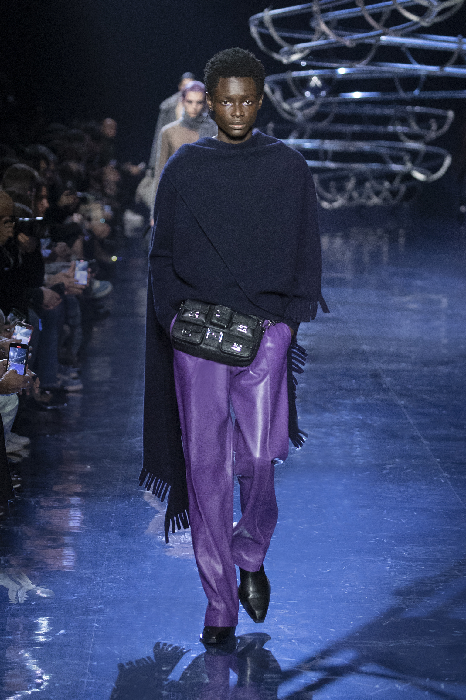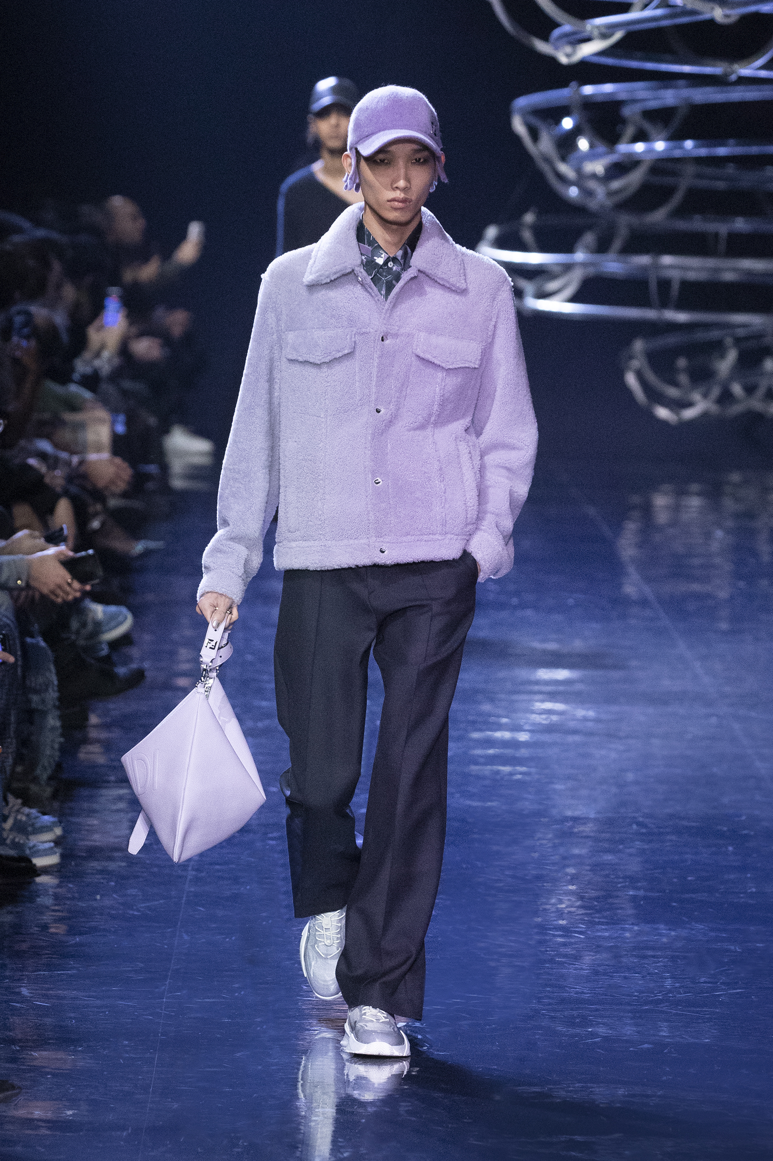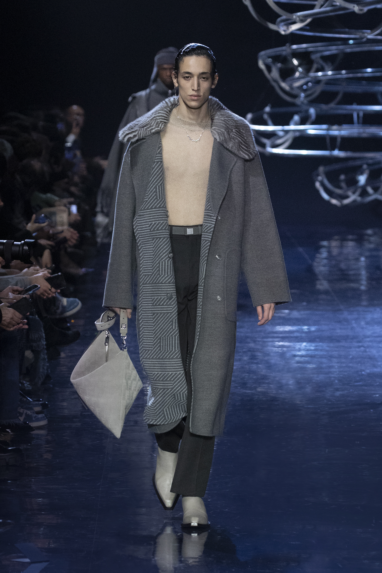 avec géométrie et mouvement, révélant des couches de savoir-faire et des éclats de peau. Célébrant les caractéristiques de la matérialité FENDI, le cachemire double face (et réversible), les cuirs techniques et les soies jacquard sont illuminés par les teintes de boule disco de l’argent, de l’indigo et du violet. Elles soulèvent une palette sobre qui ondule entre des nuances de gris tourterelle, avoine, terre d’ombre brûlée, moka, mauve, lavande, marine profonde et noir.