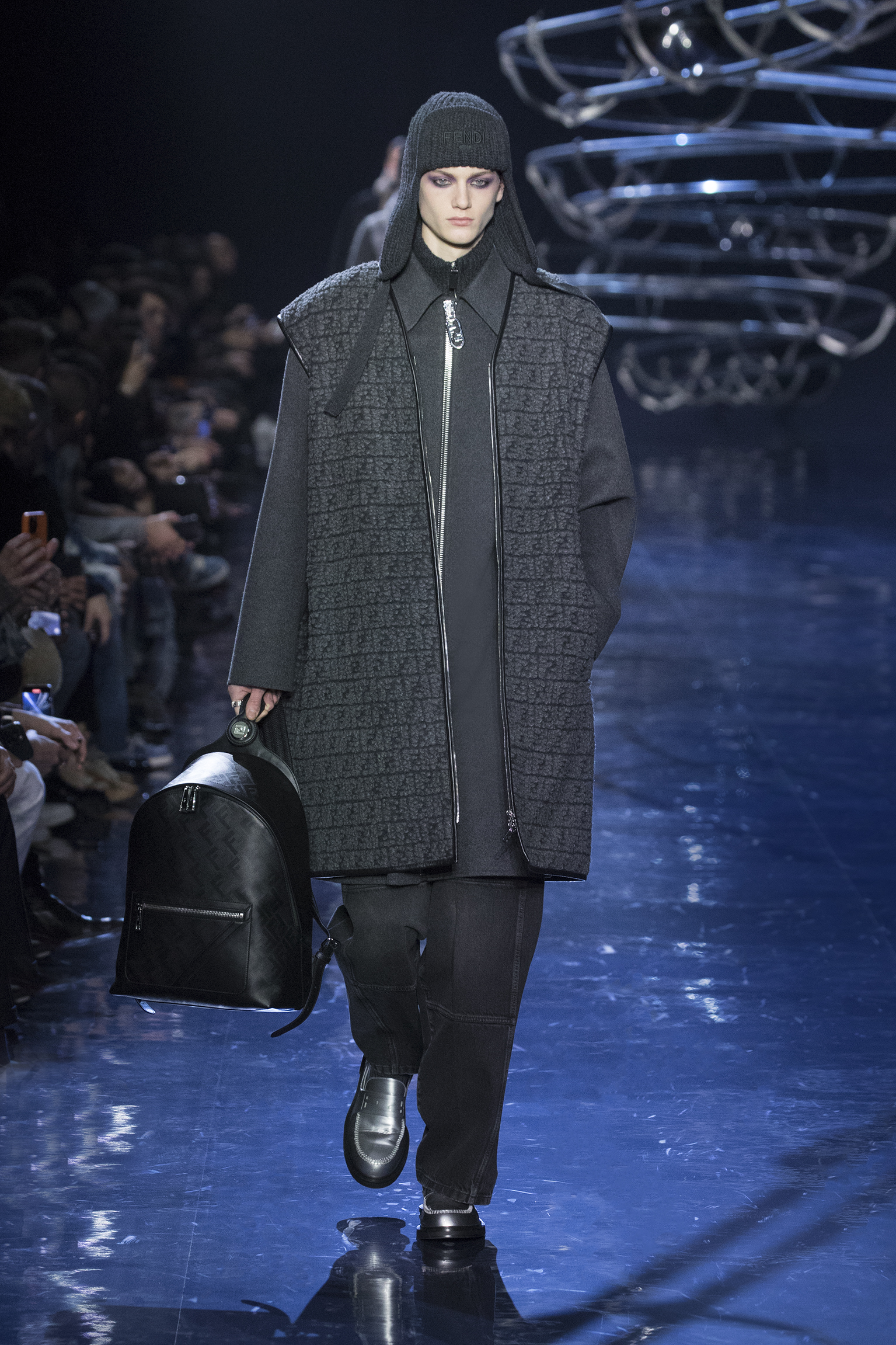 cuir grainé, et les sacs seaux en cachemire FF tissé contiennent des couvertures à franges. Sur le nouveau sac à dos Chiodo, les sangles ergonomiques pivotent sur une charnière métallique, créant un design futuriste lorsqu’elles sont associées au cuir noir Shadow de FENDI. cuir noir FENDI Shadow.