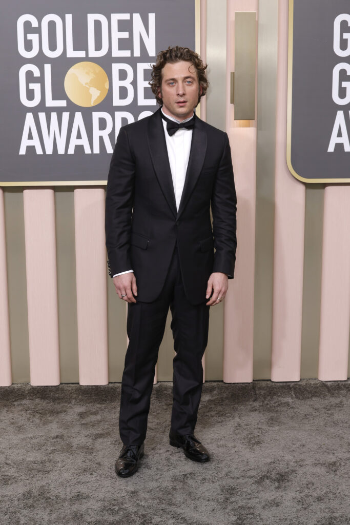 Jeremy Allen White wore a Dior men’s collection black wool and silk shawl collar tuxedo, white cotton tuxedo shirt, black silk bow tie, and black leather derbies.