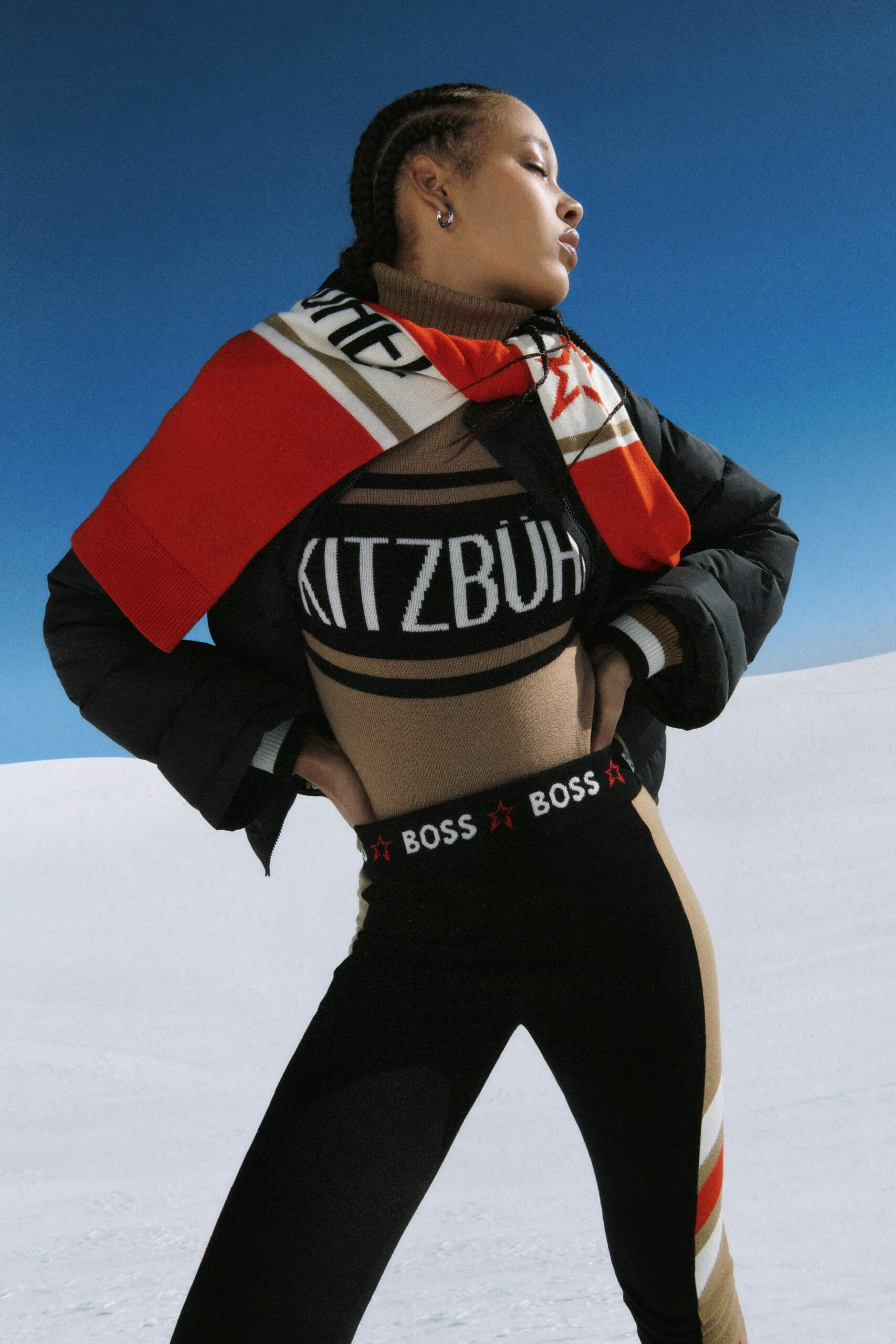 Plusieurs pièces arborent le monogramme BOSS superposé à l’étoile polaire graphique de PERFECT MOMENT. Les pulls à slogan des stations de ski de PERFECT MOMENT ont été réimaginés avec le logo BOSS et le nom « Kitzbühel », le site autrichien des légendaires courses de Hahnenkamm, dont BOSS est le partenaire principal.