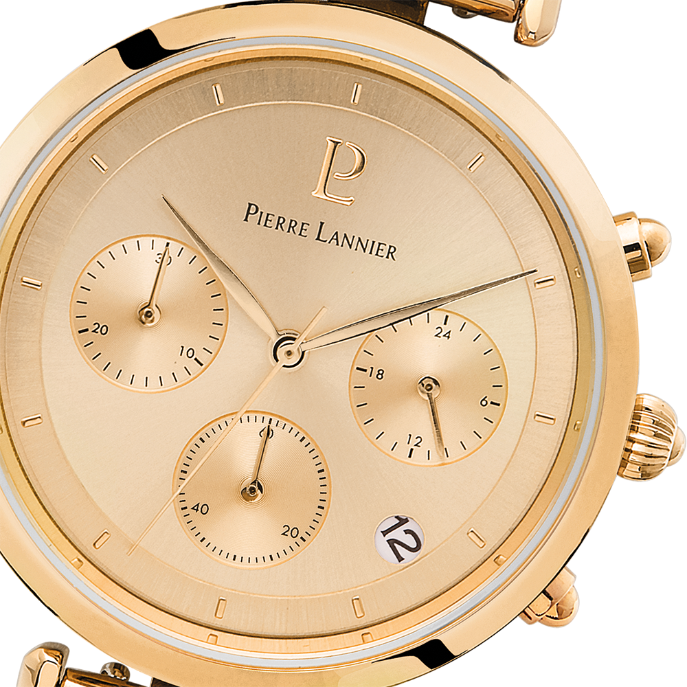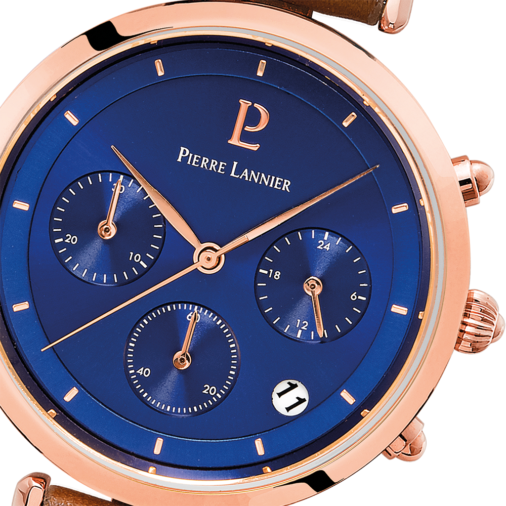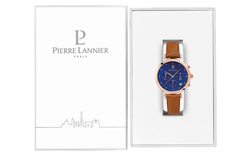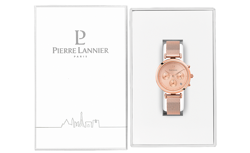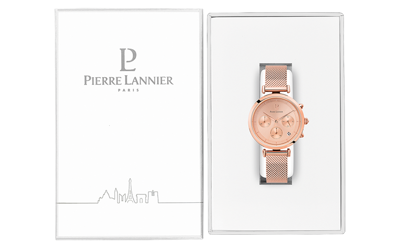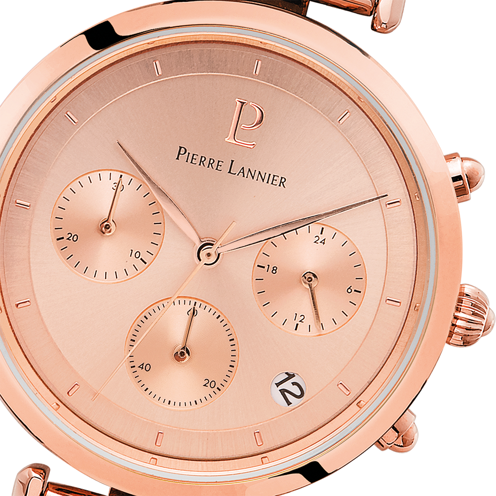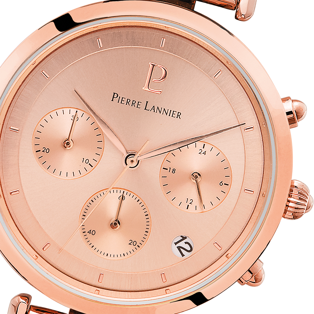 Evoquant l’univers Art Déco et l’emblématique hôtel parisien, la ligne LUTECIA est ponctuée par 3 guichets situés au centre du cadran et indiquant sa fonction chronographe. Son élégance est mise en avant grâce à des jeux de brillance, de lumière et de texture. Lutecia, le premier chronographe pour femme de Pierre Lannier La discrétion des index et des minuteries de cette montre met en avant les jeux de brillance des cadrans et des compteurs soleillés. Les poussoirs, la couronne ainsi que le dateur sont tout en rondeur et créent une harmonie avec des aiguilles en forme de feuille.