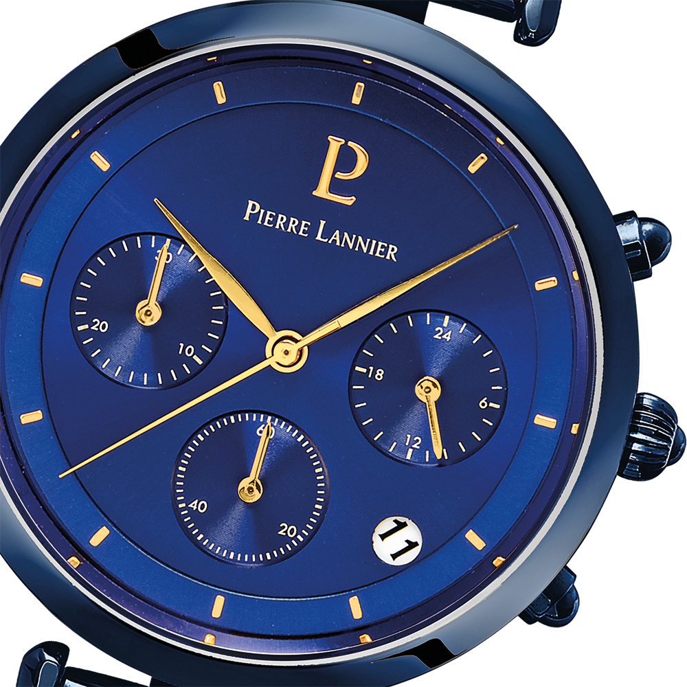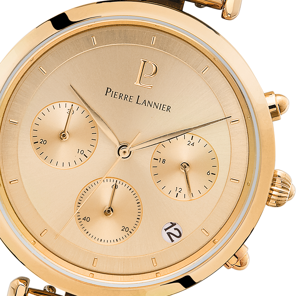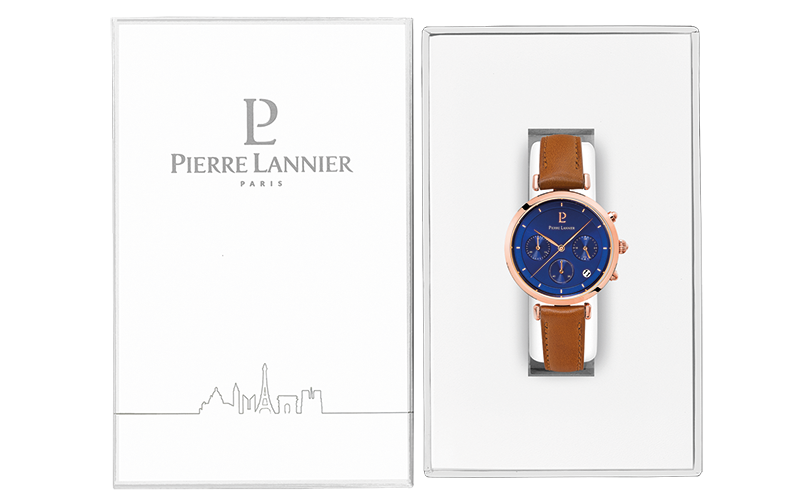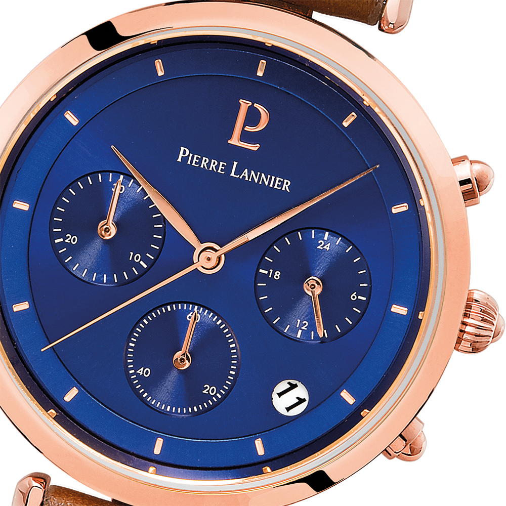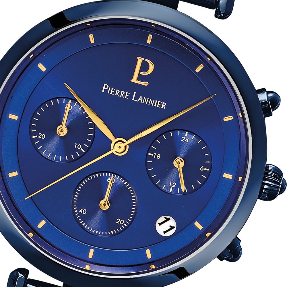 Evoquant l’univers Art Déco et l’emblématique hôtel parisien, la ligne LUTECIA est ponctuée par 3 guichets situés au centre du cadran et indiquant sa fonction chronographe. Son élégance est mise en avant grâce à des jeux de brillance, de lumière et de texture. Lutecia, le premier chronographe pour femme de Pierre Lannier La discrétion des index et des minuteries de cette montre met en avant les jeux de brillance des cadrans et des compteurs soleillés. Les poussoirs, la couronne ainsi que le dateur sont tout en rondeur et créent une harmonie avec des aiguilles en forme de feuille.