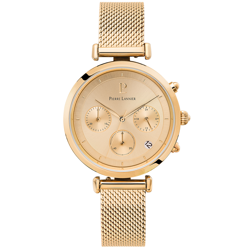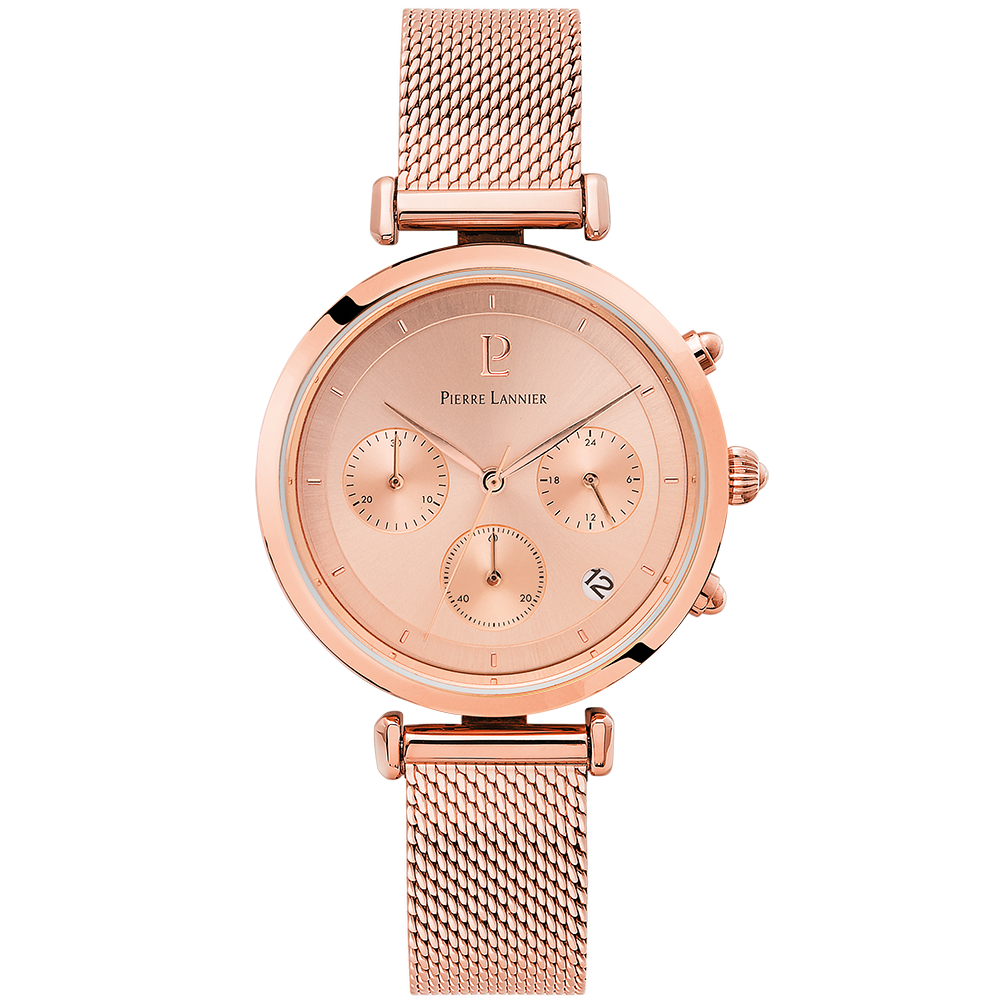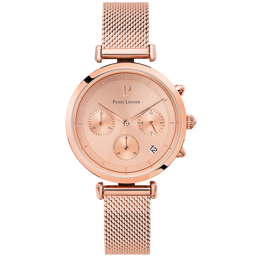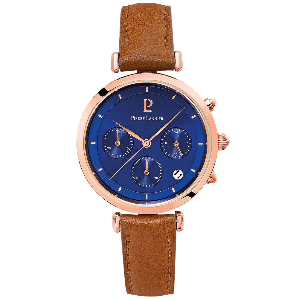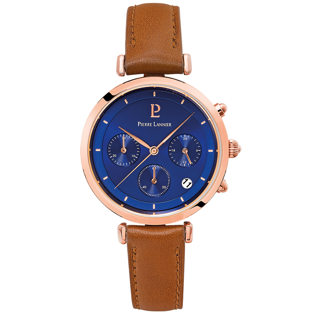 Evoquant l’univers Art Déco et l’emblématique hôtel parisien, la ligne LUTECIA est ponctuée par 3 guichets situés au centre du cadran et indiquant sa fonction chronographe. Son élégance est mise en avant grâce à des jeux de brillance, de lumière et de texture. Lutecia, le premier chronographe pour femme de Pierre Lannier La discrétion des index et des minuteries de cette montre met en avant les jeux de brillance des cadrans et des compteurs soleillés. Les poussoirs, la couronne ainsi que le dateur sont tout en rondeur et créent une harmonie avec des aiguilles en forme de feuille.