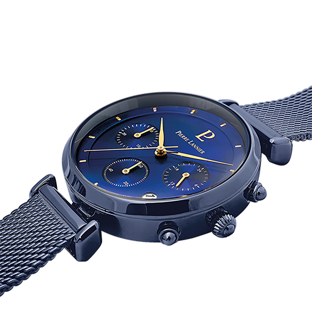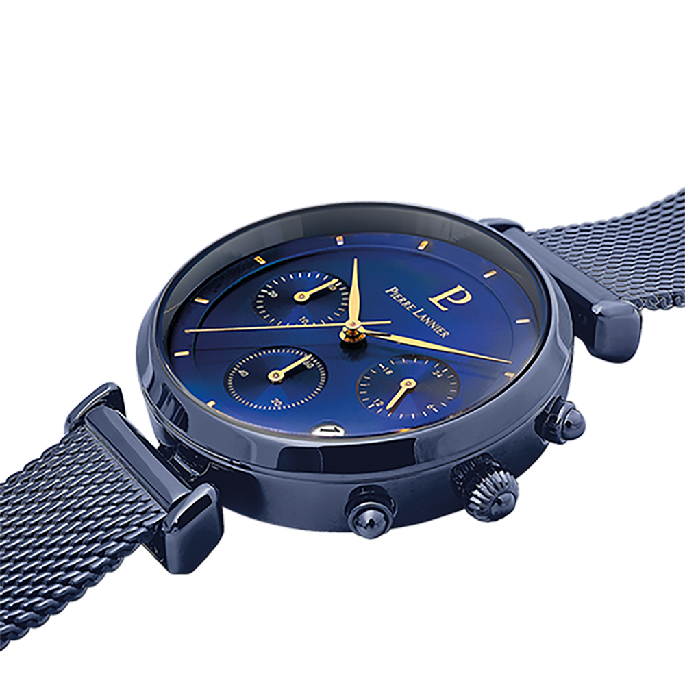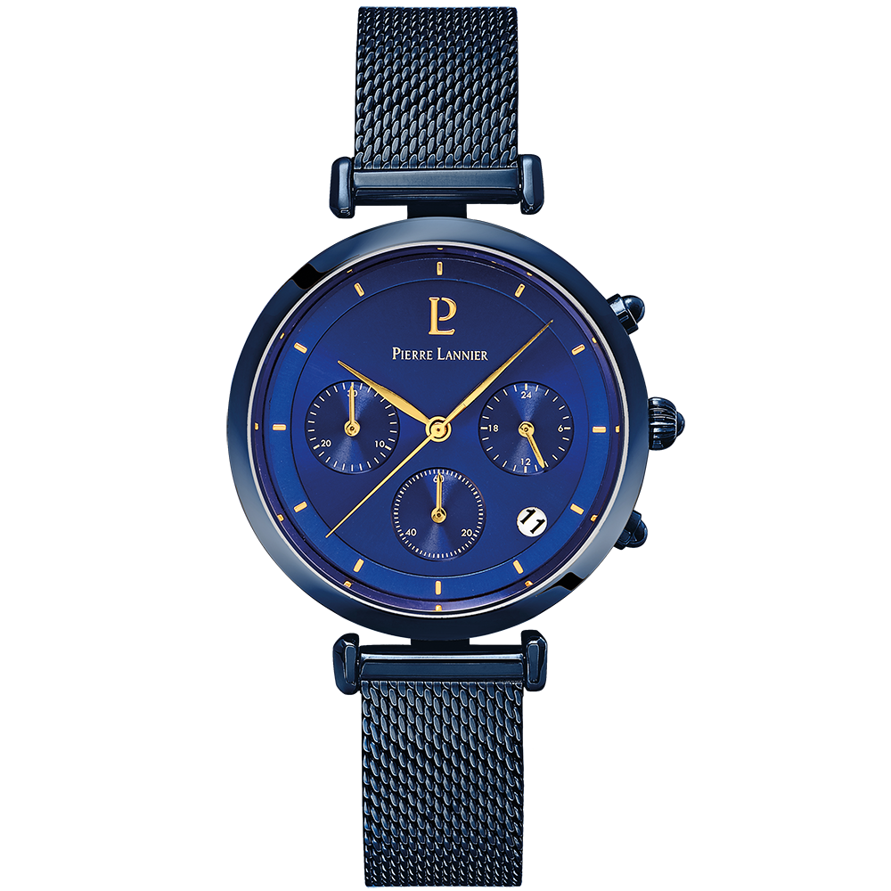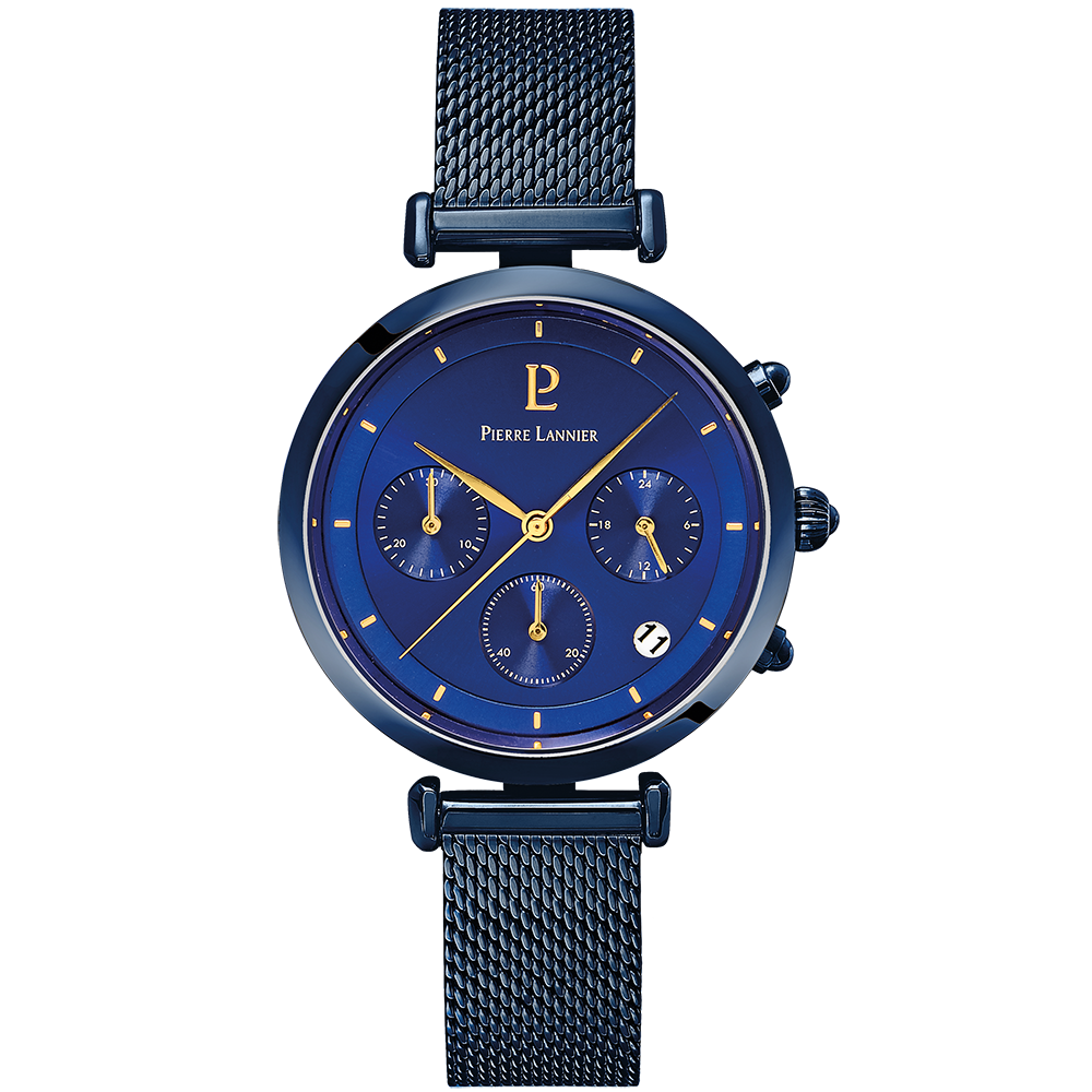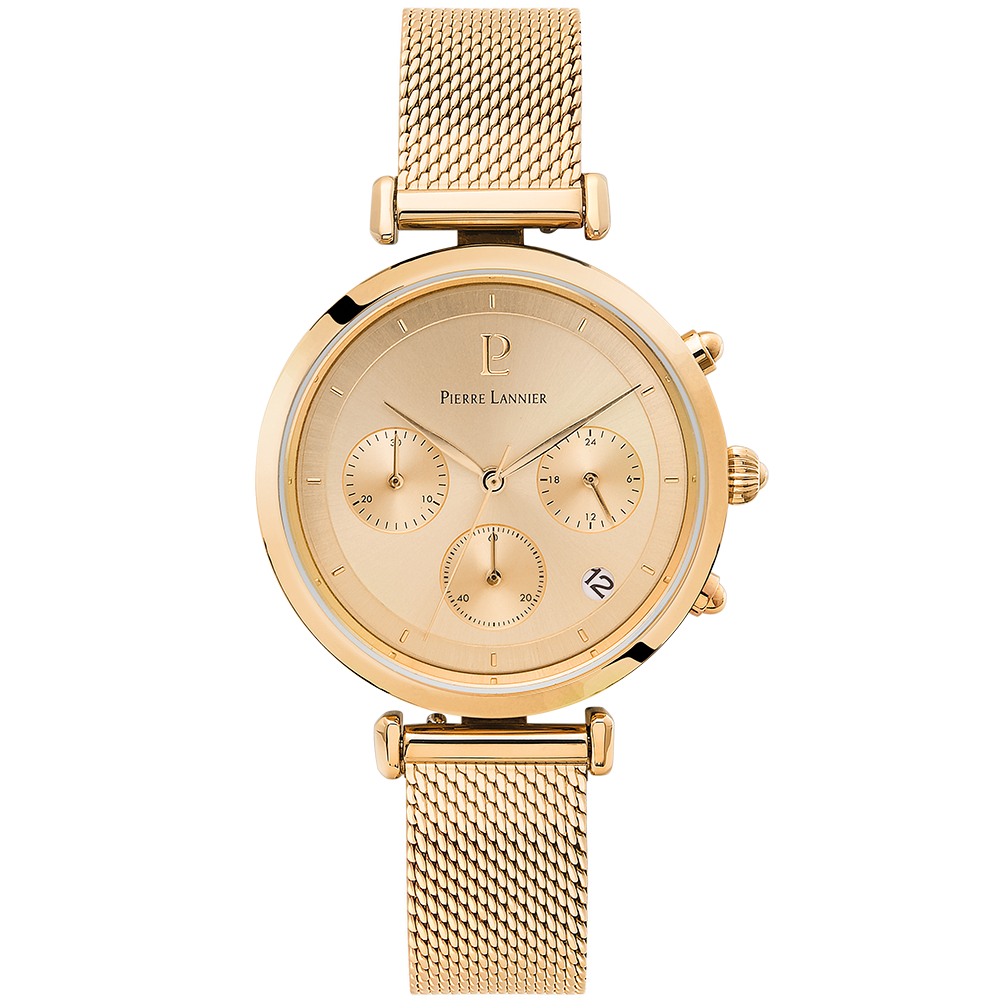 Evoquant l’univers Art Déco et l’emblématique hôtel parisien, la ligne LUTECIA est ponctuée par 3 guichets situés au centre du cadran et indiquant sa fonction chronographe. Son élégance est mise en avant grâce à des jeux de brillance, de lumière et de texture. Lutecia, le premier chronographe pour femme de Pierre Lannier La discrétion des index et des minuteries de cette montre met en avant les jeux de brillance des cadrans et des compteurs soleillés. Les poussoirs, la couronne ainsi que le dateur sont tout en rondeur et créent une harmonie avec des aiguilles en forme de feuille.