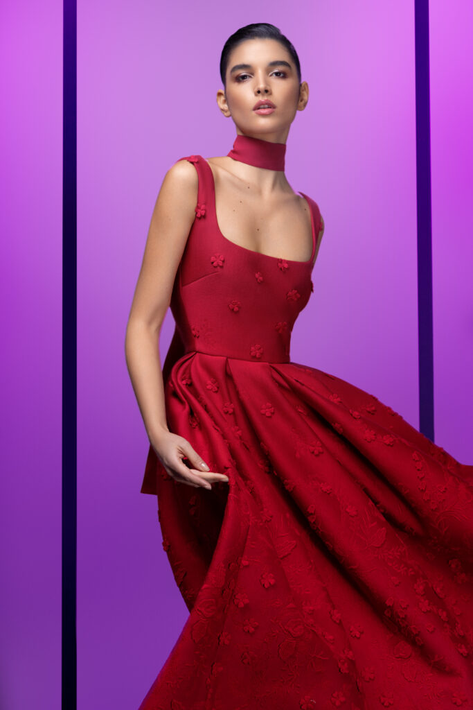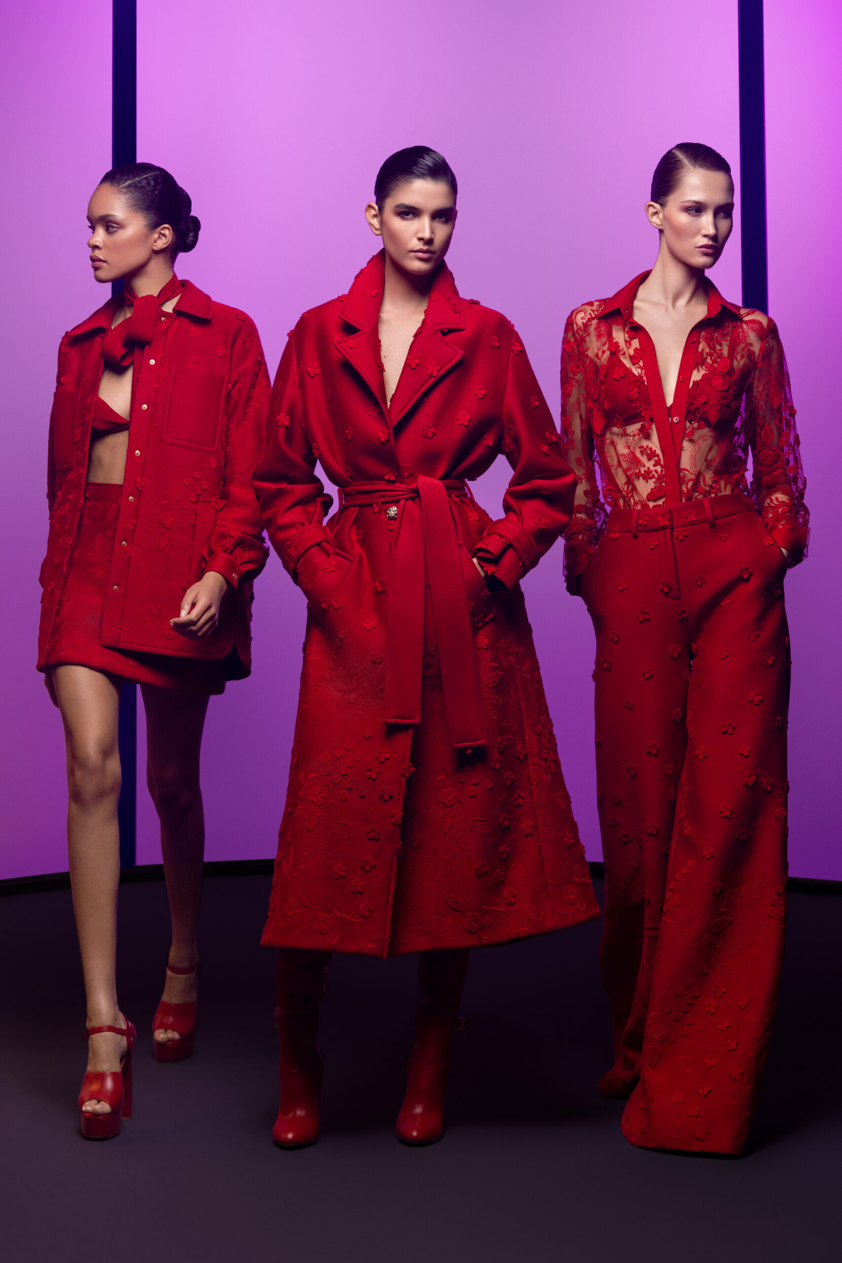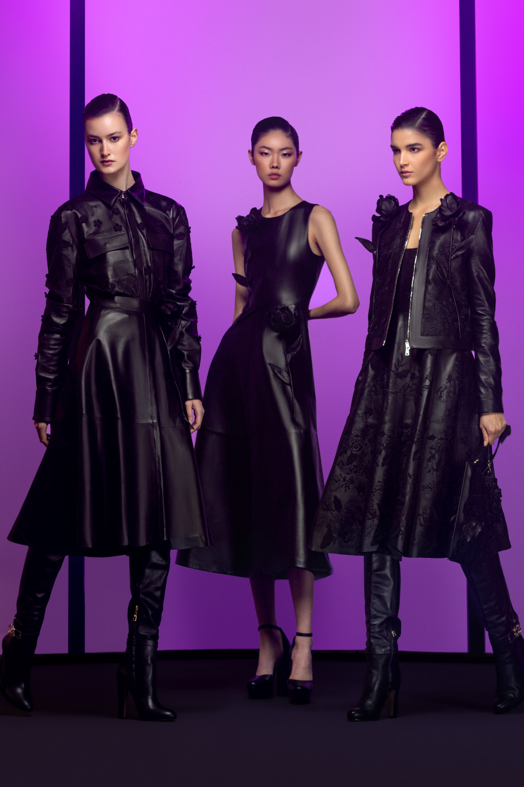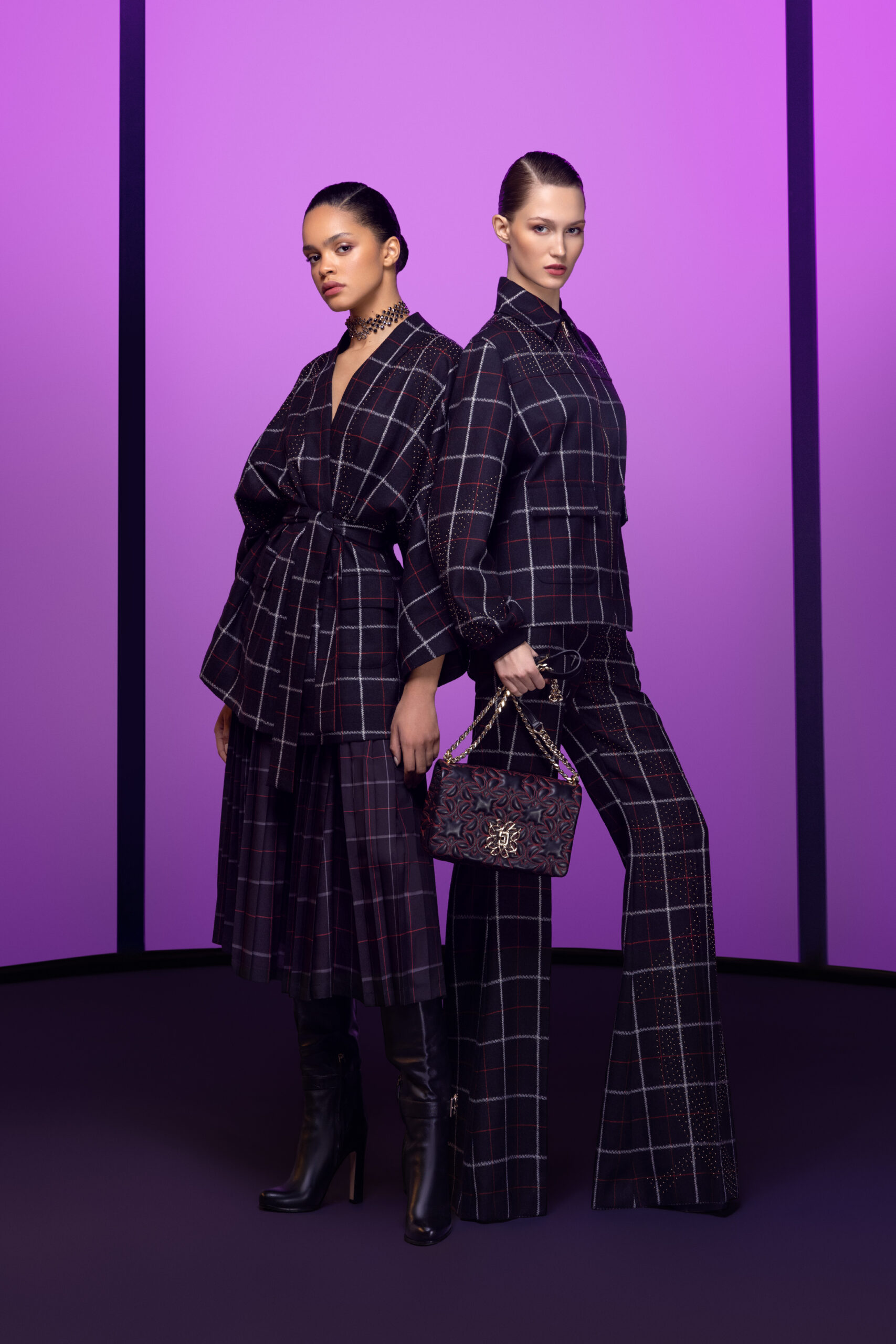 Cette collection d’expressions sombres et sophistiquées évoque une allure captivante, une opulence somptueuse et une puissance pure dans le moment présent. Des touches vives de couleurs saturées ajoutent des brins de brillance à des silhouettes fortes dans des nuances dominantes de noir. Comme des éclats d’exaltation, les paillettes Sangria et Purple Magic éclaboussent les costumes brodés de tulle. Dans le même souffle, Fanfare Aqua et une touche de Nautical Blue tombent en cascade sur des robes bustier et des robes à col en V plongeant, illuminant des lignes plus définies. Des boutons floraux parsèment les mini-jupes en scuba New Red et les chemises en coton Moonflower White, tandis qu’un feuillage tridimensionnel s’épanouit dans les chemises en cuir boxy et les jupes A-line assorties. Des monogrammes géométriques brodés s’enfilent avec jeunesse sur des jupes en denim structurées, soulignant les contours par des illusions de mouvement.