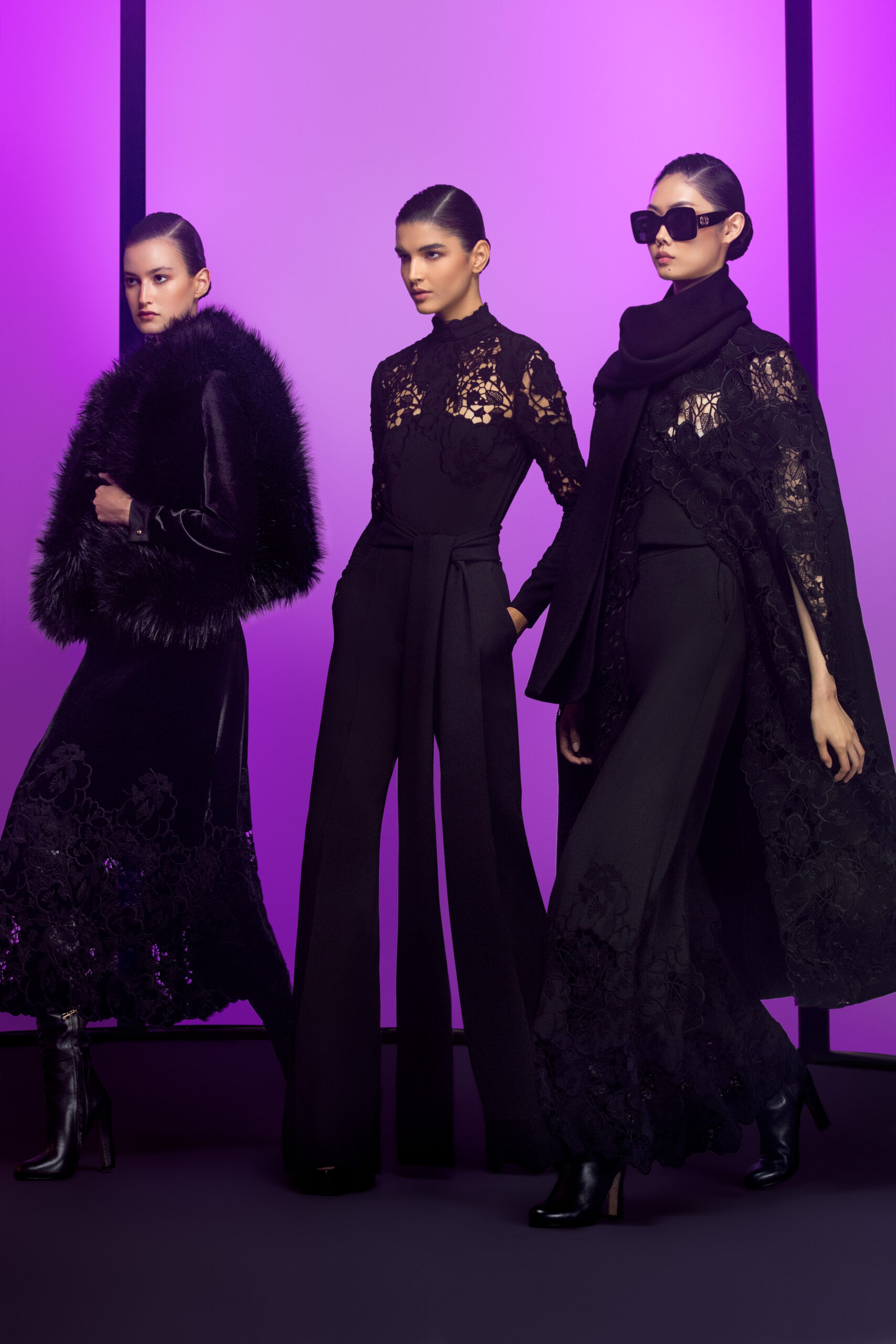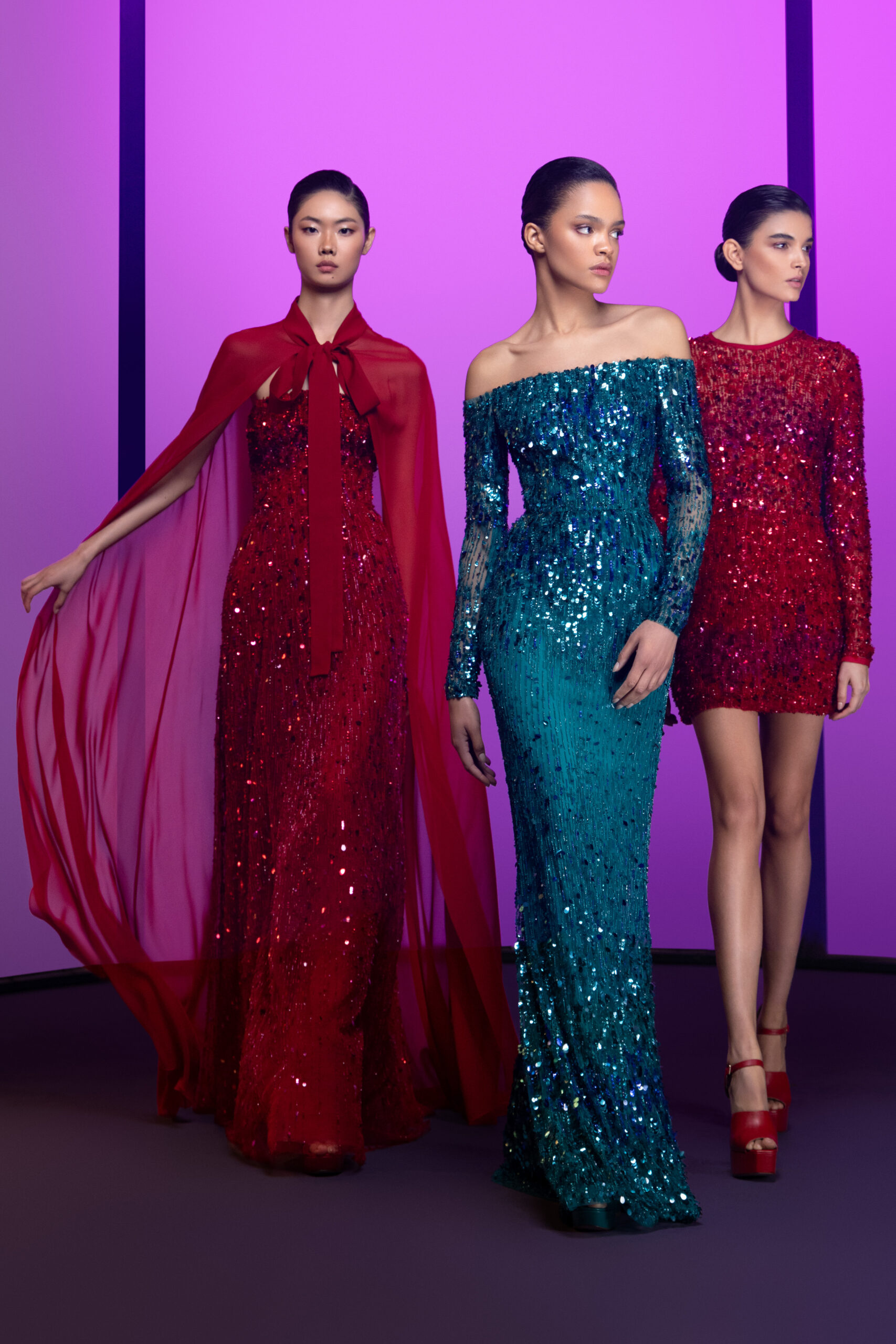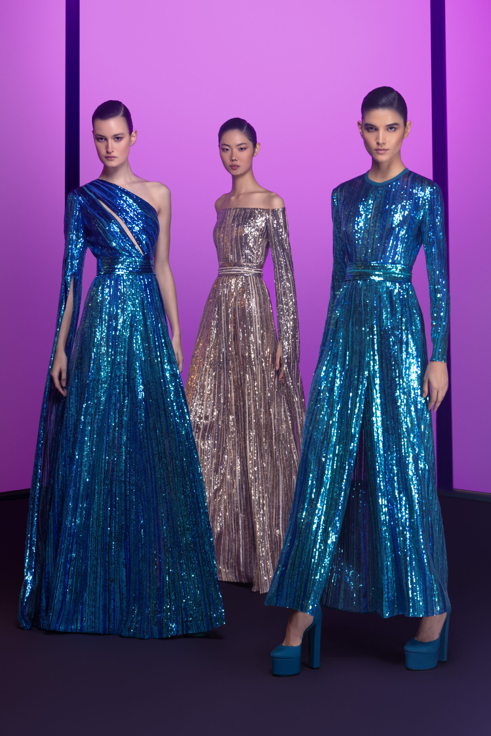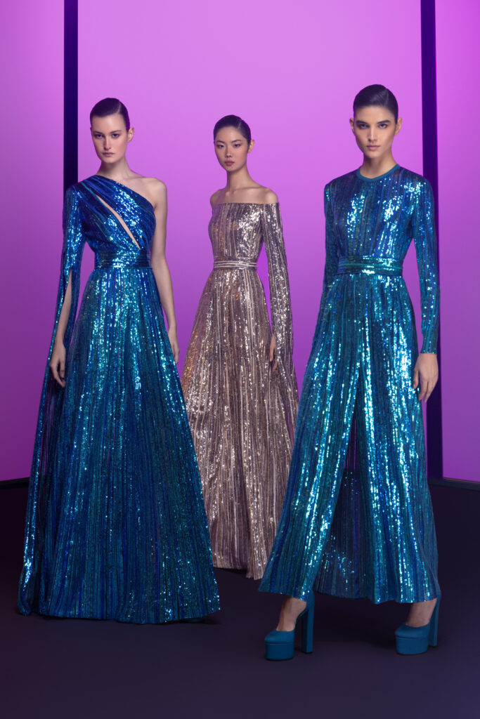 s’assemblent pour donner naissance à de somptueuses combinaisons à col roulé et à de longues robes sirènes symétriques en forme de A qui scintillent et brillent comme les profondeurs de la nuit. Les robes de cocktail essentielles en crêpe cady d’ELIE SAAB et les robes moulantes s’étendent en tourbillons volumineux et décolletés. Les embellissements volumineux sont équilibrés par des découpes frappantes et la quintessence de la taille cintrée.