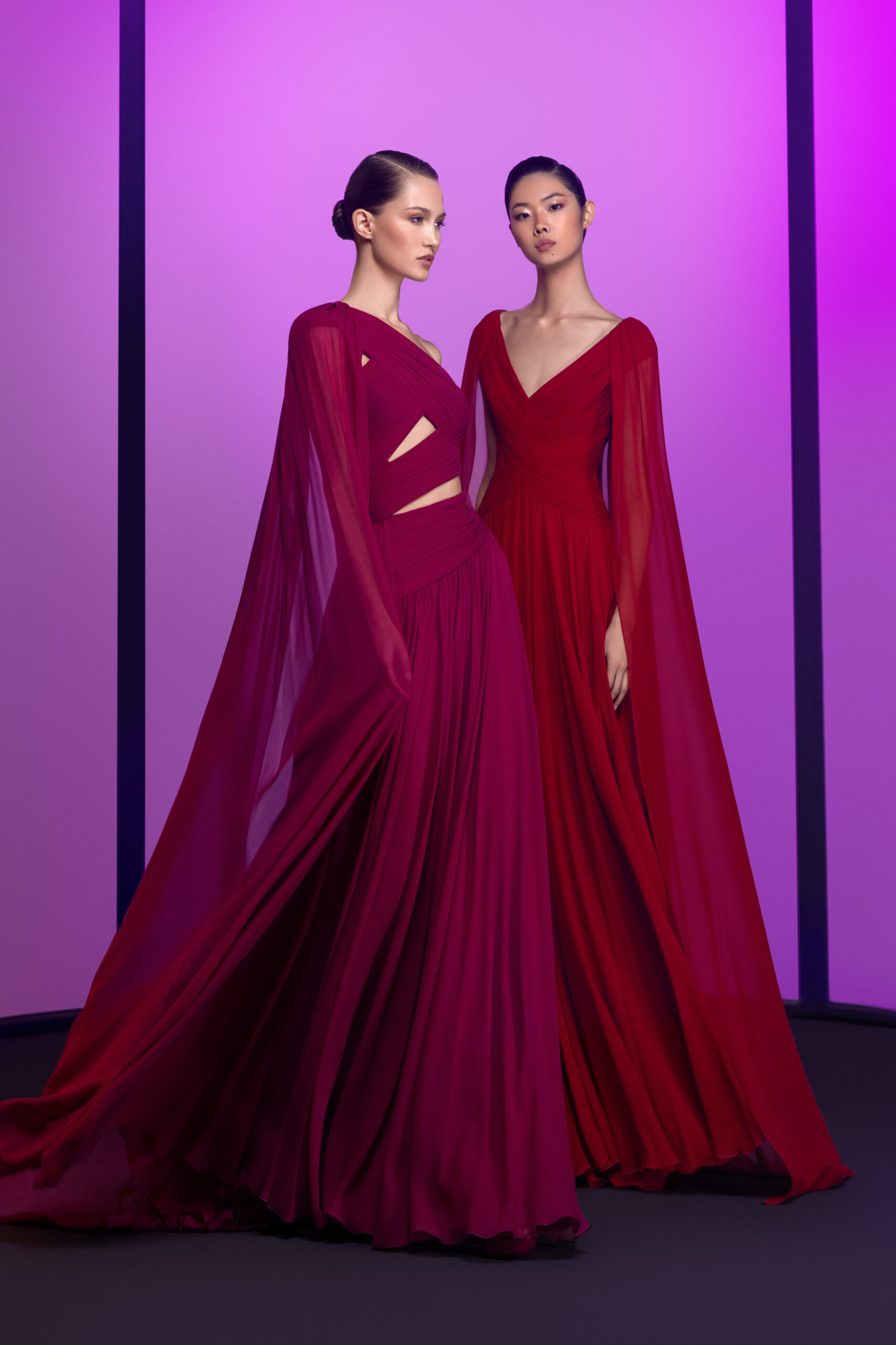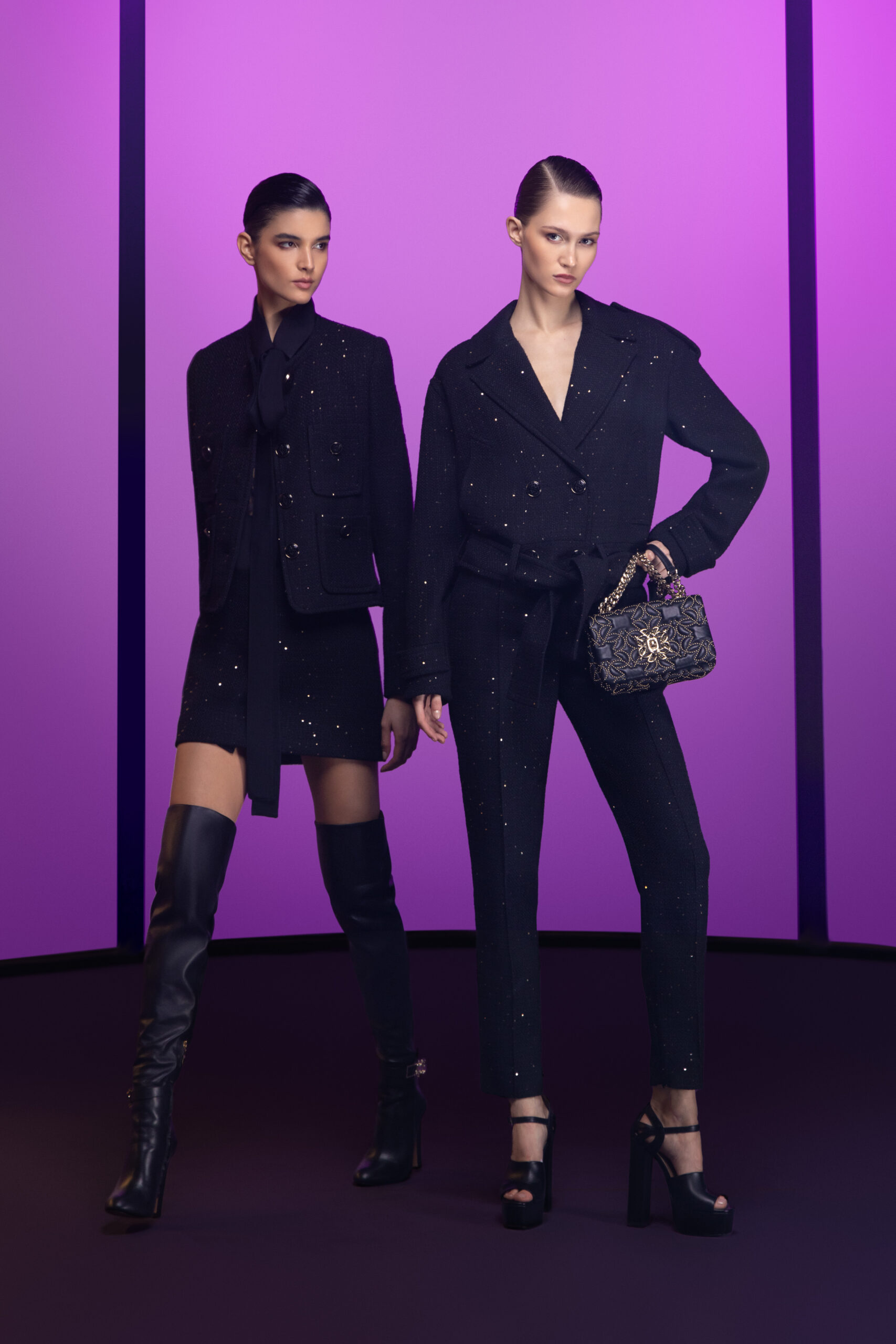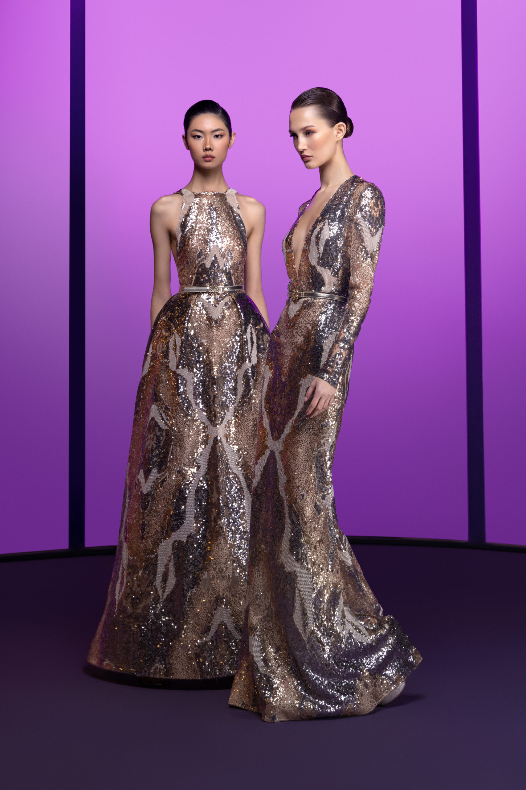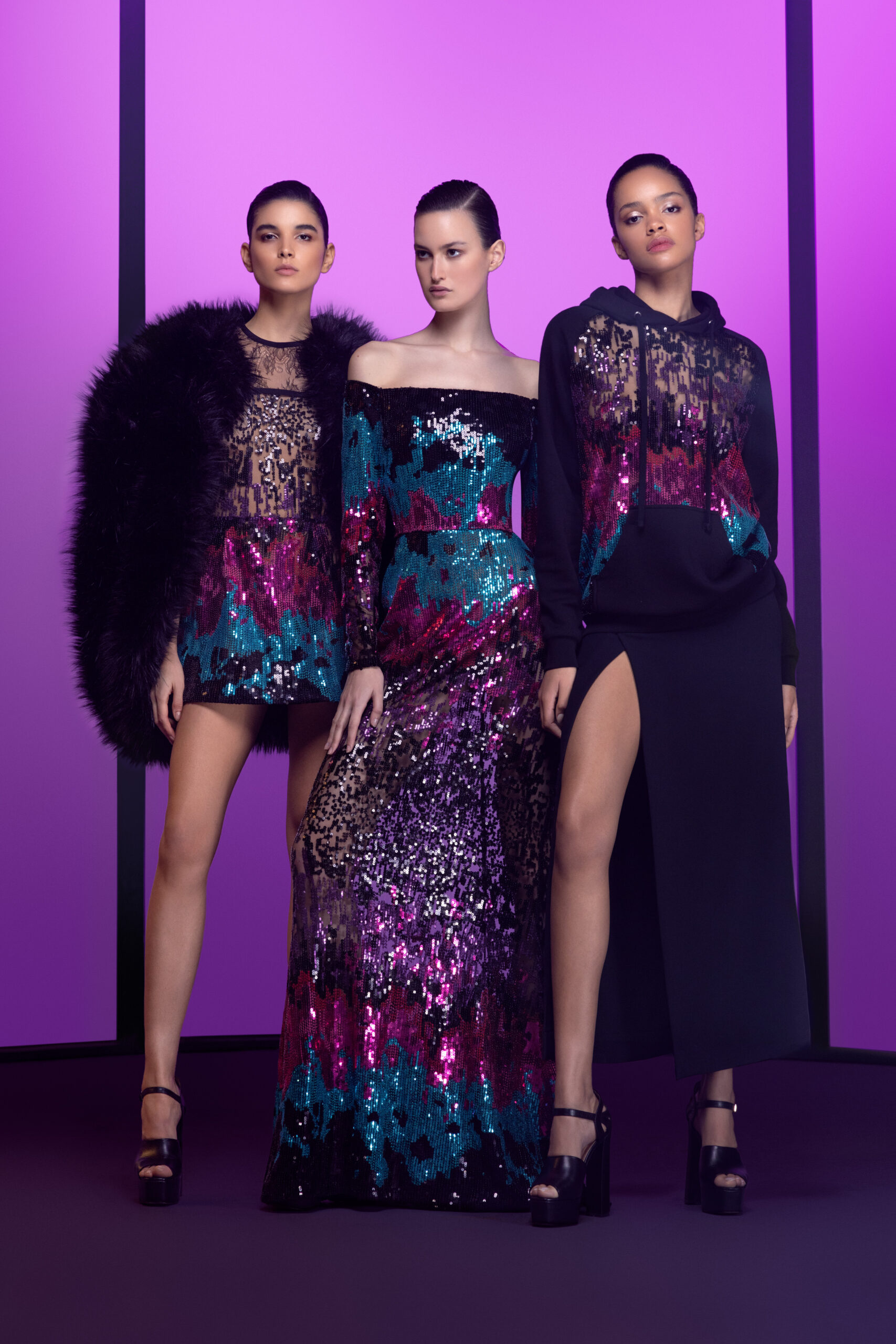 s’assemblent pour donner naissance à de somptueuses combinaisons à col roulé et à de longues robes sirènes symétriques en forme de A qui scintillent et brillent comme les profondeurs de la nuit. Les robes de cocktail essentielles en crêpe cady d’ELIE SAAB et les robes moulantes s’étendent en tourbillons volumineux et décolletés. Les embellissements volumineux sont équilibrés par des découpes frappantes et la quintessence de la taille cintrée.