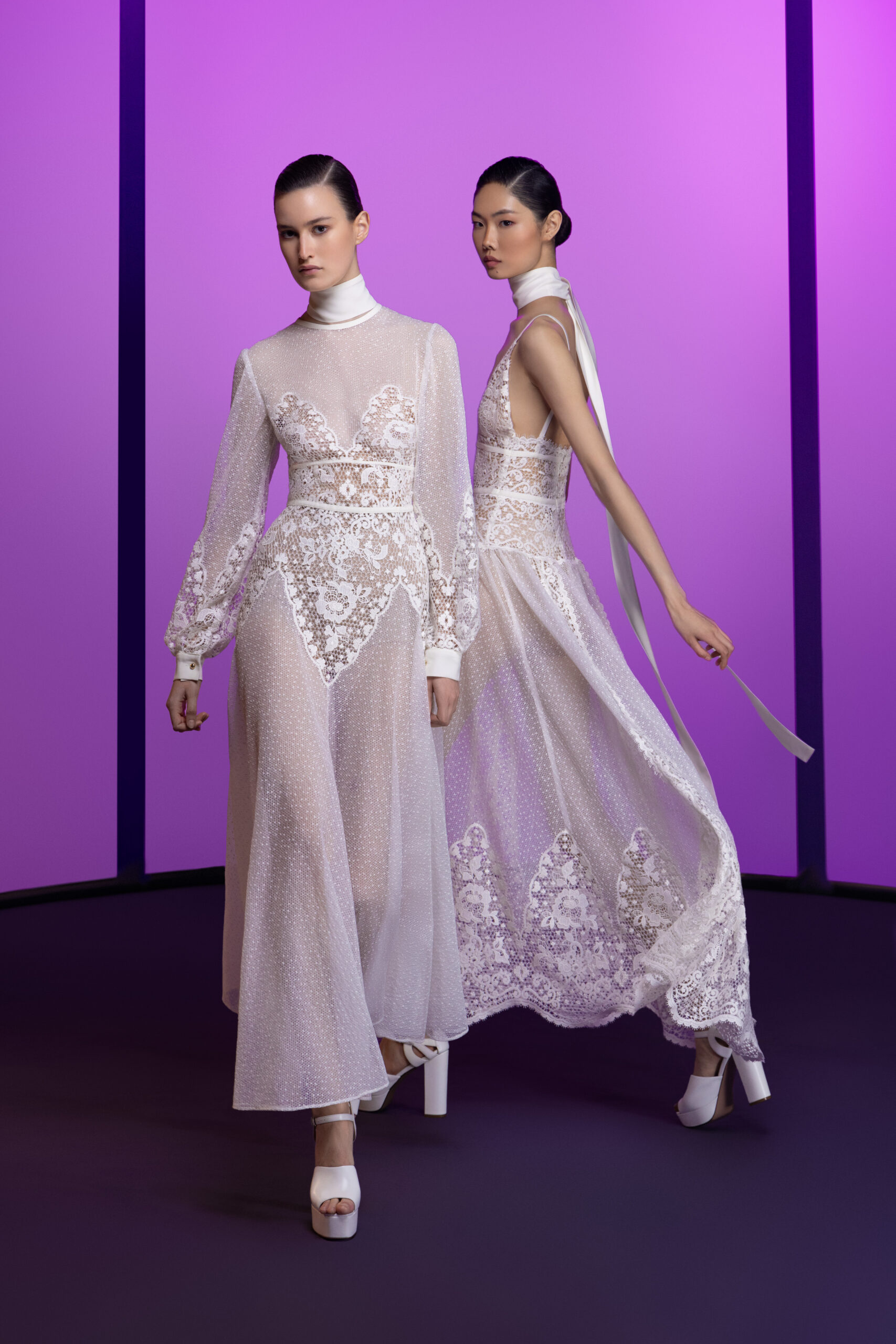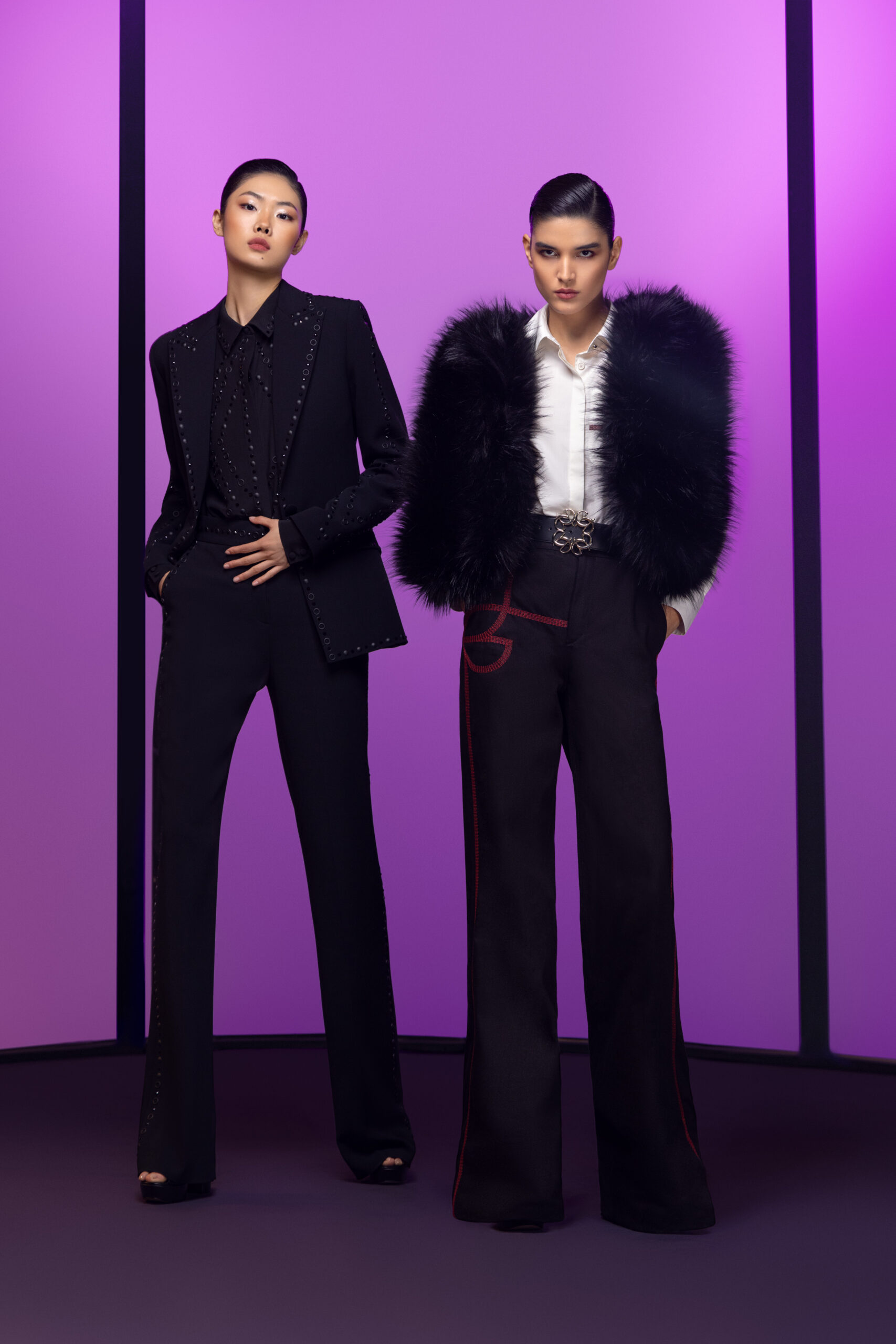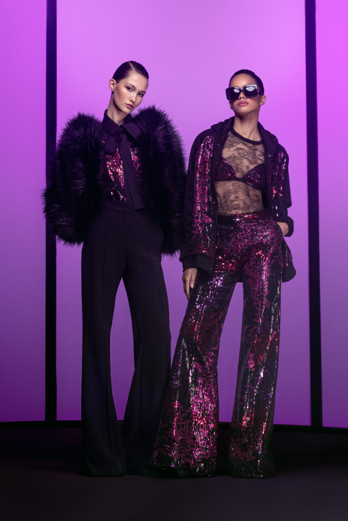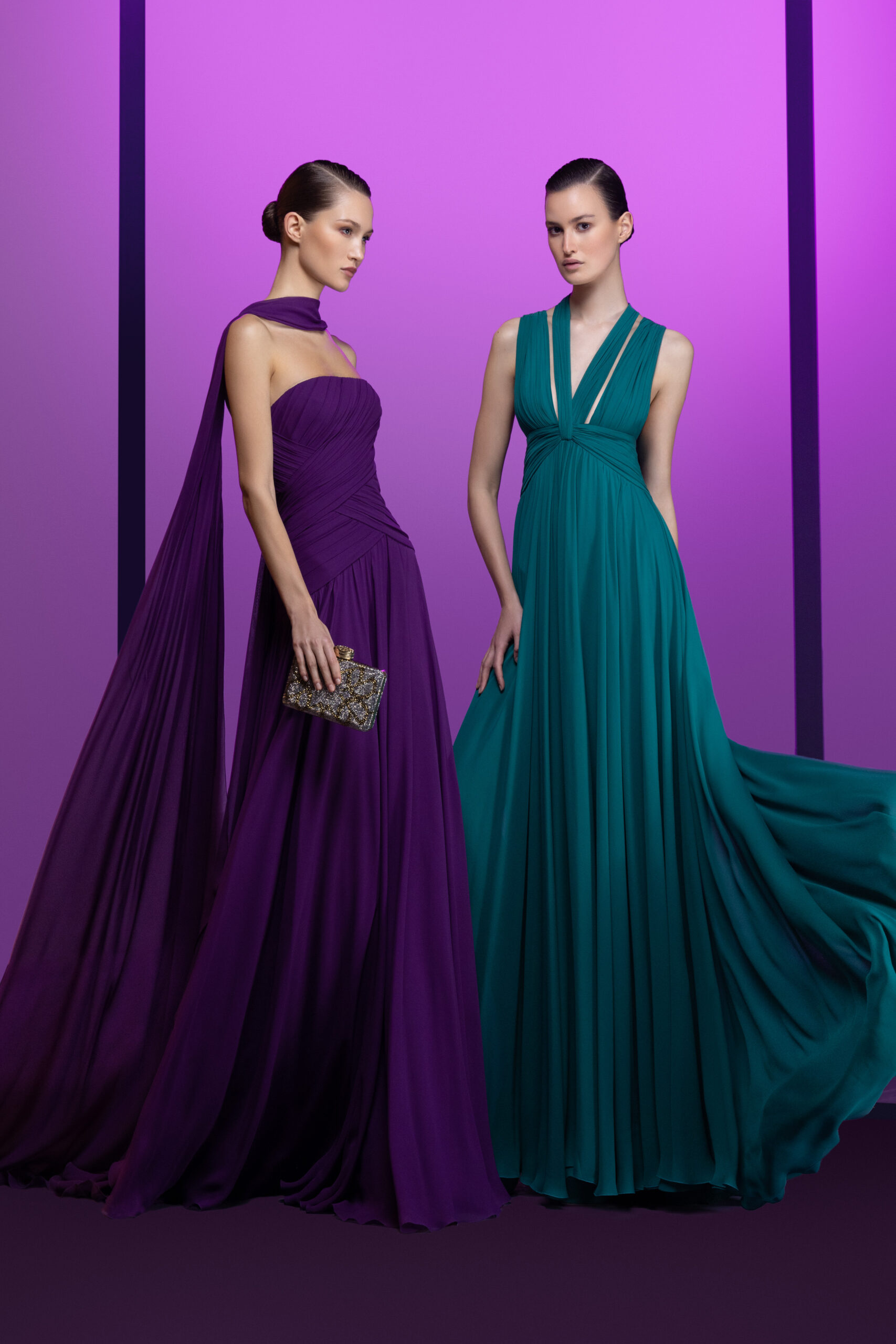 s’assemblent pour donner naissance à de somptueuses combinaisons à col roulé et à de longues robes sirènes symétriques en forme de A qui scintillent et brillent comme les profondeurs de la nuit. Les robes de cocktail essentielles en crêpe cady d’ELIE SAAB et les robes moulantes s’étendent en tourbillons volumineux et décolletés. Les embellissements volumineux sont équilibrés par des découpes frappantes et la quintessence de la taille cintrée.