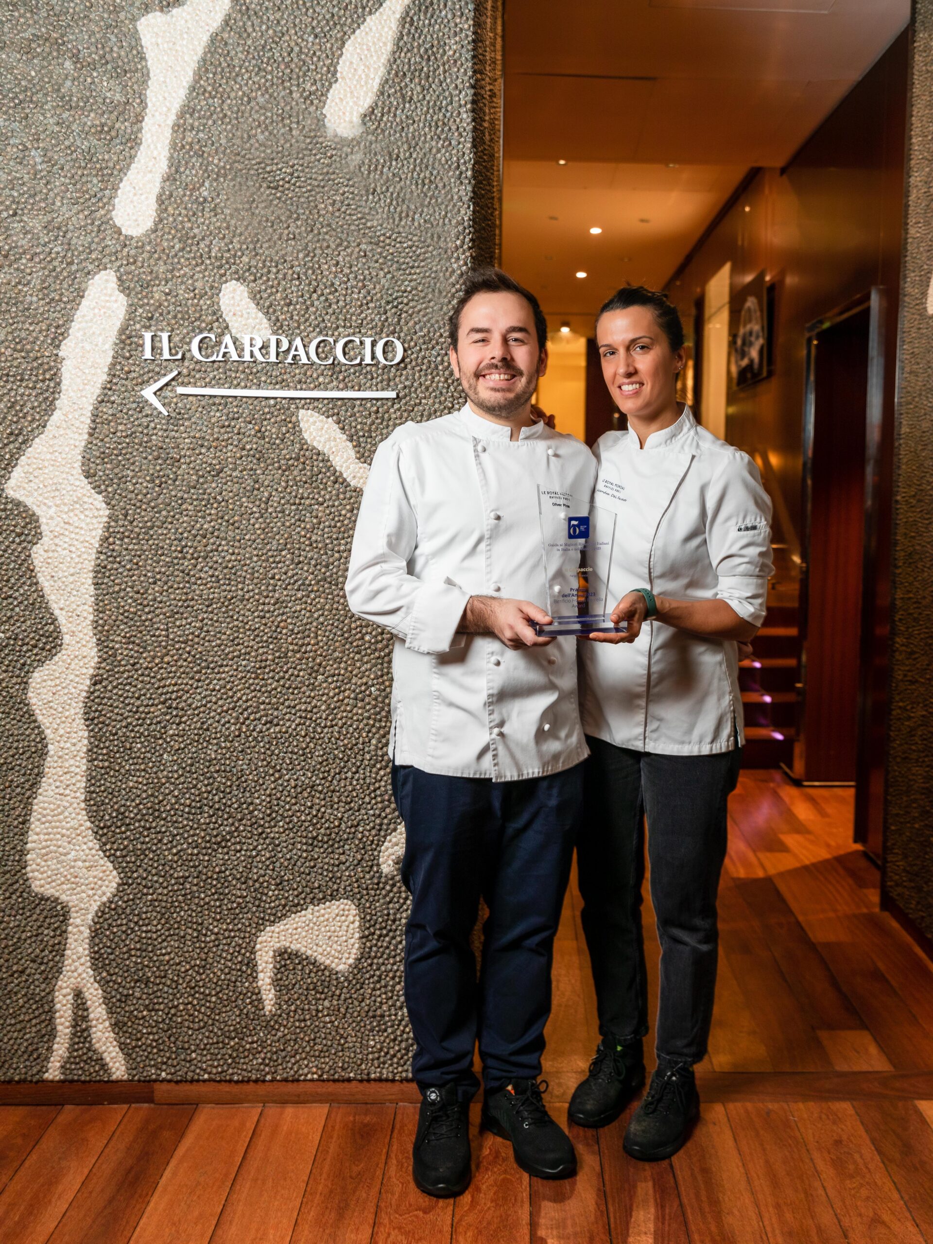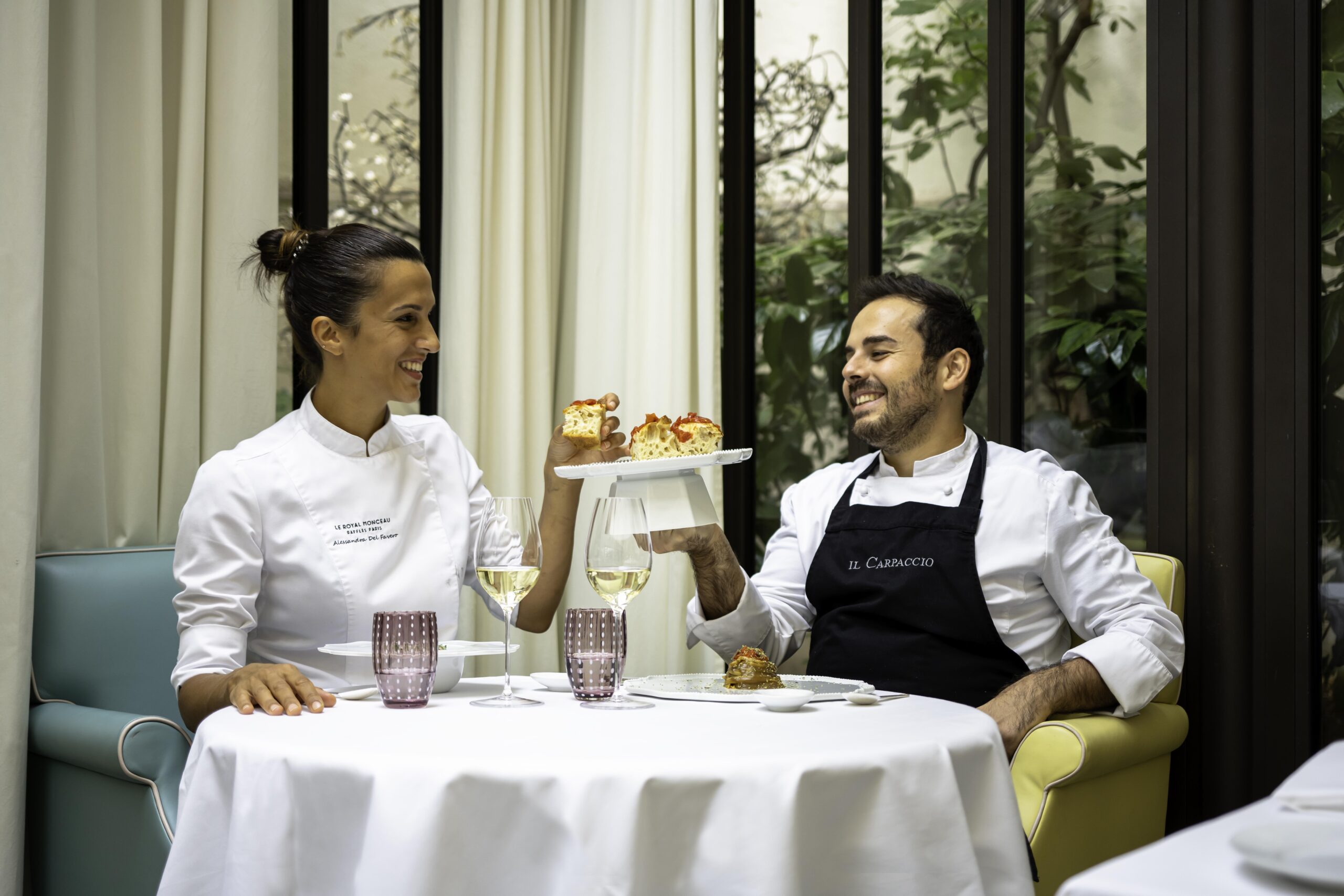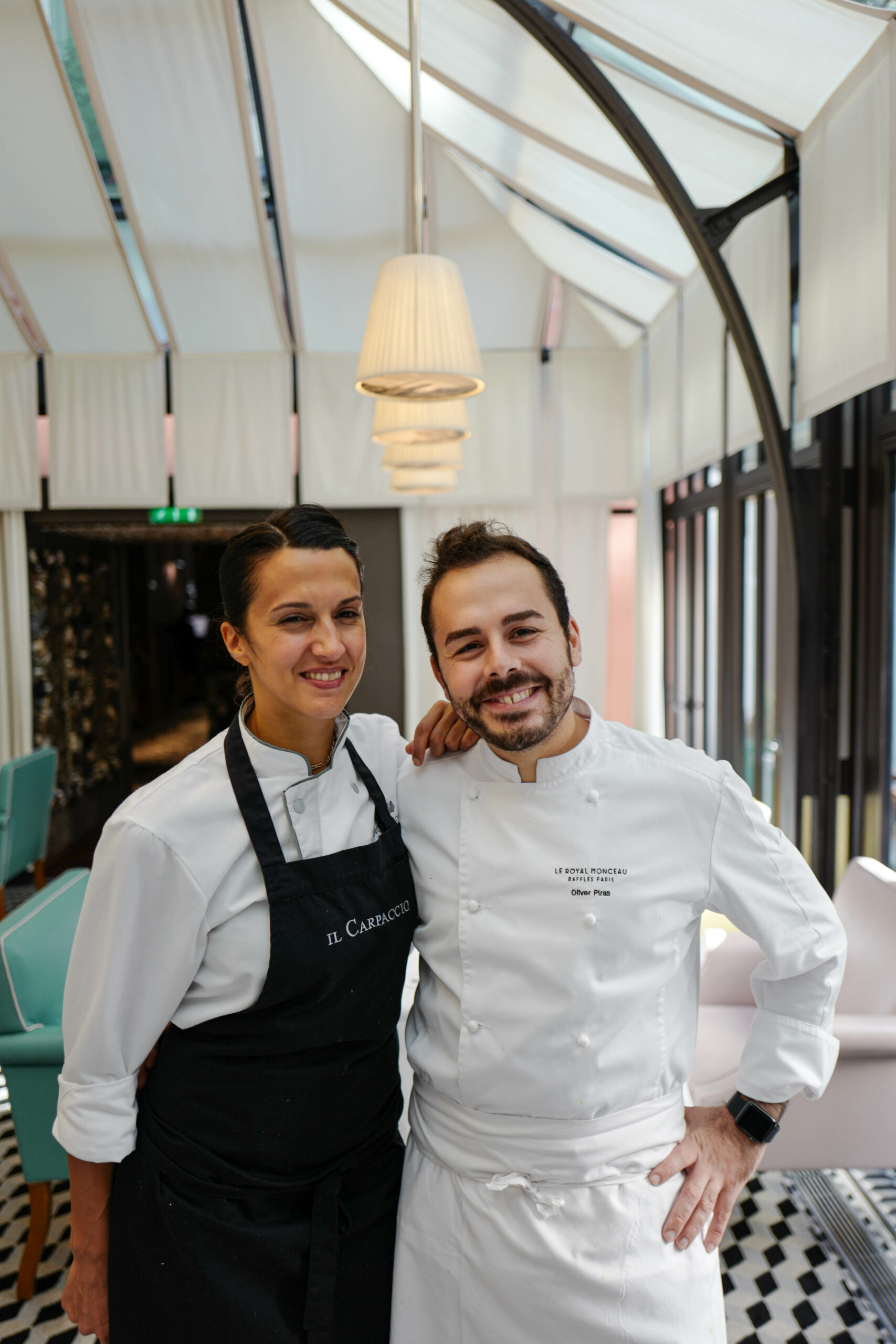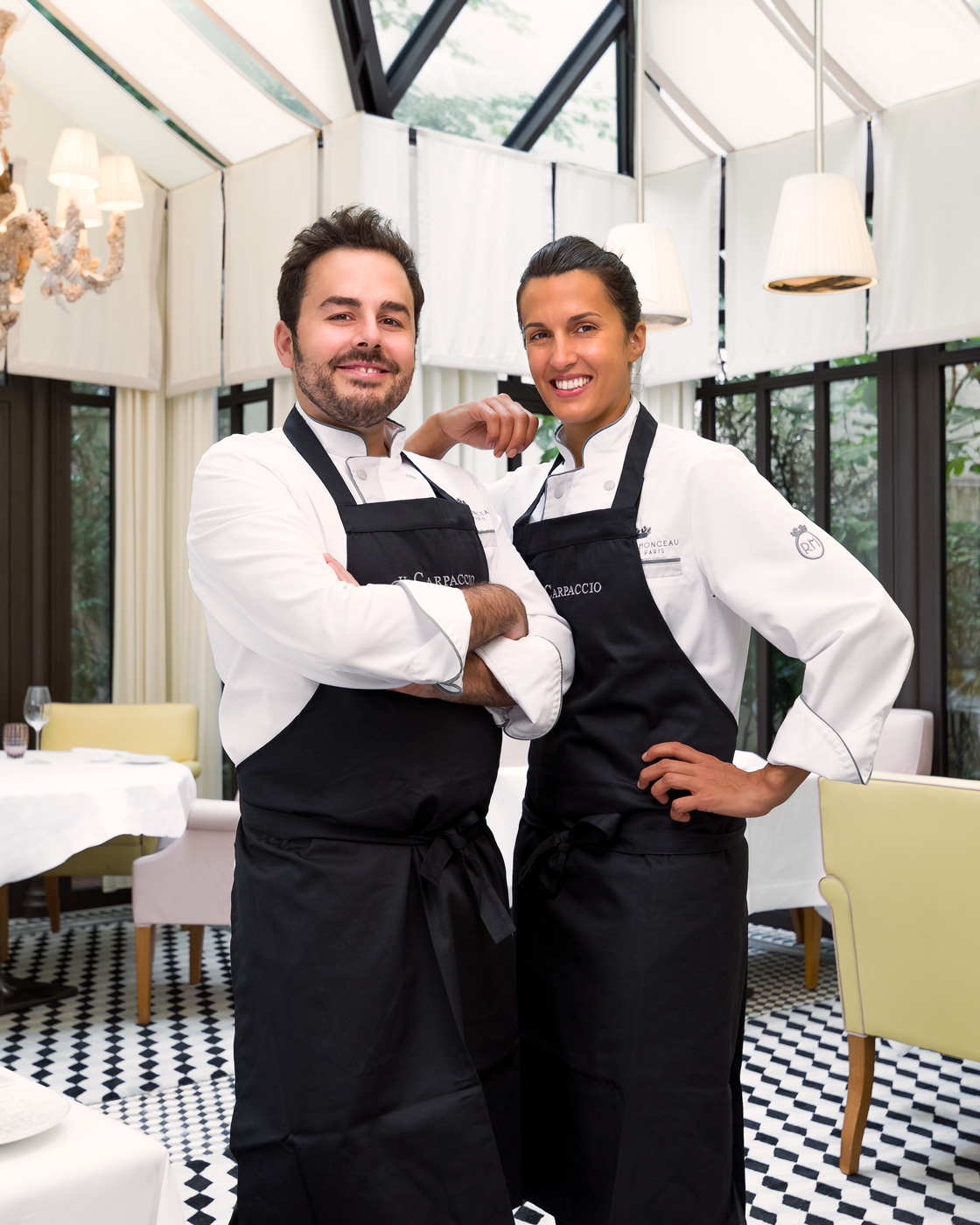 Alessandra Del Favero, née en 1988 en Vénétie, a obtenu son diplôme dans la célèbre école de cuisine à Alma, puis a approfondi ses connaissances culinaires dans l’hôtel de sa famille dans les Dolomites. Oliver Piras, né en Sardaigne en 1986, a vécu diverses expériences prestigieuses à travers l’Europe, notamment au Celler de Can Roca***, au Noma**, avec le Chef Alberico Penati et avec le Chef Joël Robuchon. Les deux chefs se sont rencontrés en 2012 au restaurant triplement étoilé Da Vittorio à Brusaporto, où leur passion commune pour la gastronomie les a rapprochés et c’est ensemble qu’ils ont décidé de relever le défi de rouvrir Il Carpaccio, le restaurant italien du Palace Le Royal Monceau – Raffles Paris. Leur cuisine italienne moderne, légère et travaillée avec des produits transalpins de qualité exceptionnelle, a su séduire les critiques