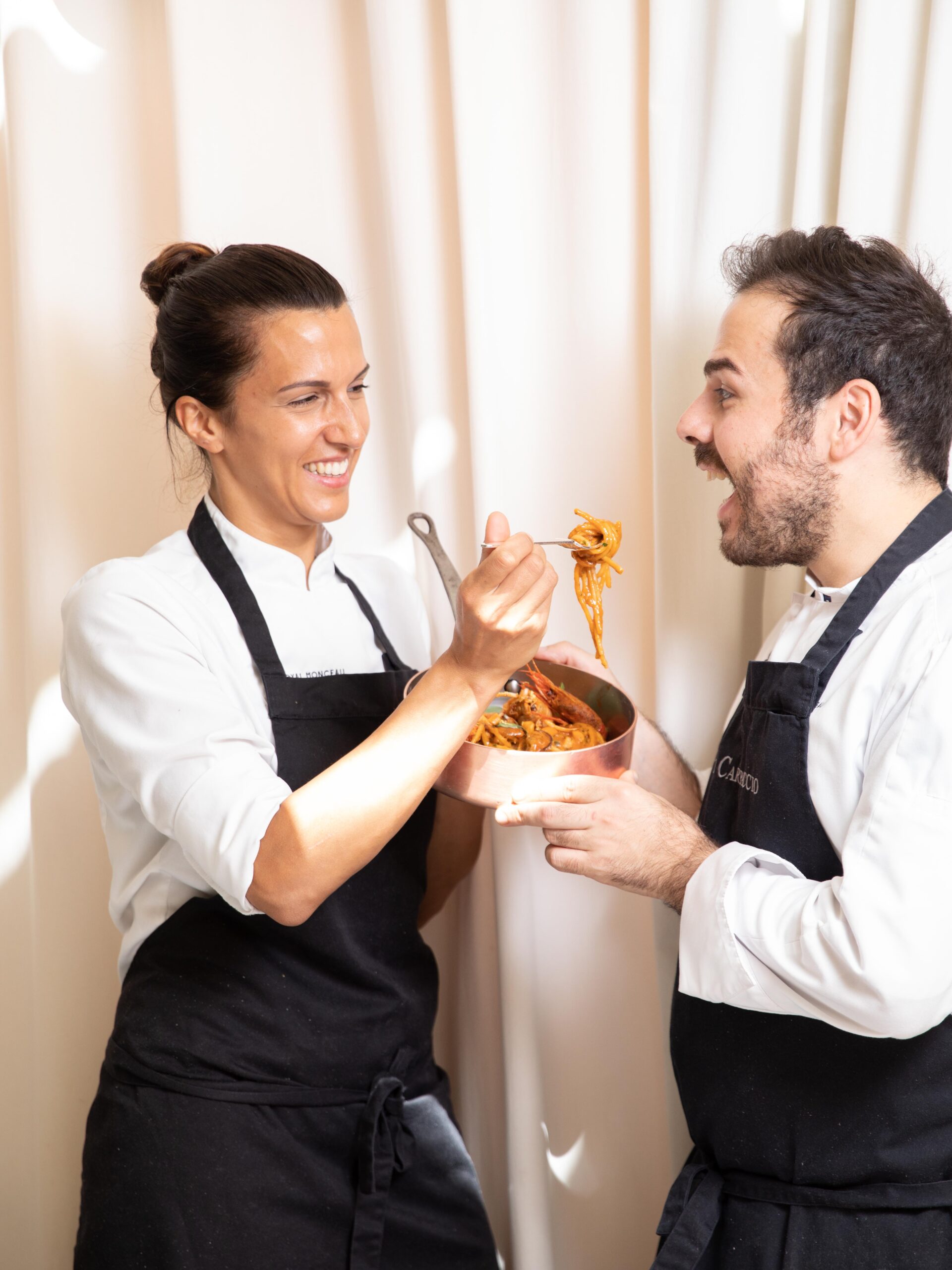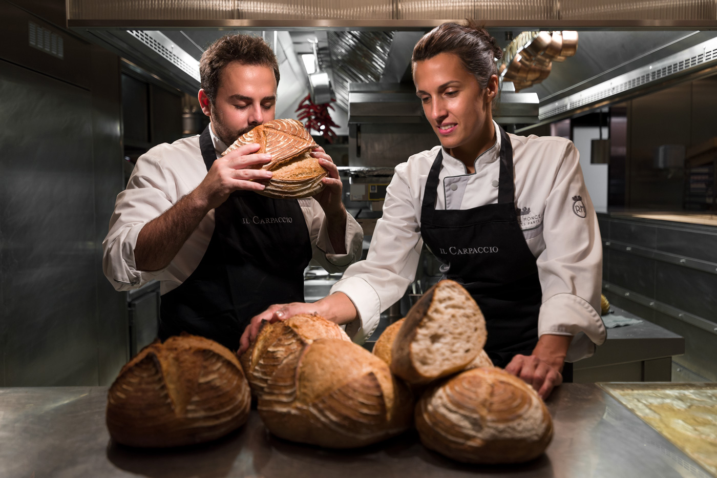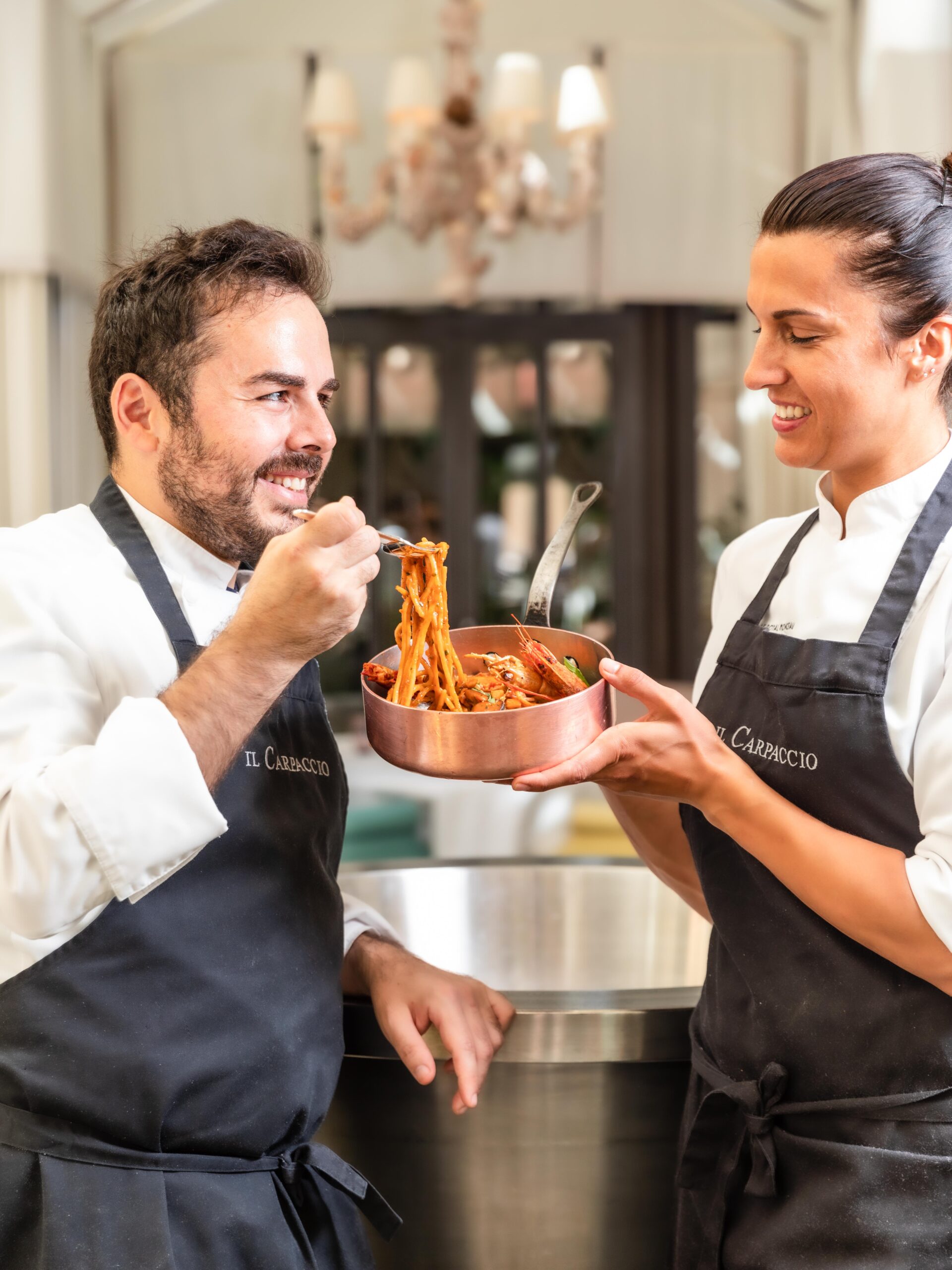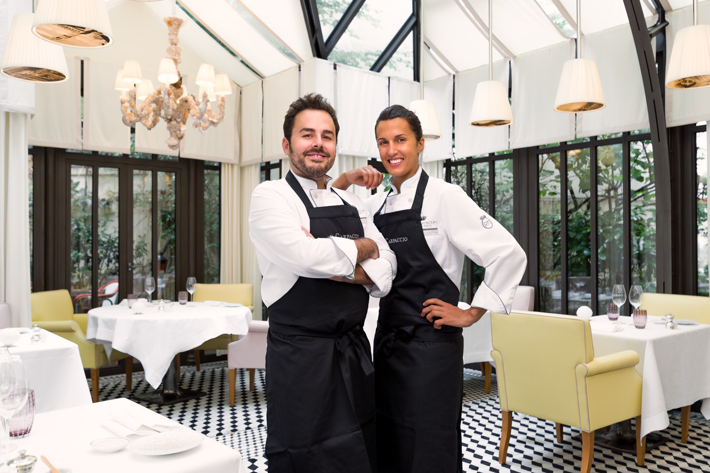 Alessandra Del Favero, née en 1988 en Vénétie, a obtenu son diplôme dans la célèbre école de cuisine à Alma, puis a approfondi ses connaissances culinaires dans l’hôtel de sa famille dans les Dolomites. Oliver Piras, né en Sardaigne en 1986, a vécu diverses expériences prestigieuses à travers l’Europe, notamment au Celler de Can Roca***, au Noma**, avec le Chef Alberico Penati et avec le Chef Joël Robuchon. Les deux chefs se sont rencontrés en 2012 au restaurant triplement étoilé Da Vittorio à Brusaporto, où leur passion commune pour la gastronomie les a rapprochés et c’est ensemble qu’ils ont décidé de relever le défi de rouvrir Il Carpaccio, le restaurant italien du Palace Le Royal Monceau – Raffles Paris. Leur cuisine italienne moderne, légère et travaillée avec des produits transalpins de qualité exceptionnelle, a su séduire les critiques